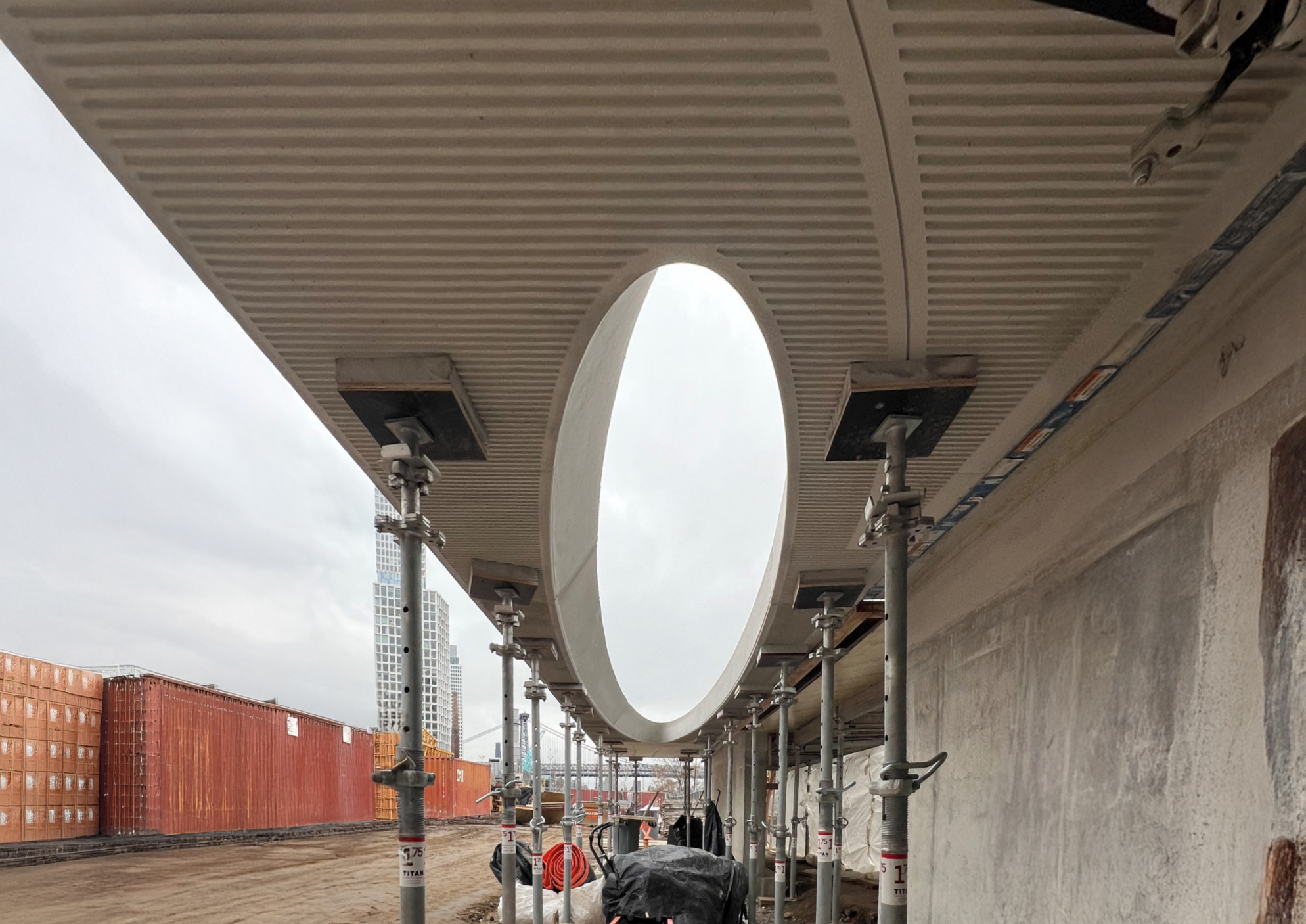 Seen here is a mock-up of the seven-foot-wide balconies that wrap the entirety of both towers. The balconies are perforated with large ovals in a staggered pattern, offsetting those on the floors above and below. The ovals’ geometry—and the four-foot-tall, sinusoidal glass guardrails that undulate between them—force occupants to the window wall as they approach their neighbors’ units, maintaining privacy without a screen that would obstruct views of Manhattan and preserving interior light levels. The staggered elliptical pattern will create remarkable light phenomena across the towers’ surfaces.