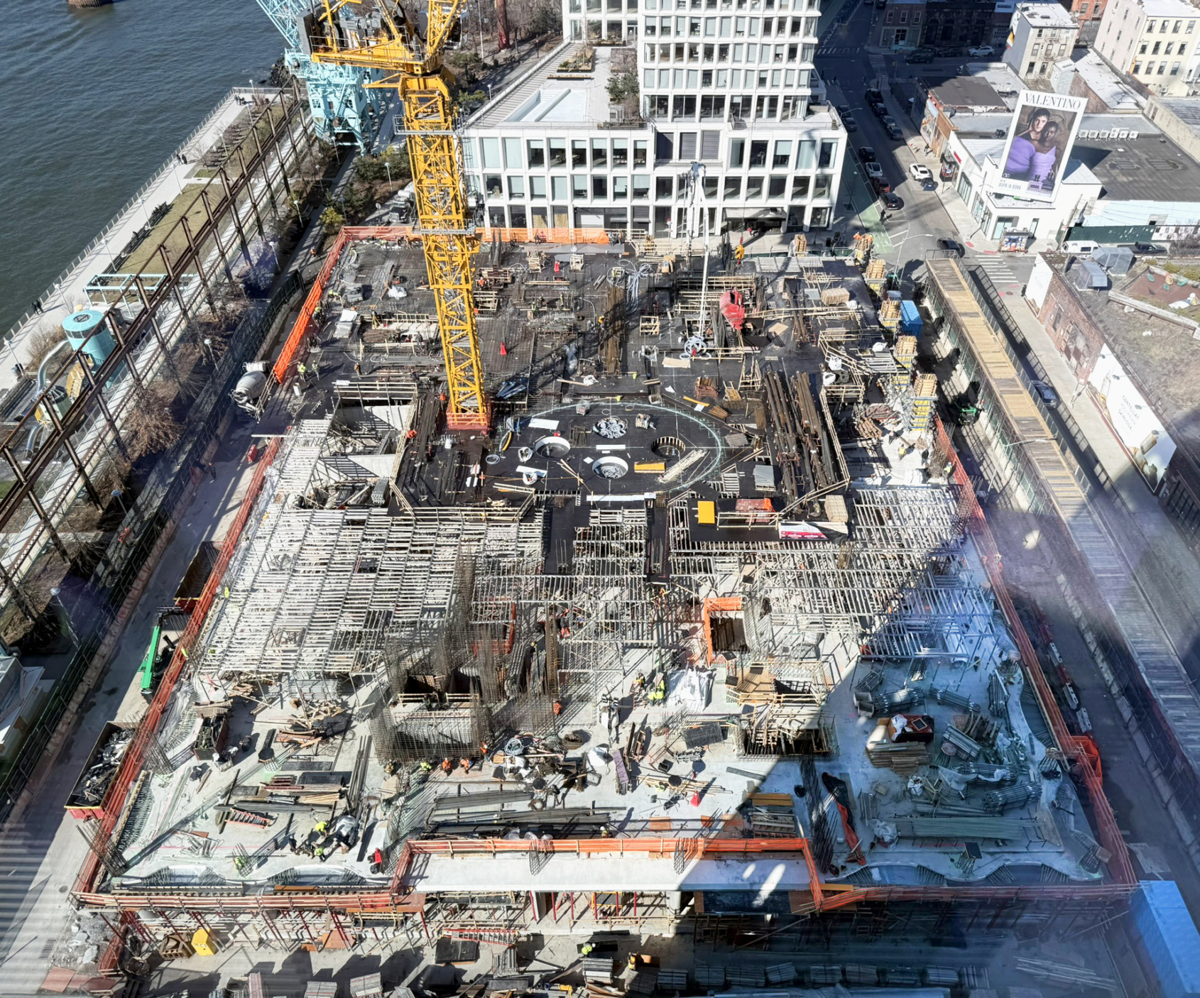 - Progress on the three-story podium spanning River St and Kent Ave, including the rough out of the oval courtyard penetrating a large amenity terrace between the two towers.
