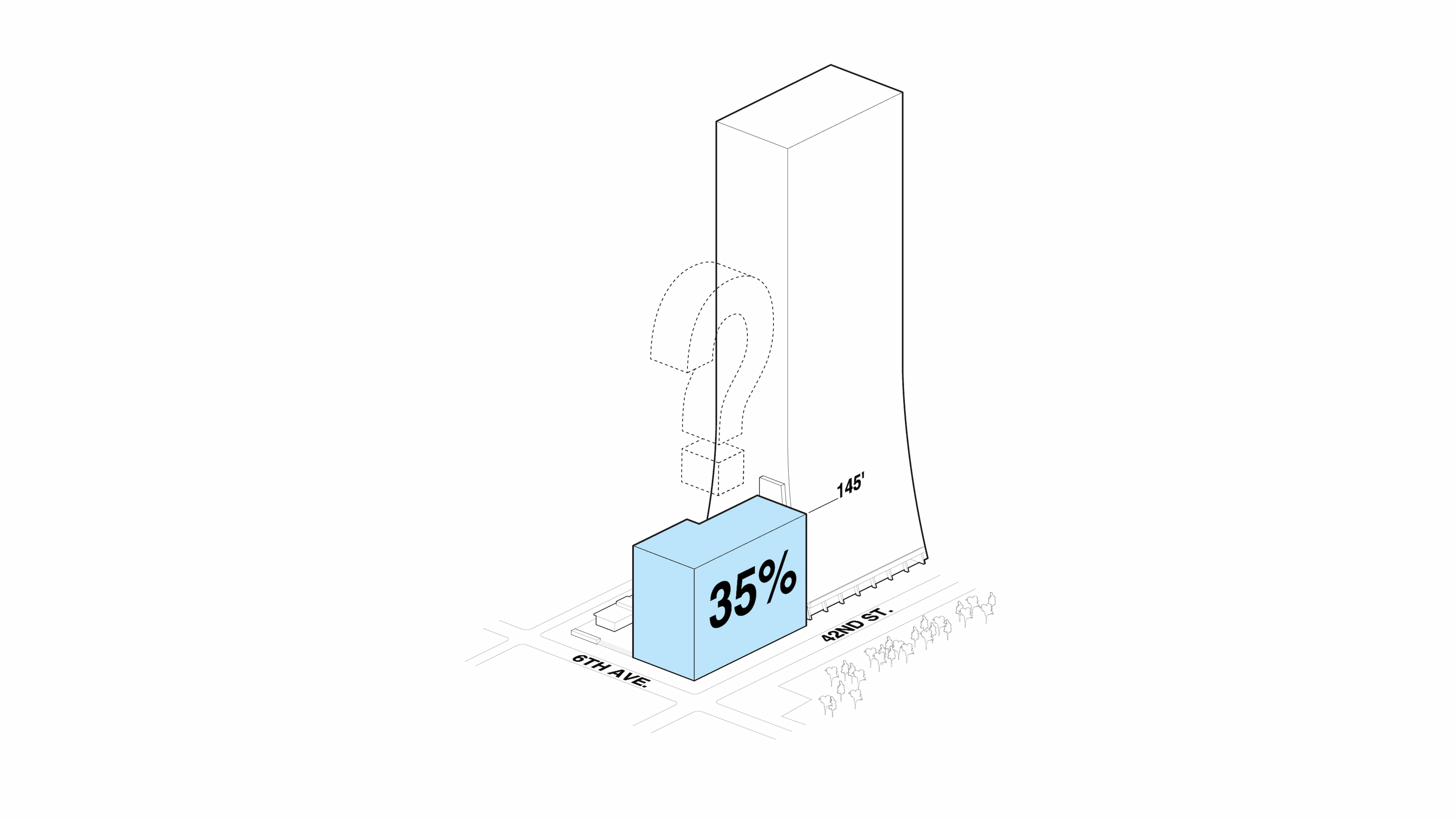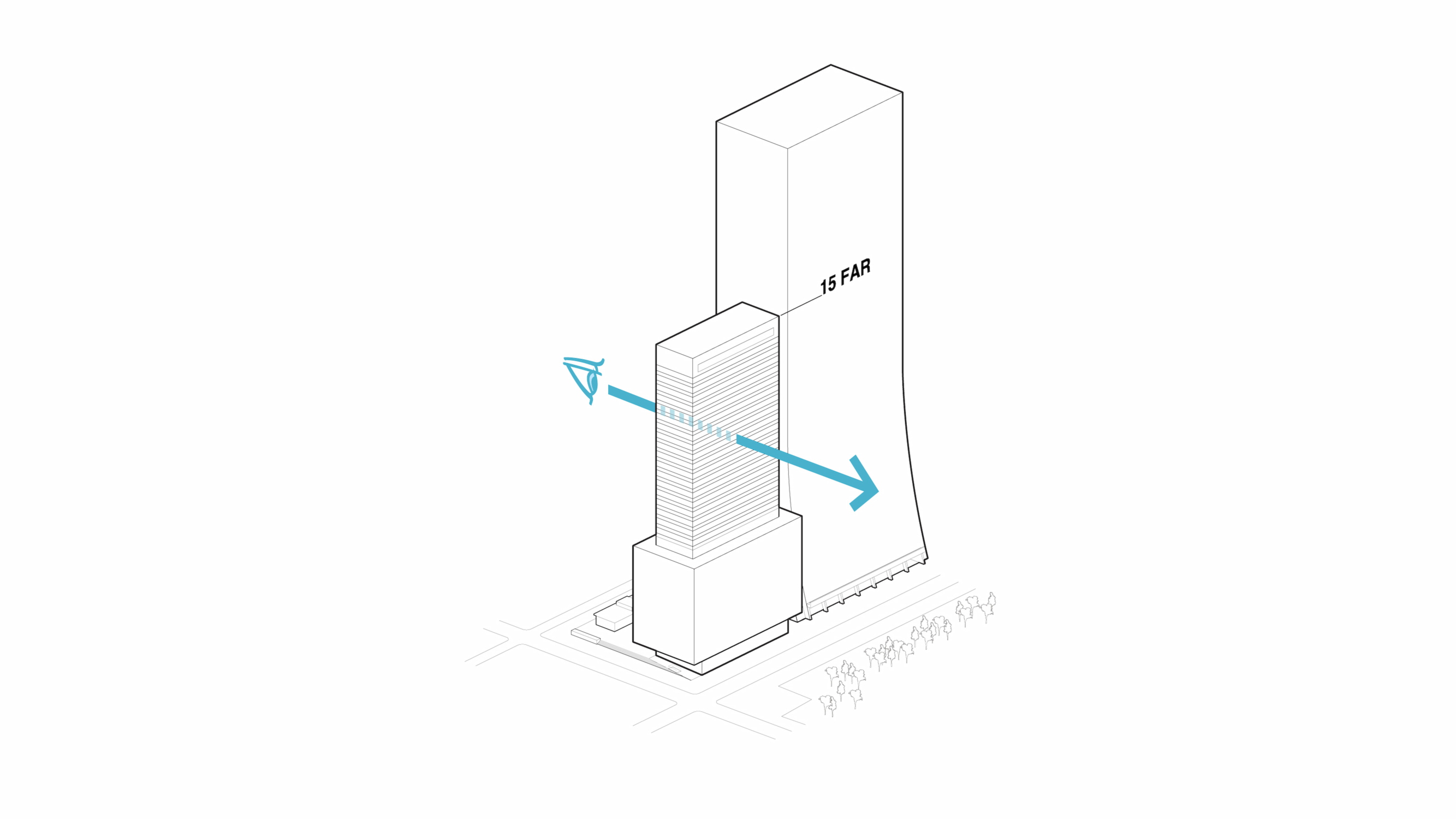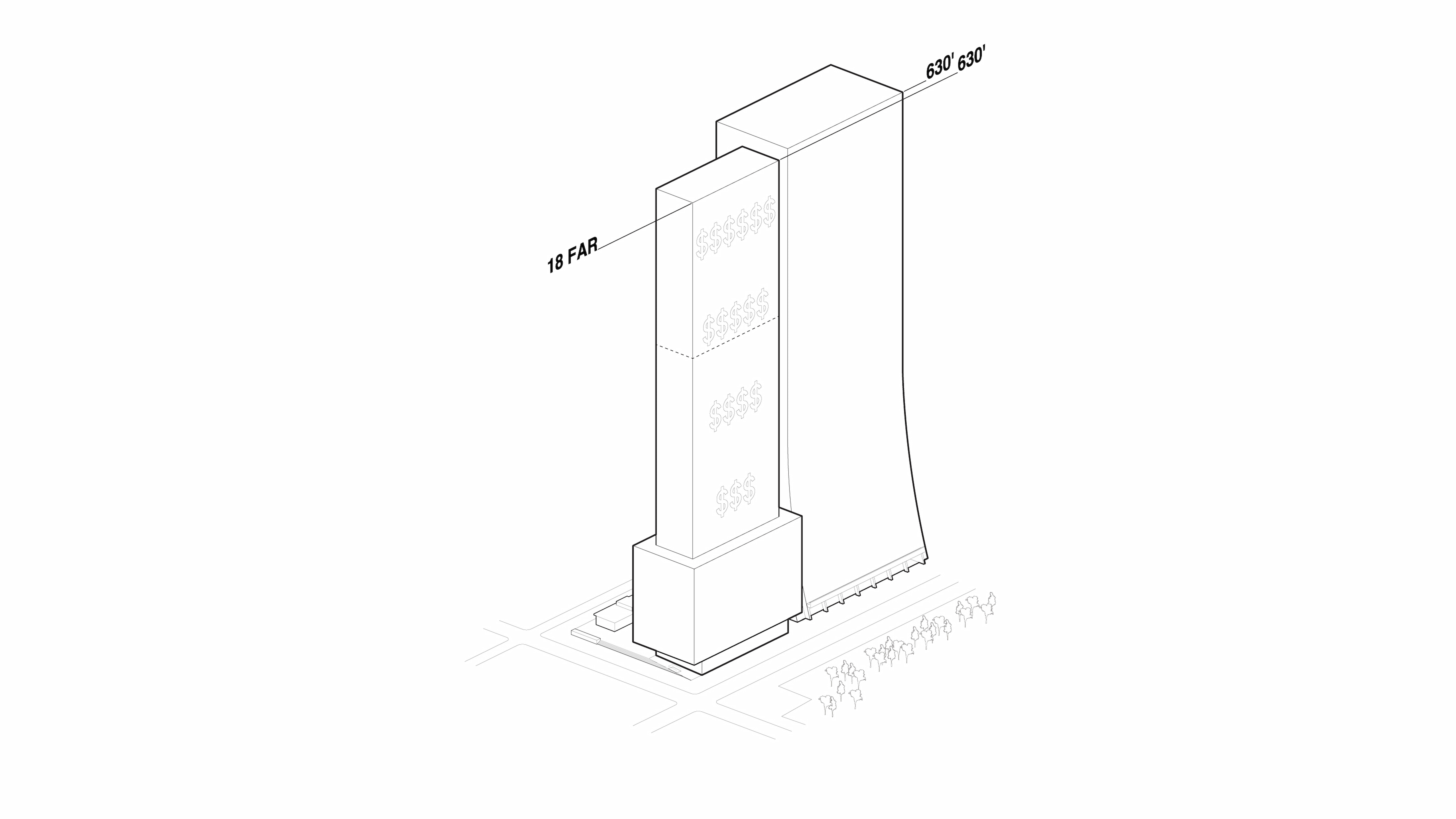 To maximize the leasable area below the zoning limit of 150 ft, a full-site podium is inserted onto the plot. With floorplates of 18,500 sf GFA, the podium provides large-block, contiguous office space suitable for a big anchor tenant. Accommodating 35% of the building’s allowable area within as big a mass as possible liberates the opportunity for an exceptional office tower above.