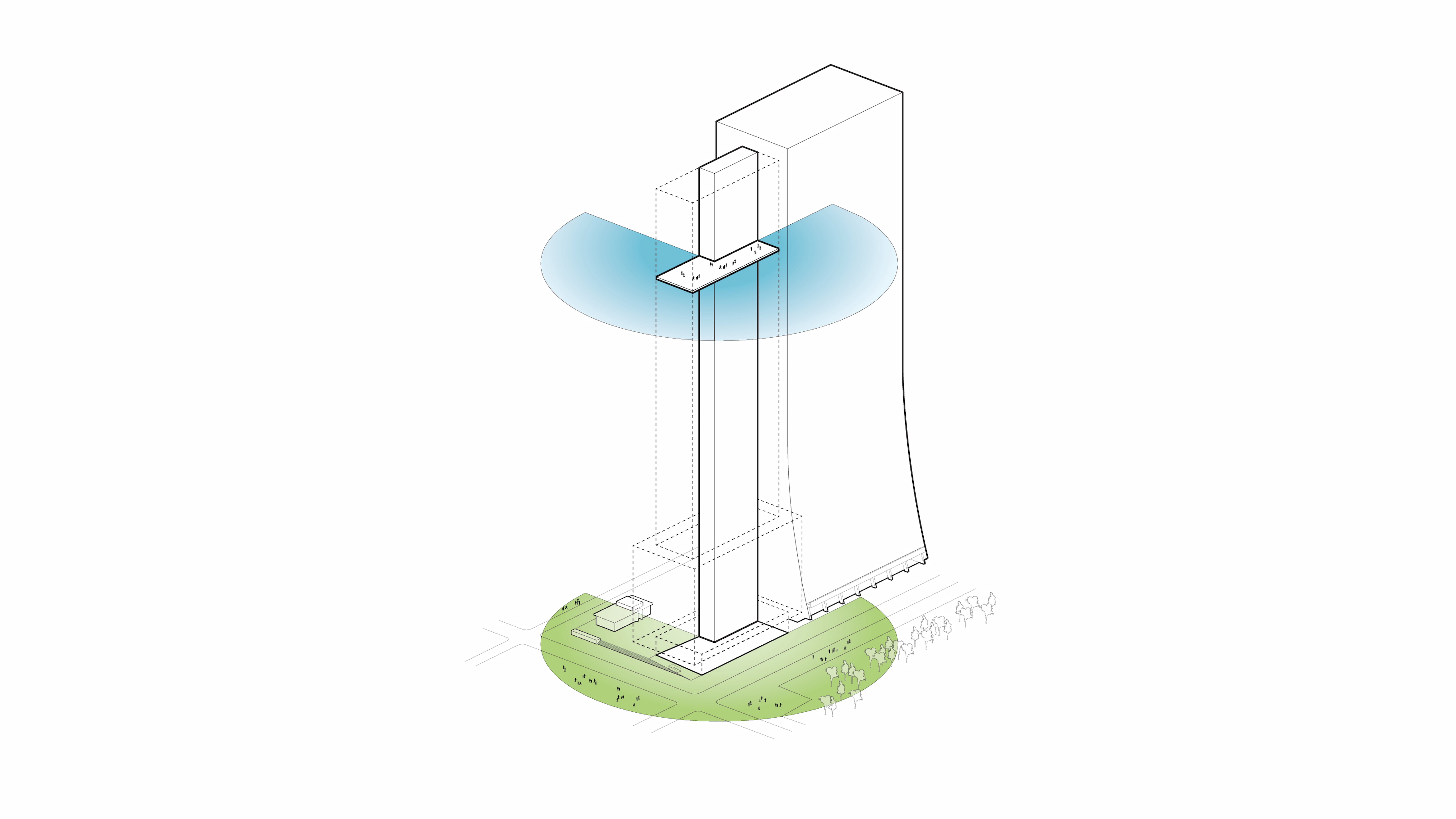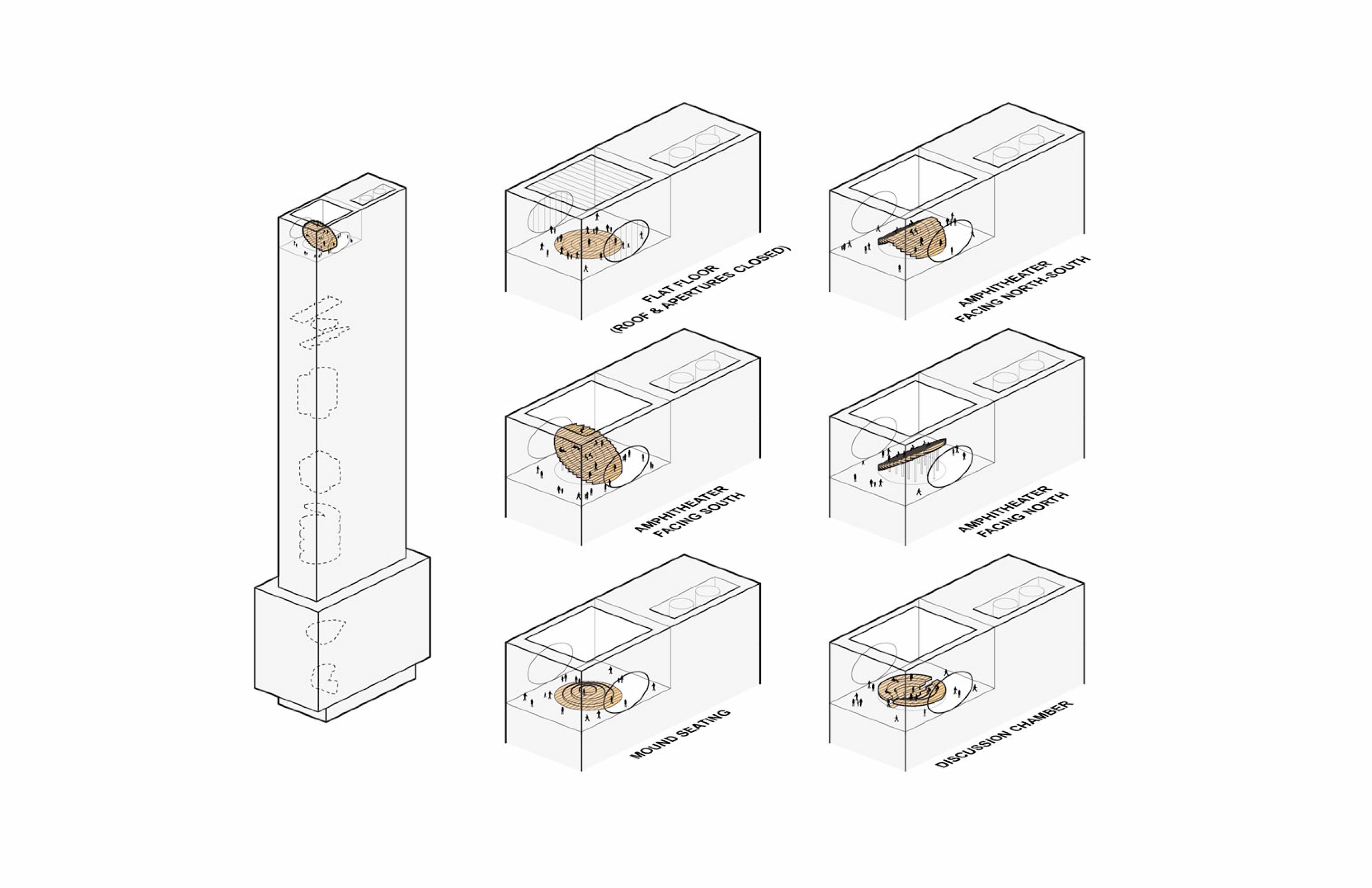 Capping this vertical shaft of flexibility is the only built-in signature moment: an oculus with a double-height roof terrace that looks out over the entirety of Manhattan; it is the ‘starter element’ for the cascade. At its center is a round tribune—composed of variable-height lifts—that can assume multiple geometries: a flat event space; an amphitheater raked to face north, south, or north and south; a playful ‘mound’ for lounging; or a discussion chamber.