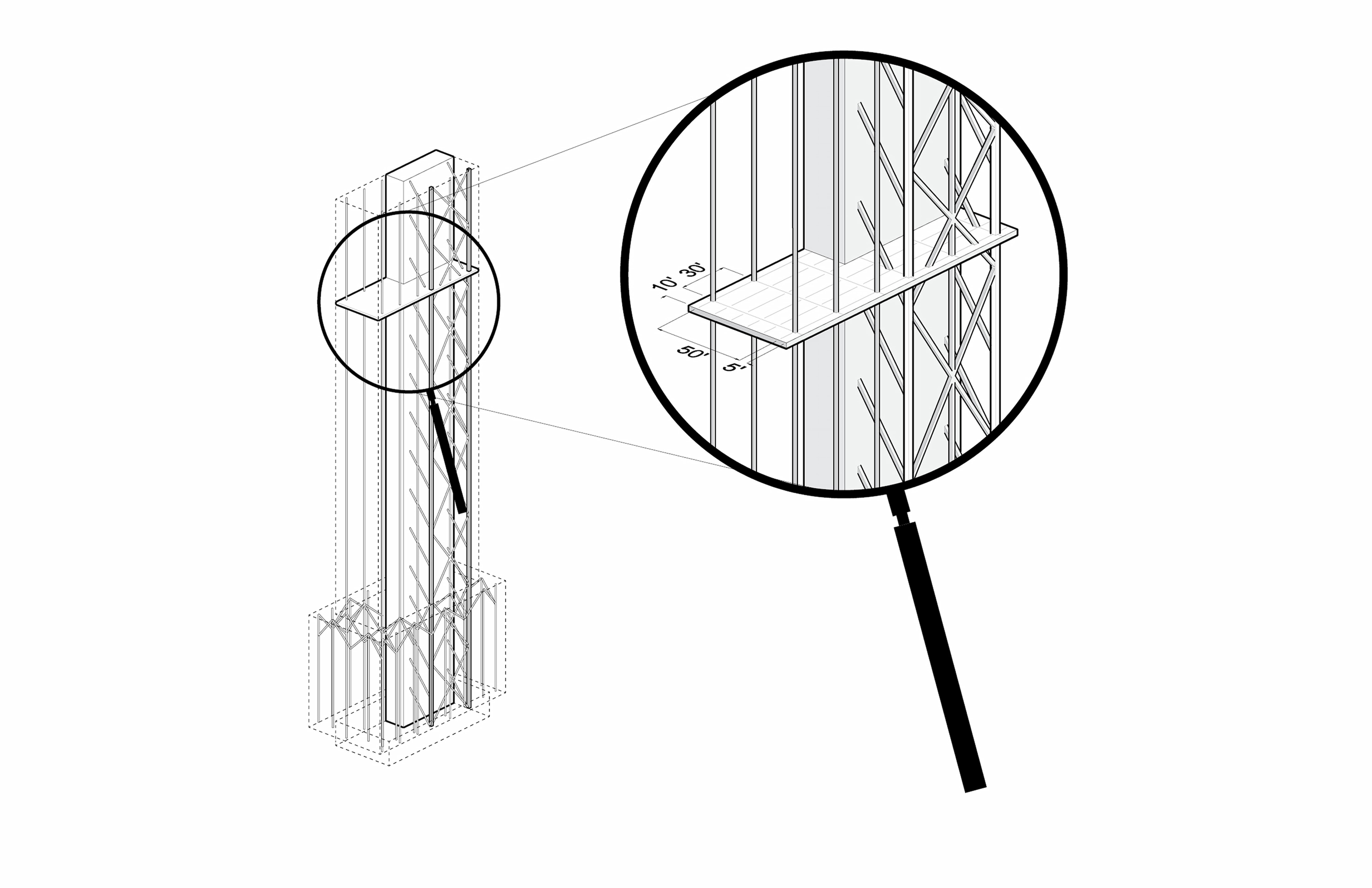IIᴑᴑ’s structure makes efficient use of materials to minimize its sizing and maximize sightlines. Columns are organized every 30 ft in the east-west direction and 50 ft apart in the north-south direction, to create a large, column-free zone through the tower’s center. All columns are held 5 ft off the north and south façades and 10 ft off the east and west façades to unencumber lines of vision. Furthermore, columns in the tower’s western half, where views are most significant, are of minimal size.
