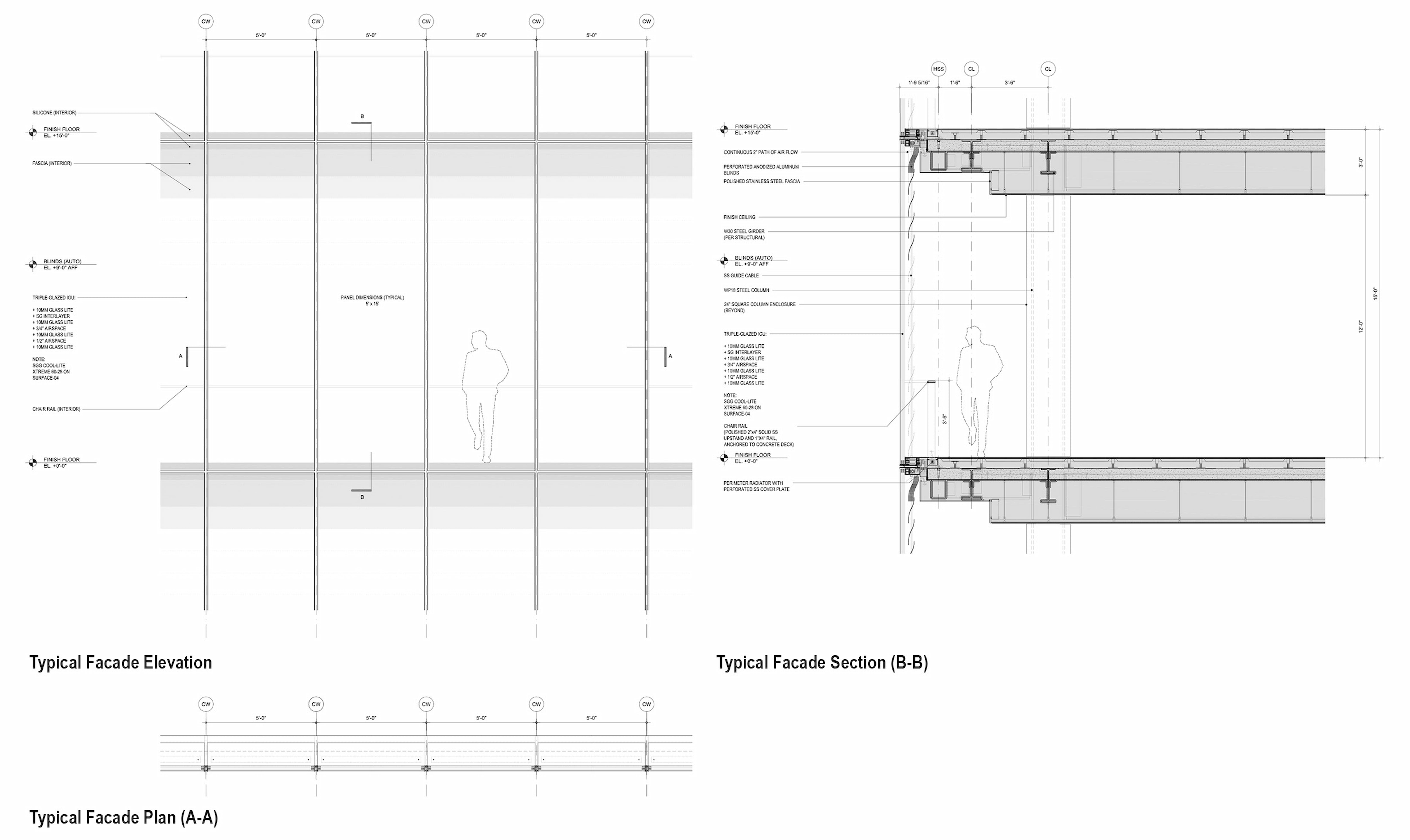 The first two floors of the podium are composed of 10 ft-wide, clear glass (71% VLT) façade panels conducive to retail display. The remaining podium and all tower floors are organized on a 5 ft module ideal for office planning.