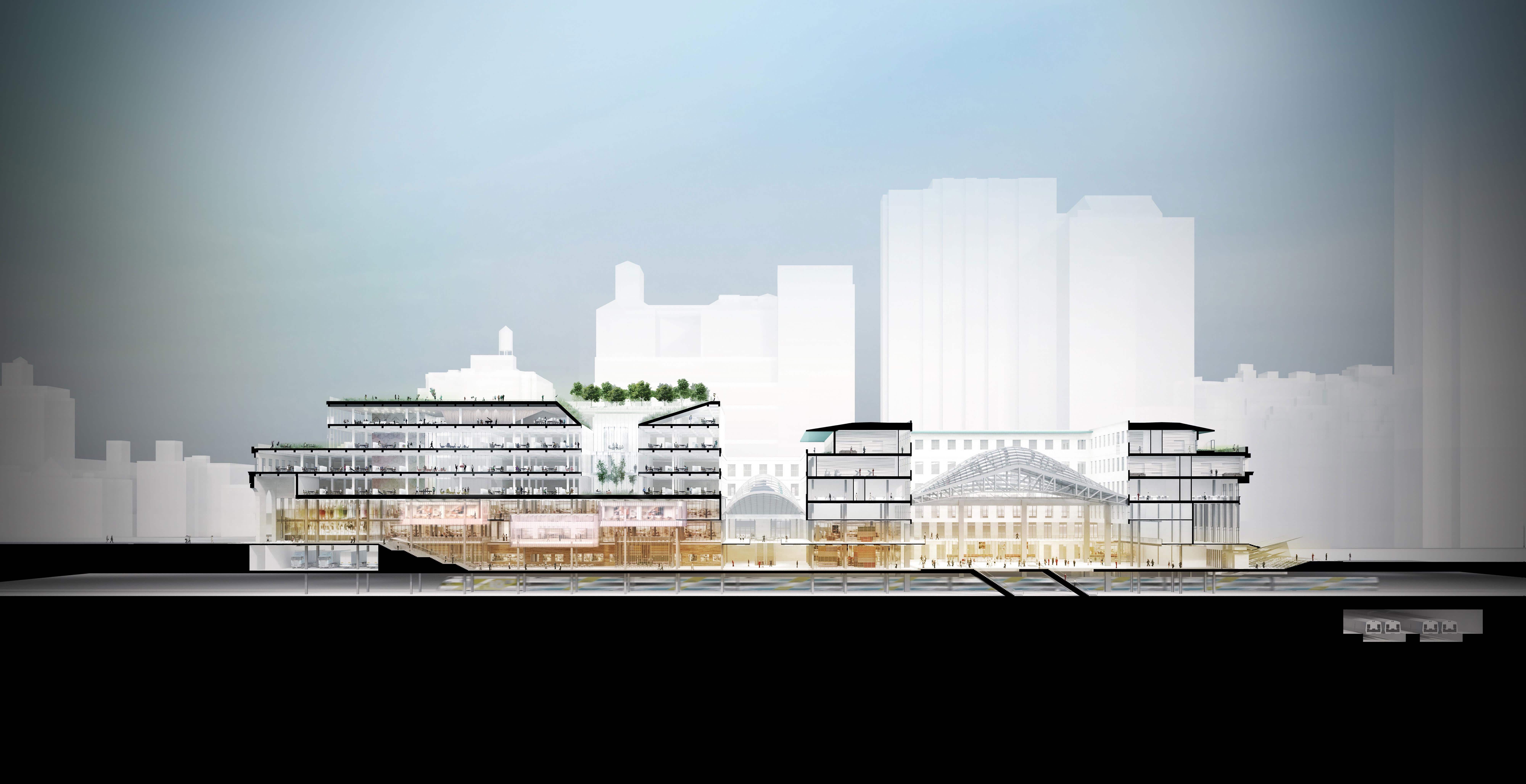 Section through the Farley Building (right) and Farley Annex (left), depicting the proposed redevelopment of both buildings by SOM (new train hall, boutique hotel, and at-grade interventions in and around the Farley Building), S9 Architecture (multi-story retail corridor spanning the base of both buildings), and REX (‘The Highgarden’ and four floors of flexible office space in and atop the Annex)