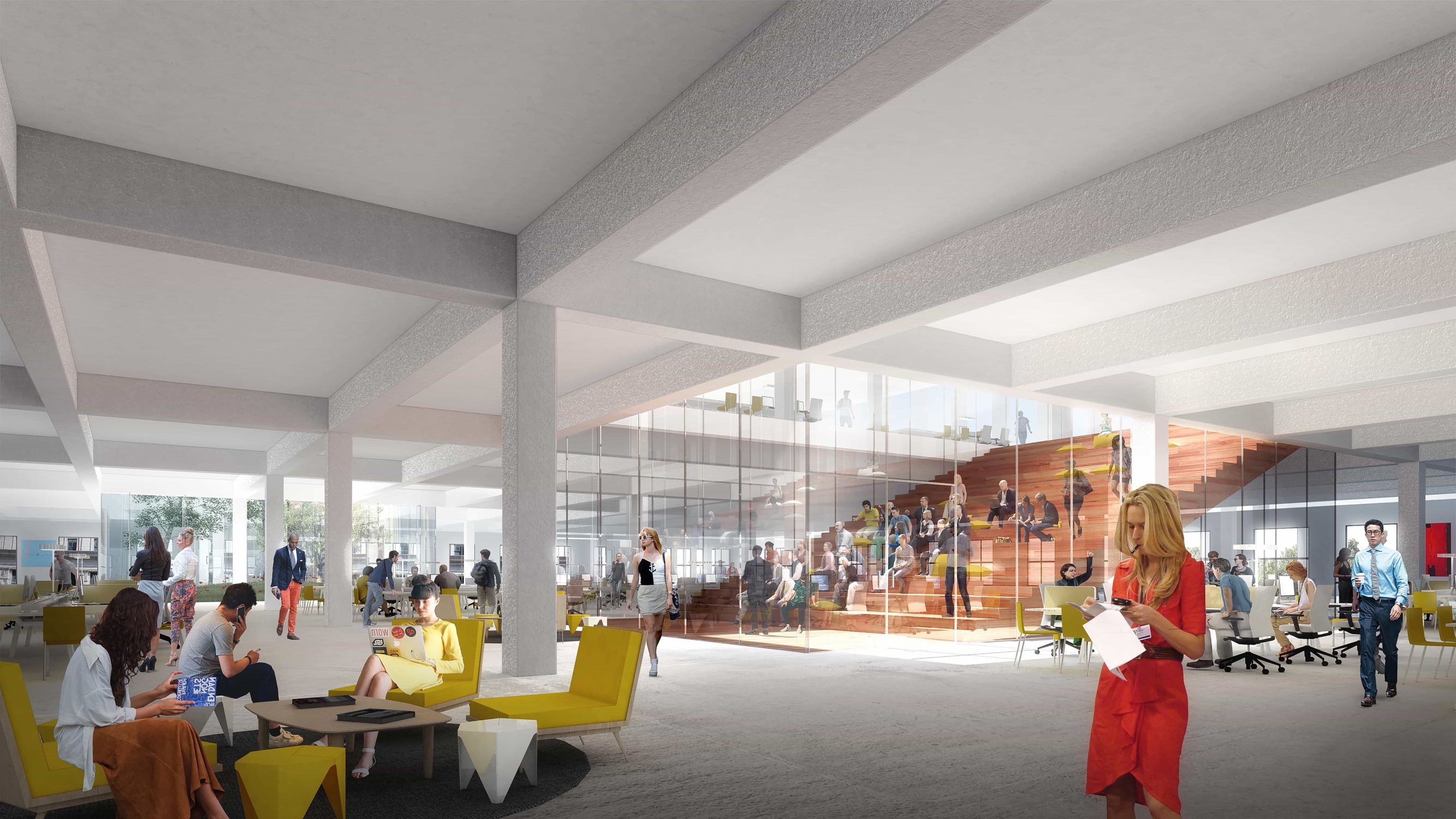 The four floors of repurposed office space can be leased to a single tenant, or to a variety of smaller tenants, attracted to the dynamism inherent in a mixed-use building. They remain flexible enough to accommodate a variety of working and creative communities, organized in any layout from traditional office to ‘future workplace’ that provides for major collaborative spaces, amenity zones, and densely packed ‘hot-desking’ workstations. The light wells not only help to brighten and humanize the massive floor plates, but also facilitate spatial organization, organically encouraging communities to create around and in between them. They can also provide interconnection between floors or can function as informal meeting spaces, an auditorium, or a venue for yoga classes.
