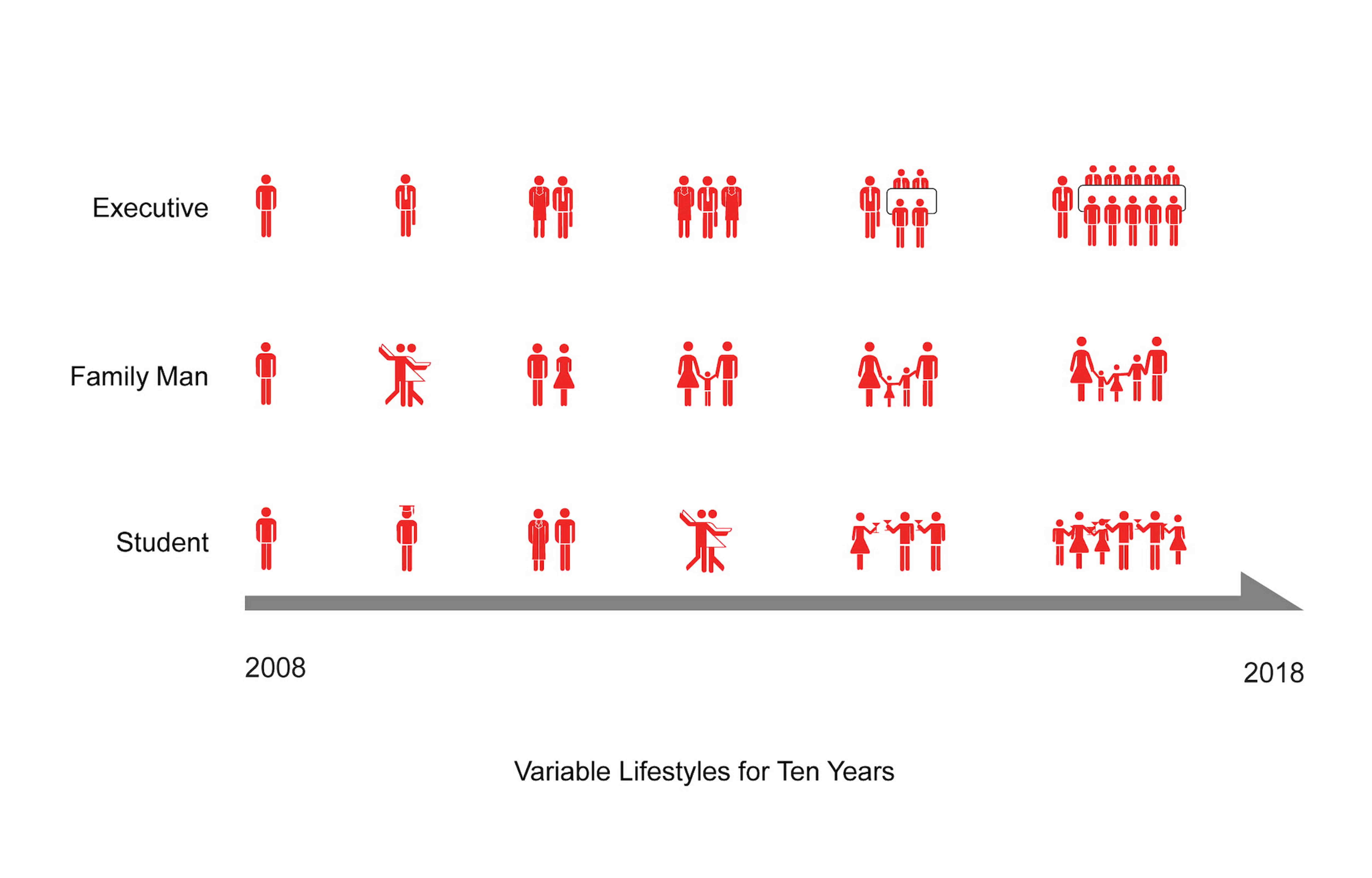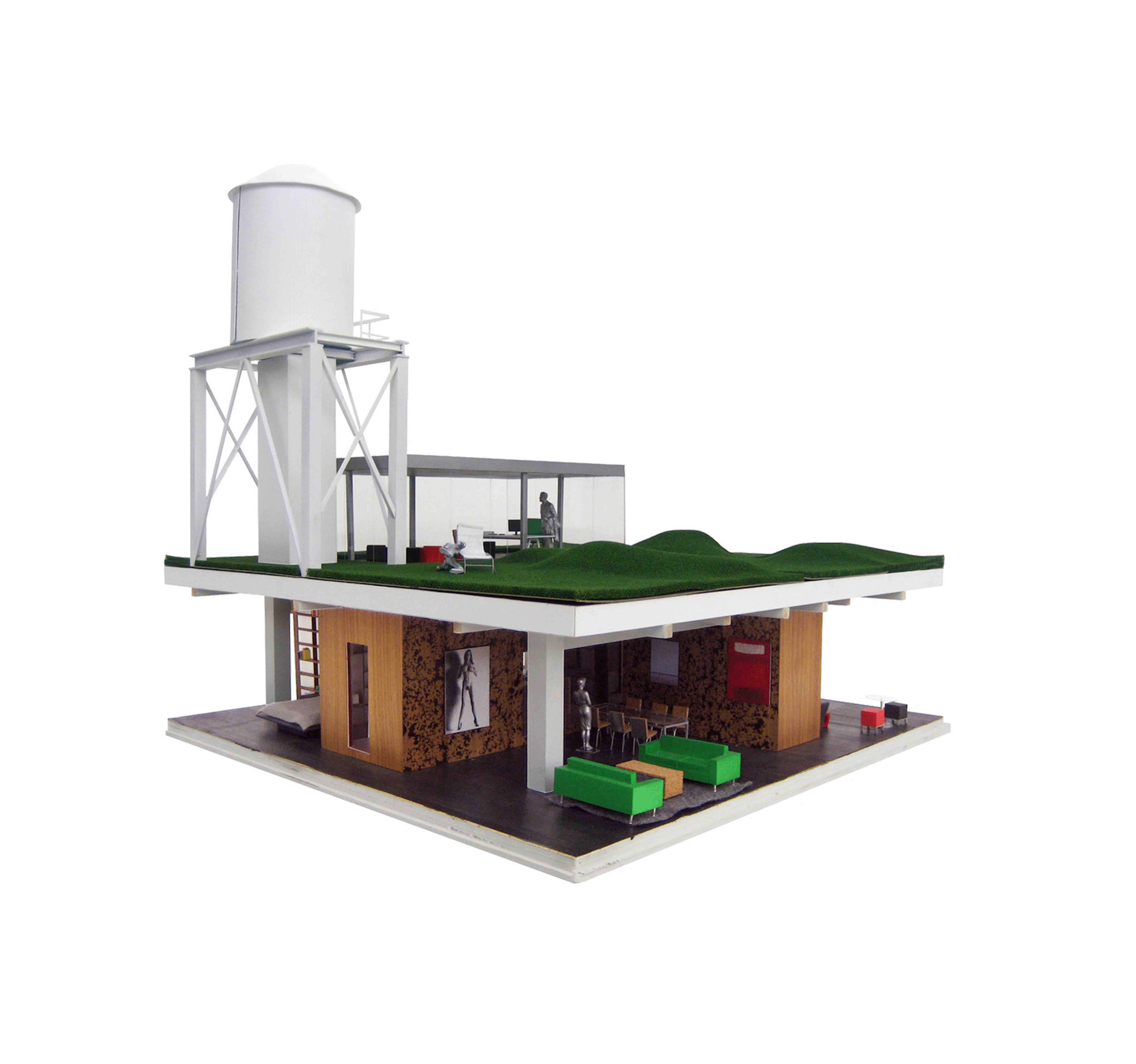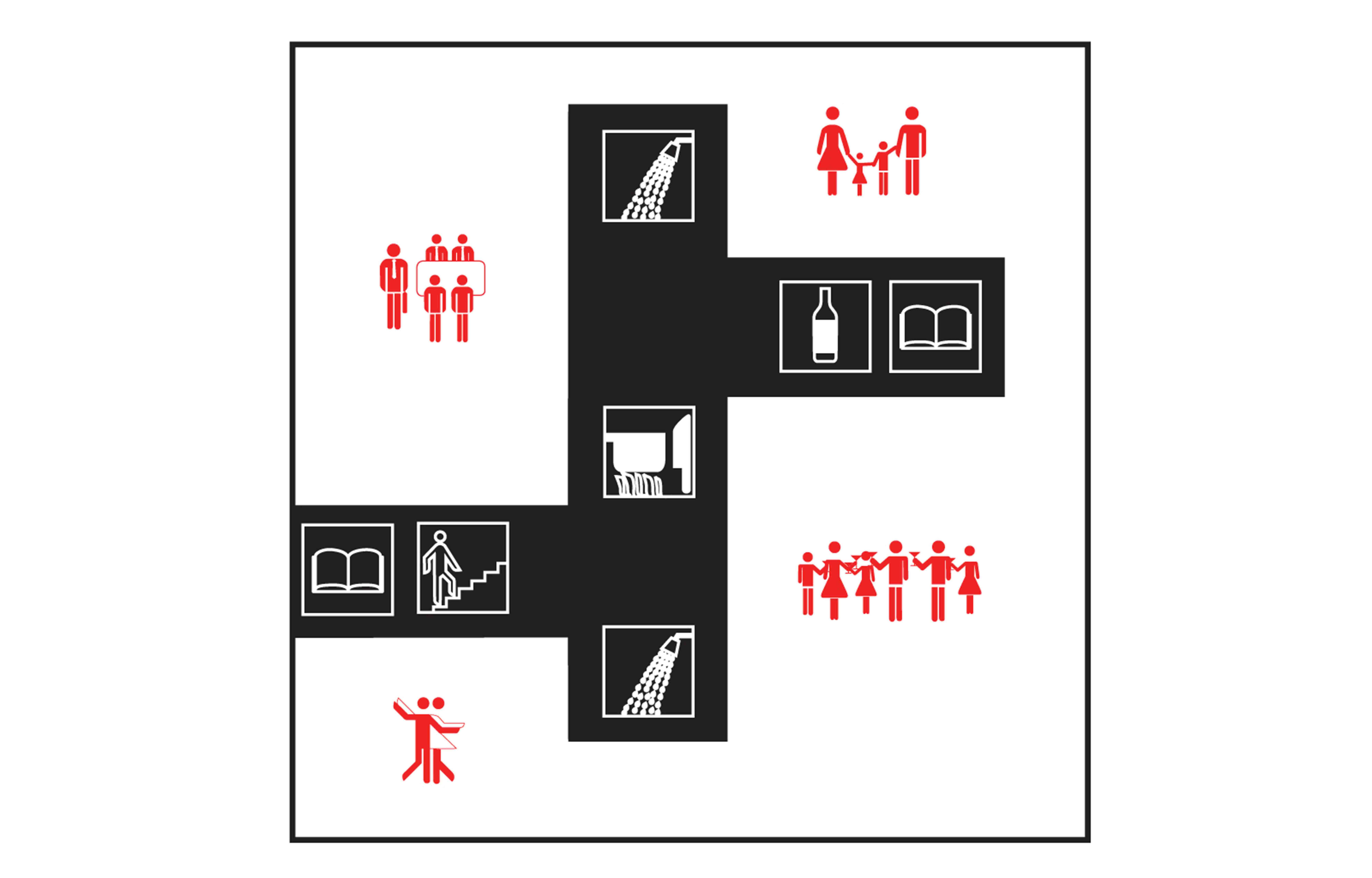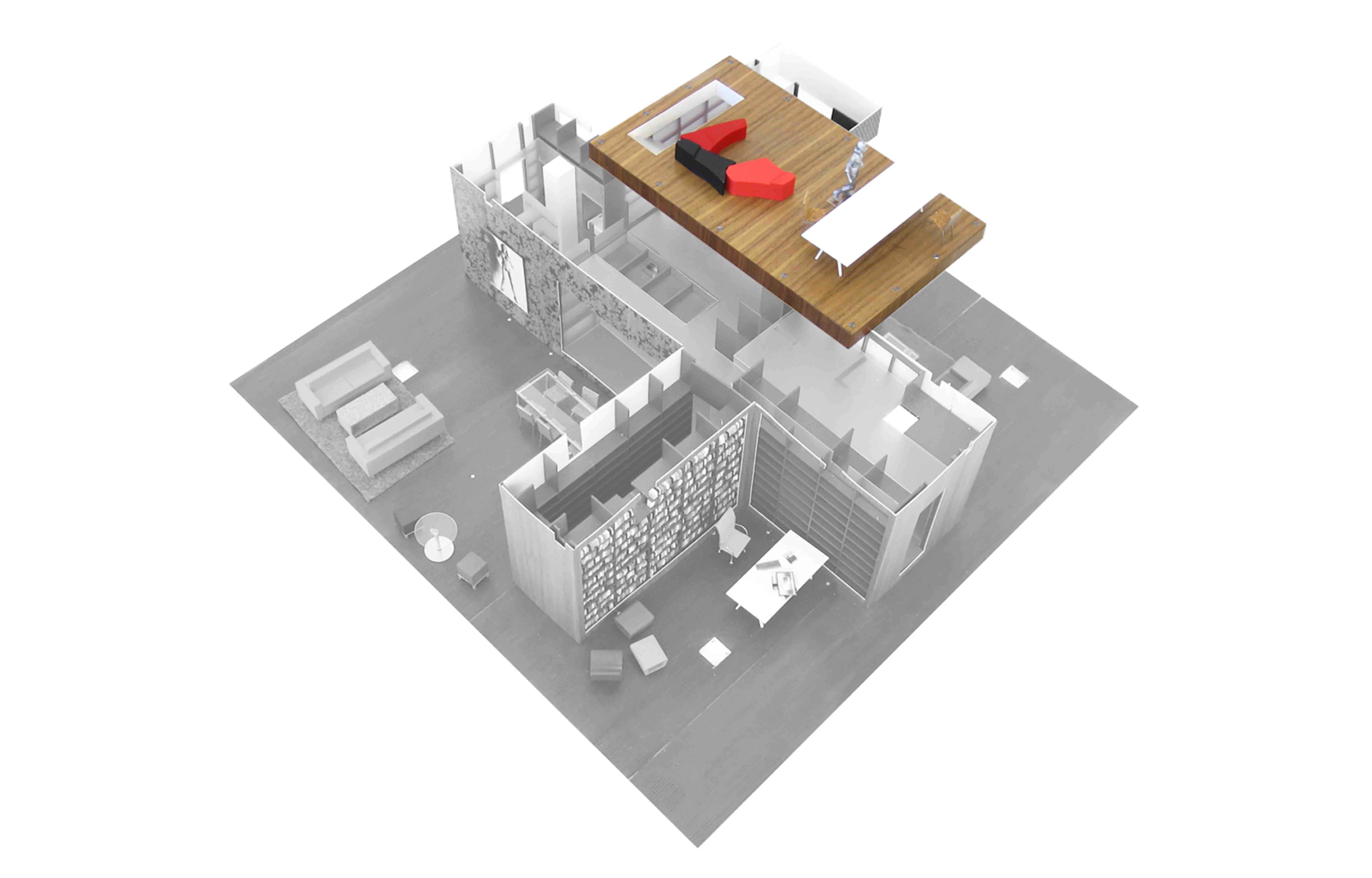 By inserting a single object into the 48’ x 48’ space, the apartment is divided into rooms with distinct character, but whose uses are not fixed. This object makes essential daily service spaces—such as the kitchen and bathrooms—easily accessible from all points in the apartment, allowing the owner to re-configure the four surrounding living spaces at will.