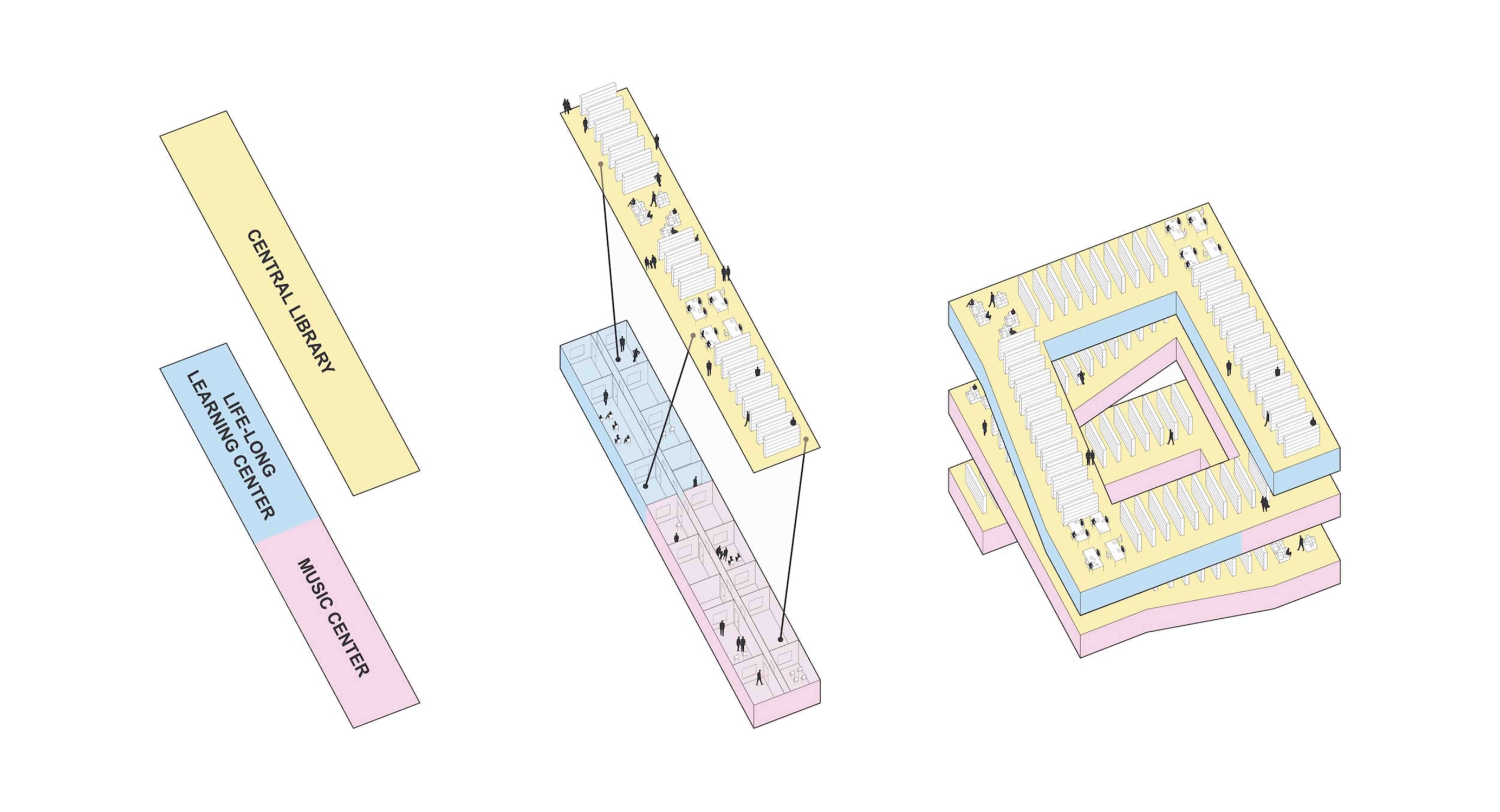 The functions of the Central Library, the Life-Long Learning Center, and the Music Center are grouped into two halves. These halves are layered into a single, linear educational “Ribbon.” Each half is architecturally equipped with its own form of bespoke flexibility such that it can evolve without detriment to the other half. The Music and Life-Long Learning Center functions—such as classrooms, meeting spaces, offices, and auditoria—are organized within the Ribbon’s interior, and can be reassigned as the two institutions’ needs change. The Central Library’s public space and book stacks form the Ribbon’s rooftop, and can be wholly reconceived as necessary.