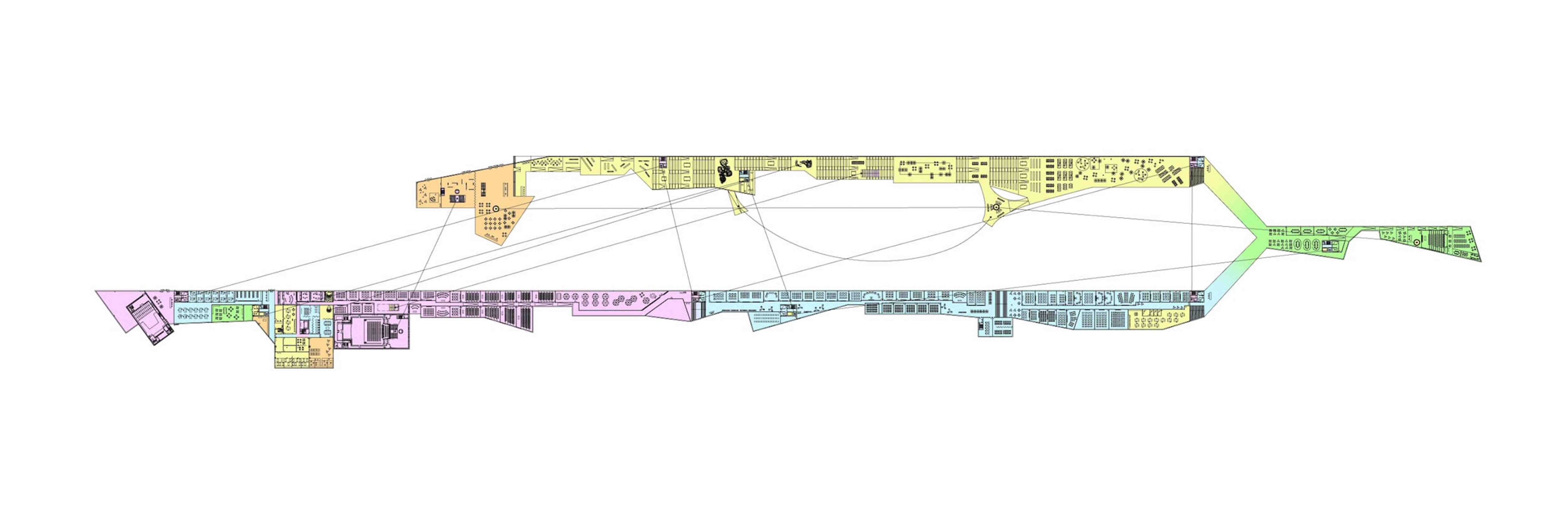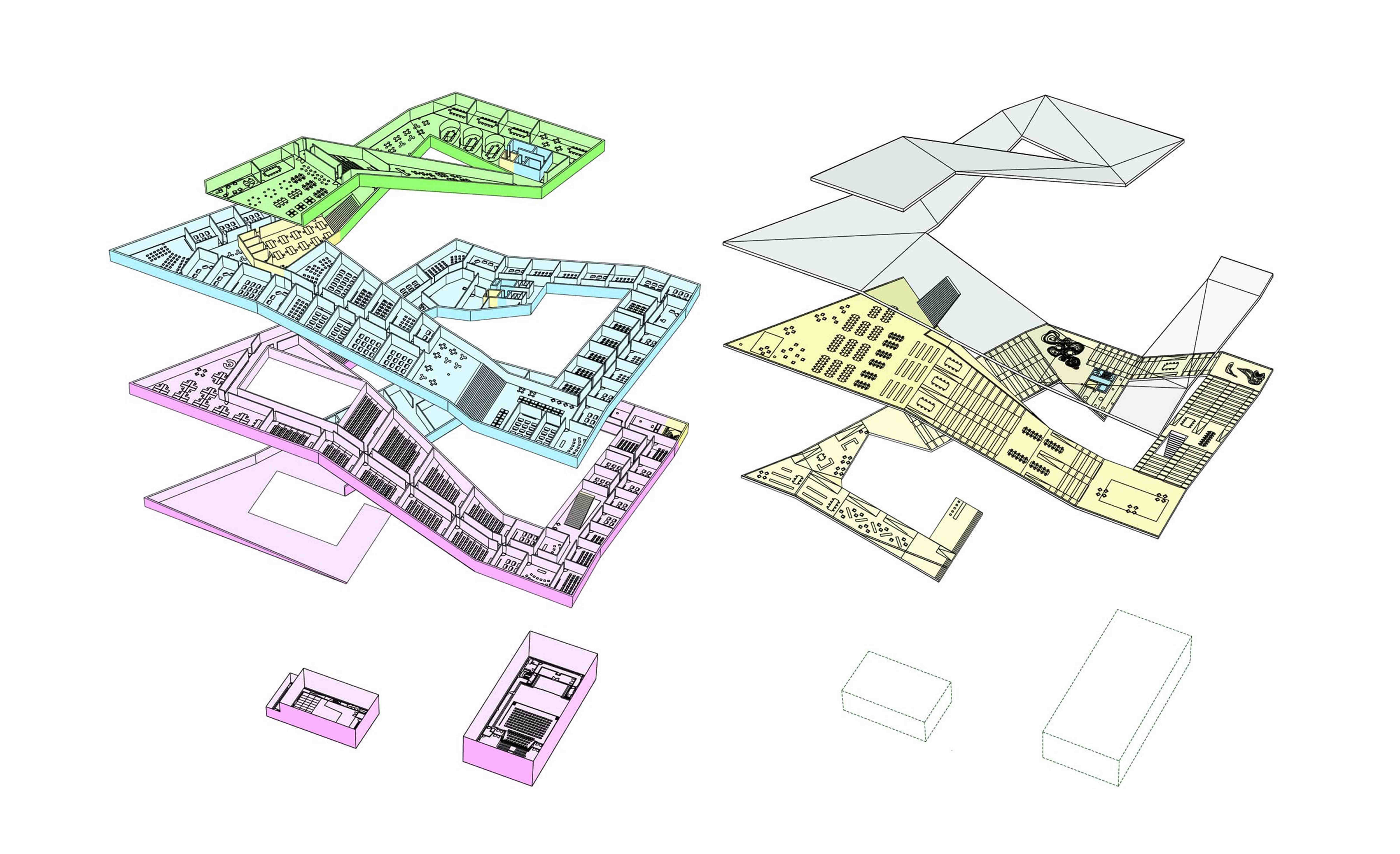 The most efficient and legible platform for organizing the LLLibrary may appear to be flat, stacked floors. In reality, as the needs of the LLLibrary evolve—and various portions expand or contract unpredictably—the clarity of a flat organization would quickly devolve. In contrast, the continuous Ribbon allows the various portions of the LLLibrary to grow or shrink without its overall organization ever becoming compromised.