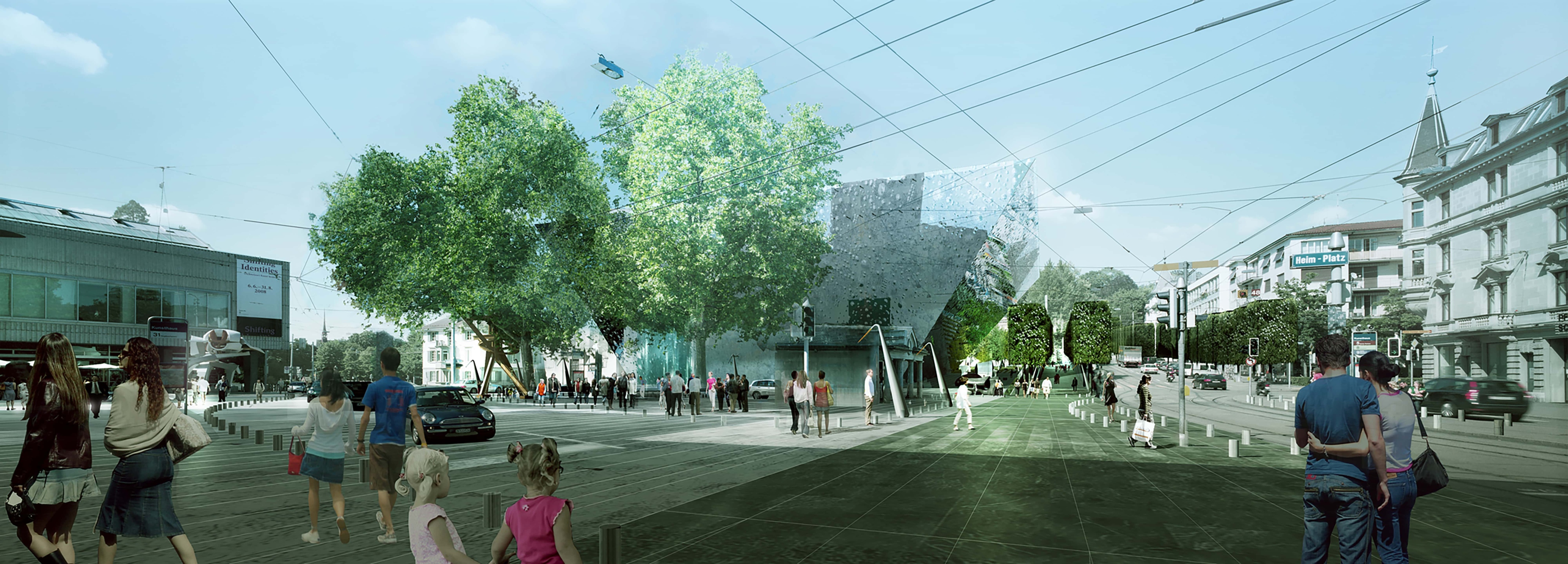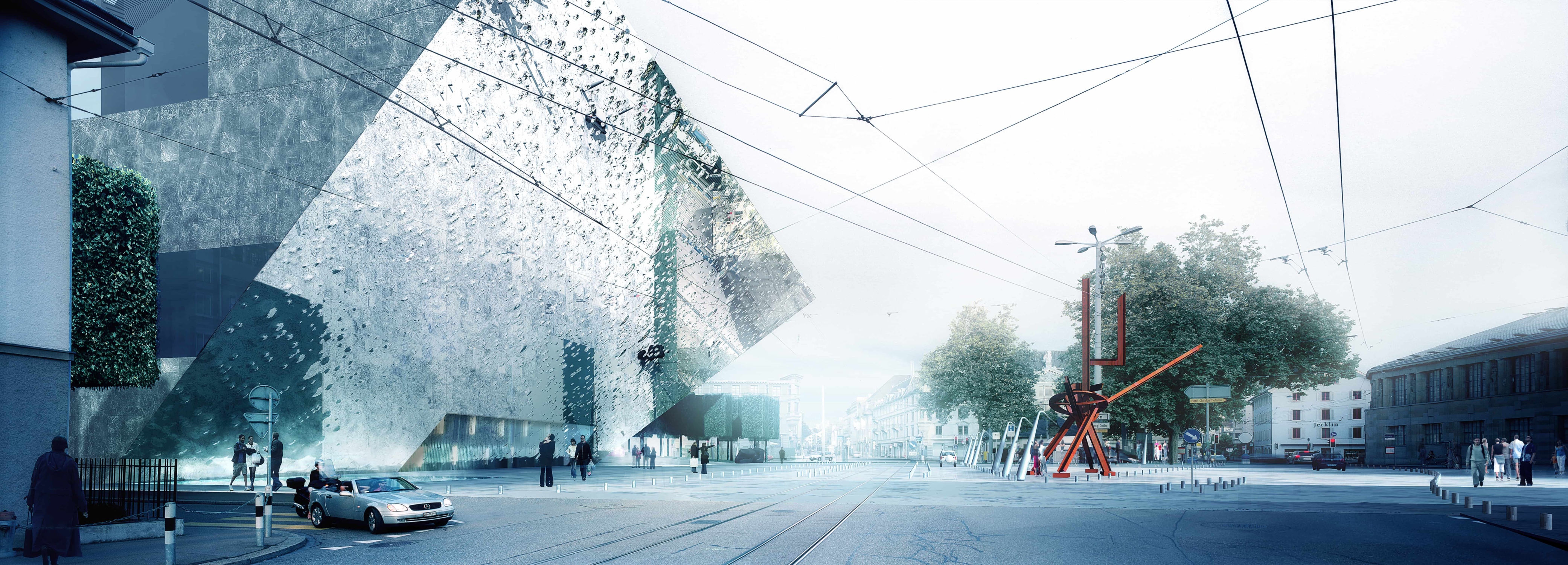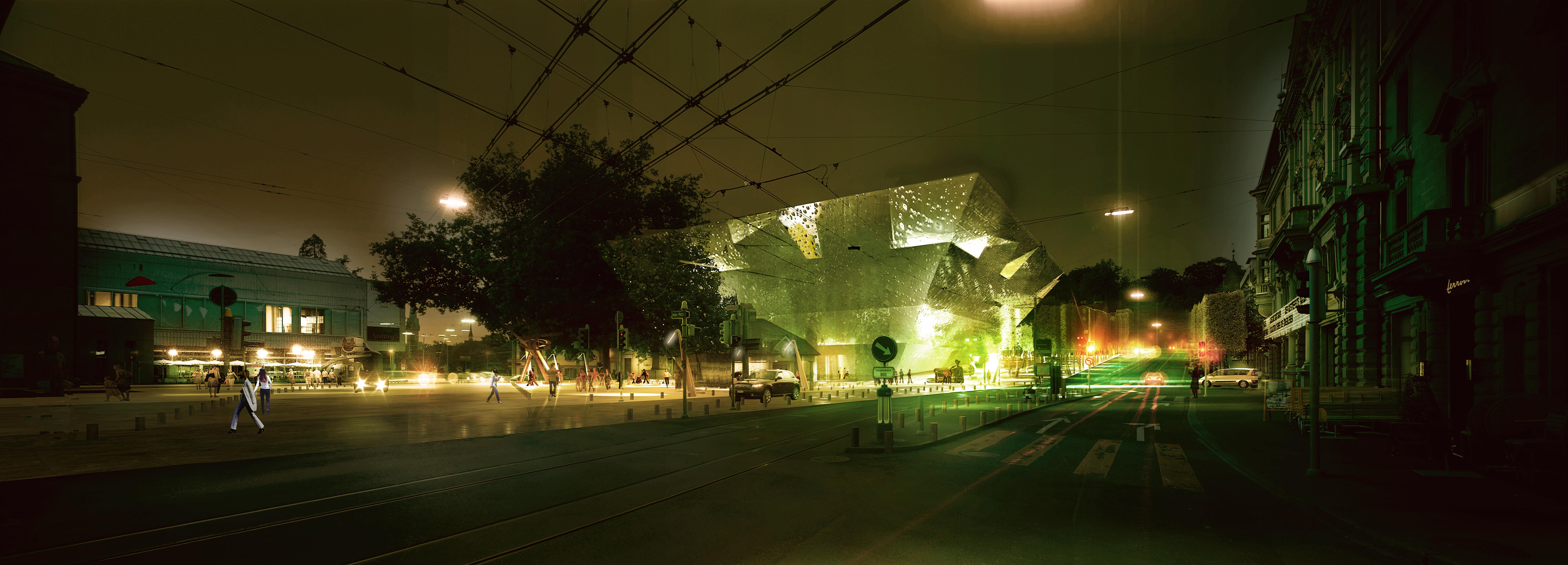 During daytime, a slumped, mirrored façade creates a jewel-like object in the heart of Zürich that reflects and magnifies the activity of the Heimplatz and the entrance to the Cultural Mile along Rämistrasse.