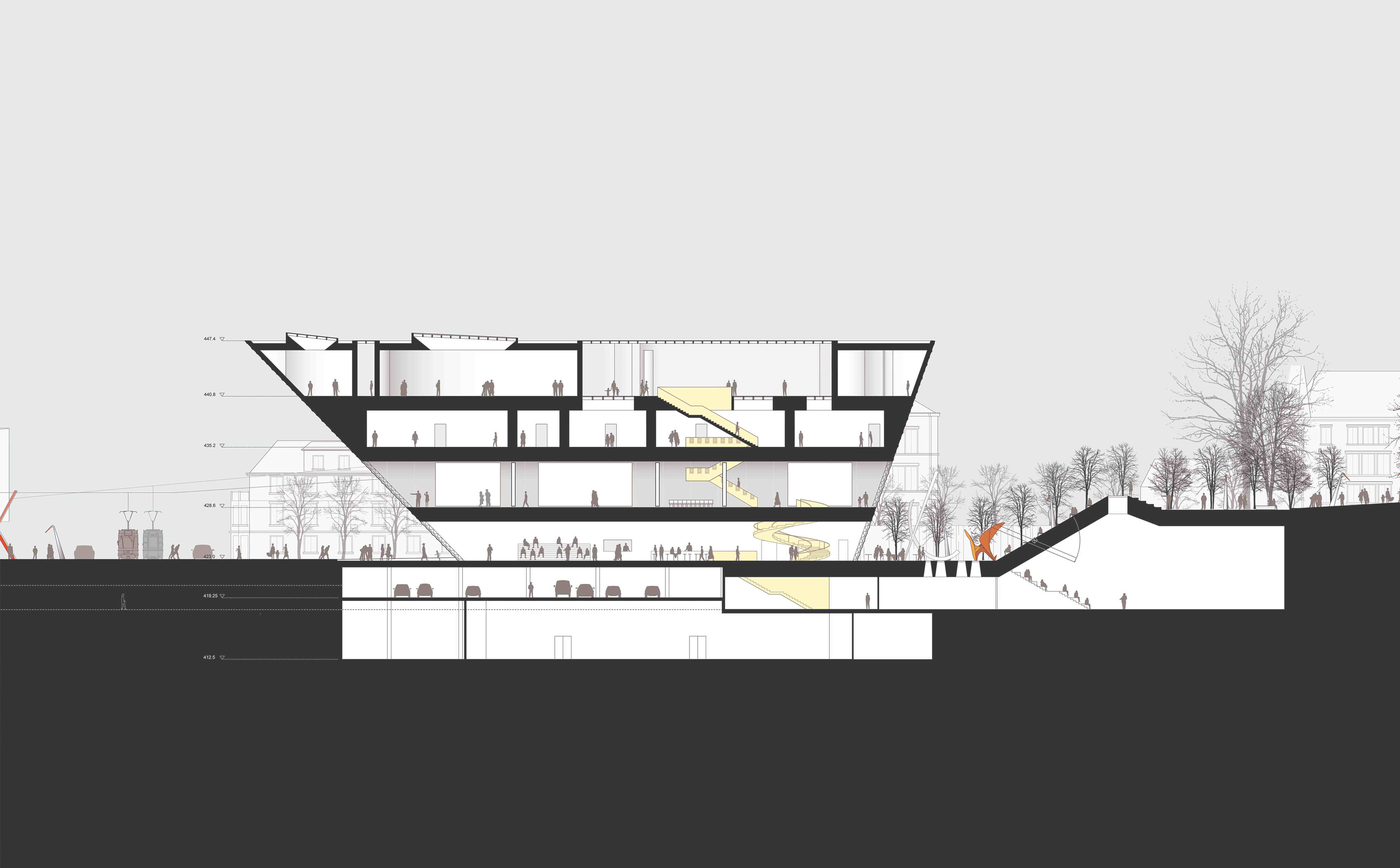 The form and placement of these activities can evolve over time without impacting the clarity of the original gesture, and their hours of operation can be independent of one another. Taking advantage of the site’s gradual slope, the Thoroughfare (level with the Heimplatz) creates a protected zone for important art works and a proscenium for art performances as it extends into the Art Garden. Parallel to the Thoroughfare and protected by the extension’s canted façade is a revitalized “Gate to the Arts” along Rämistrasse.