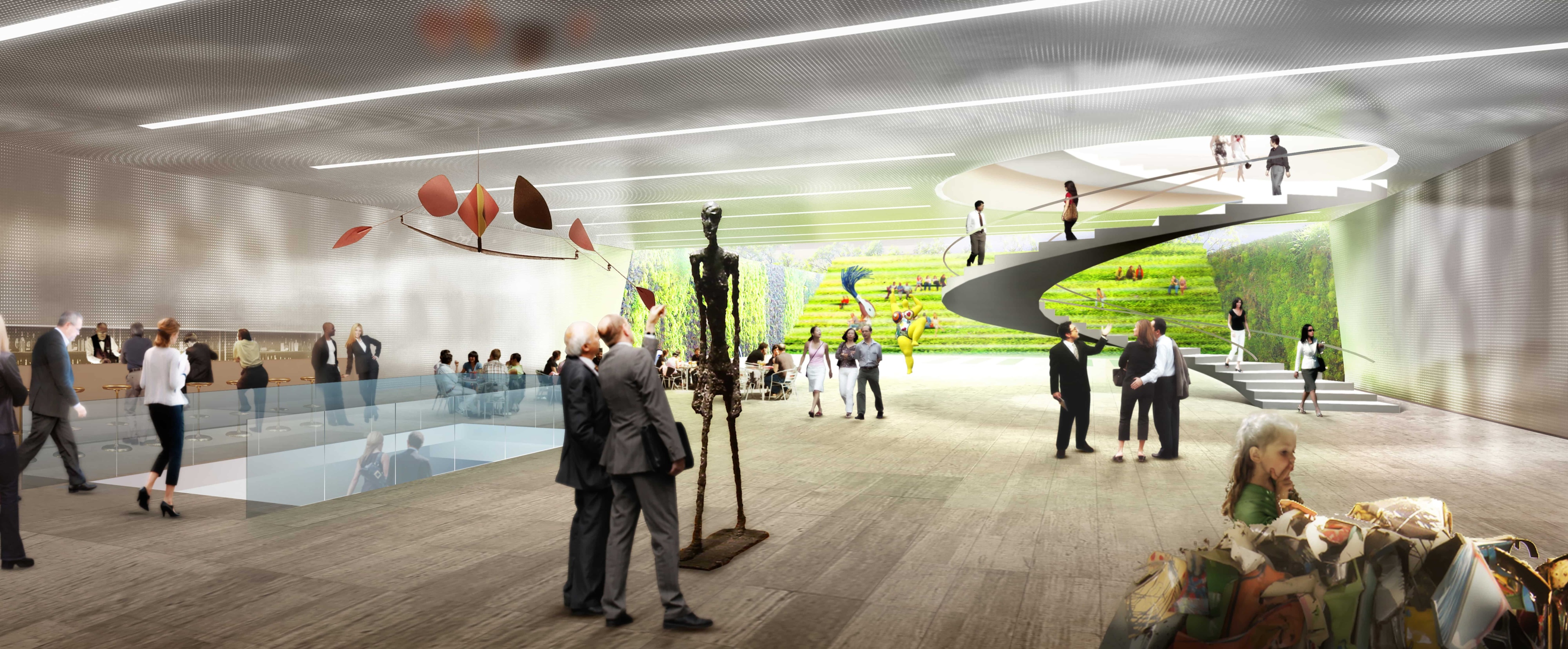 The moments of repose between the Level 3 boxes are sheltered by photo-voltaic glass that allows light to filter down to levels below.