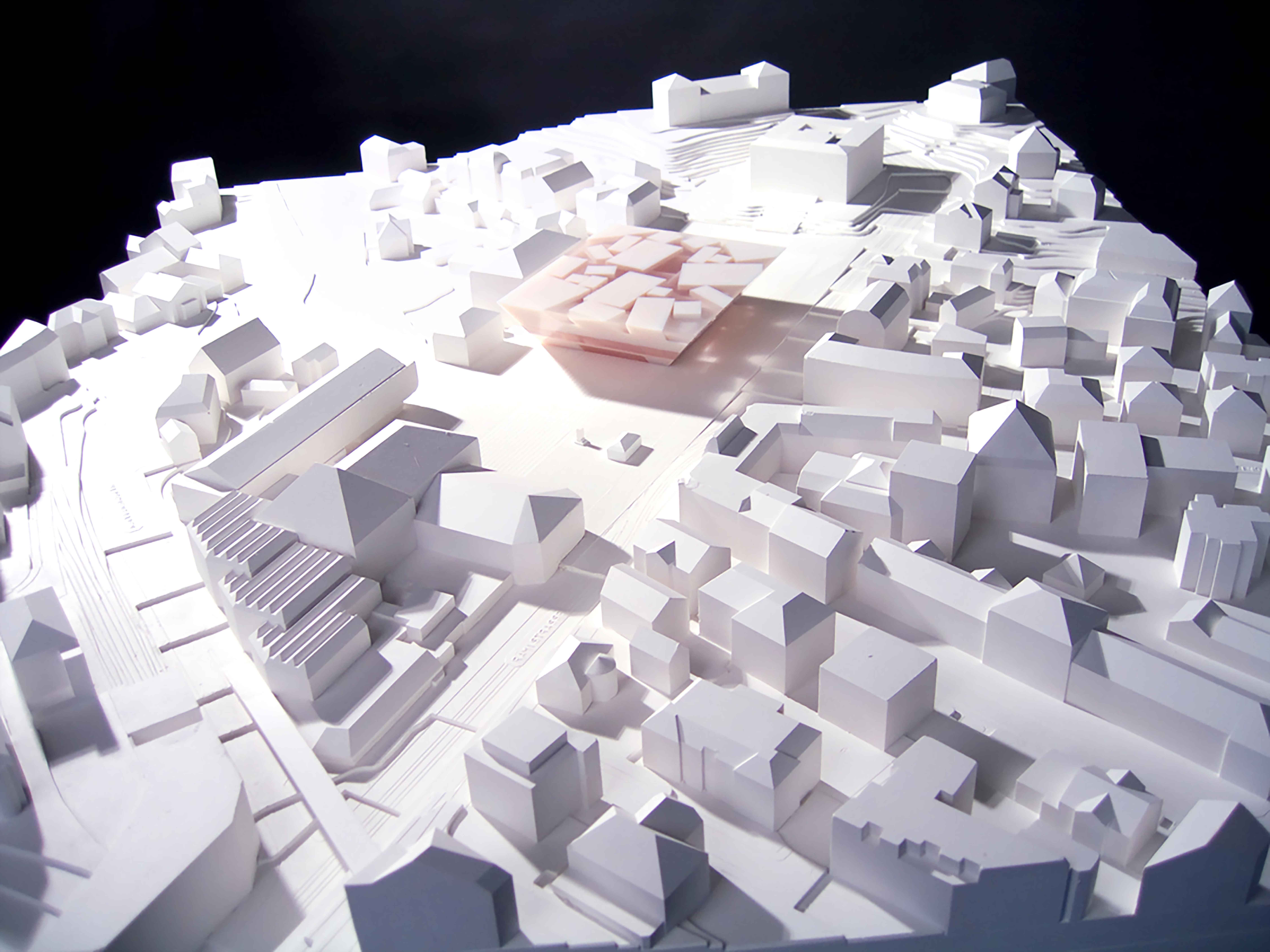 The resultant building shape responds equally to urban concerns as it does programmatic requirements. Along its most public frontage, the canted form—wider at the top, narrower at the bottom—simultaneously holds the edge of the site and increases the Heimplatz’s dimension to echo its true significance within the City. The public, spatial quality of the Heimplatz is enlarged and enhanced by the Kunsthaus extension even if transformation of the square itself does not begin for many years. Further, as one enters the extension, the existing Kunsthaus Zürich is reflected by the extension’s façade, creating a dialogue with the rest of the Kunsthaus’ building ensemble; yet, the sloped facades prevent light from reflecting into the extension’s neighbors. In contrast, along Kantonsschulstrasse—a smaller-scale street in close proximity to the Schulhaus Wolfbach—the façade becomes stone and vertical, responding to the site conditions in a more austere and intimate manner.