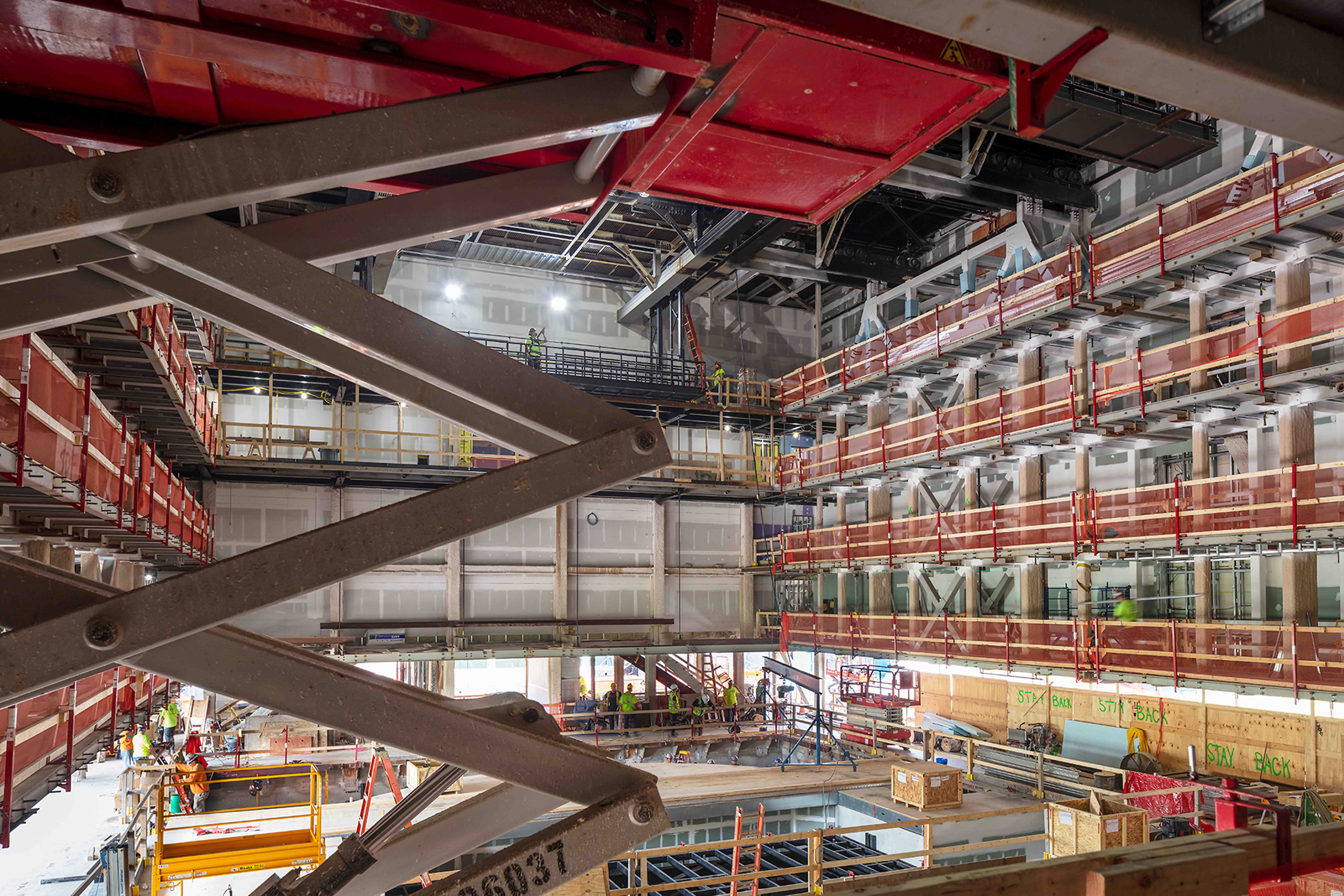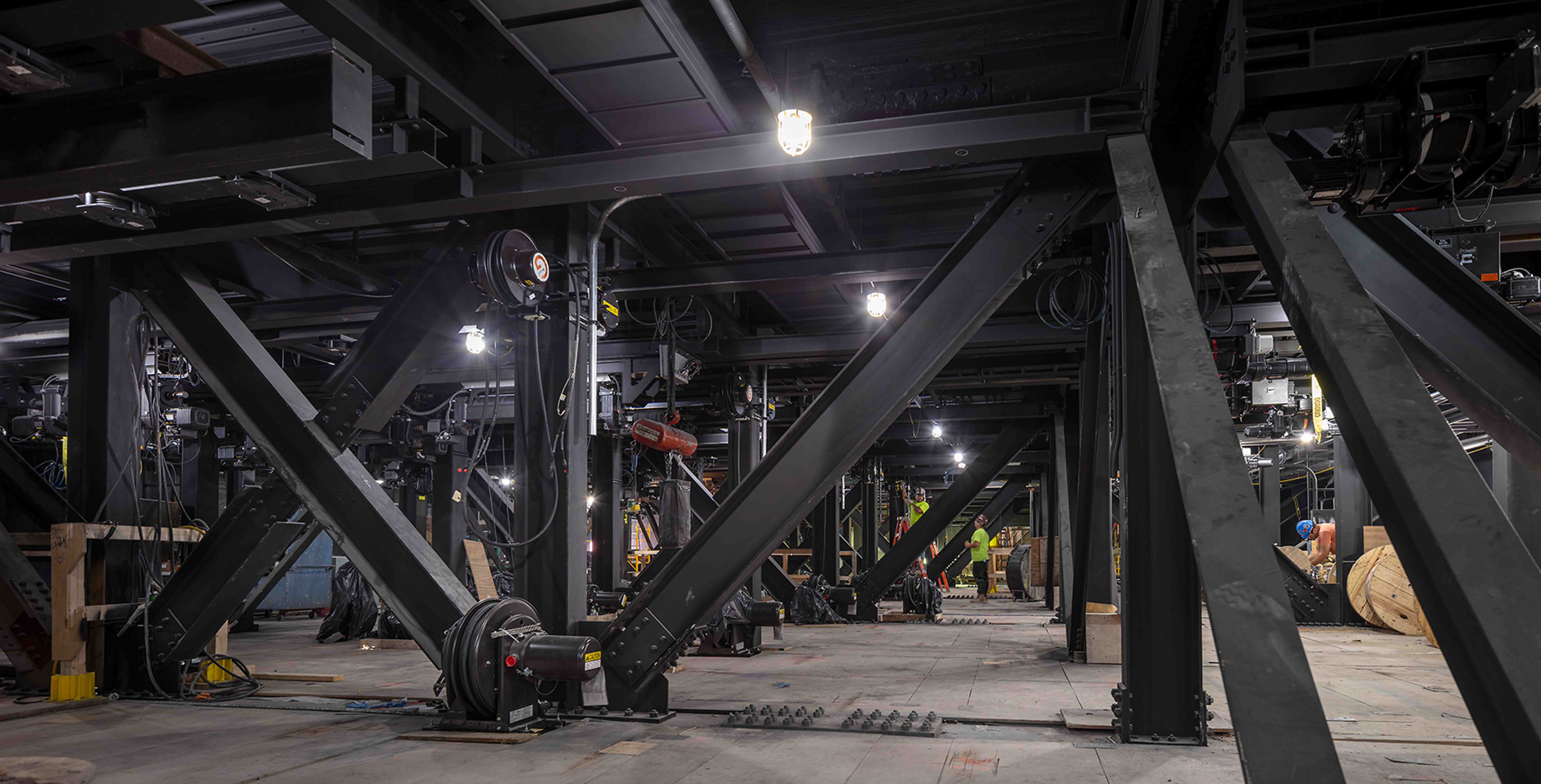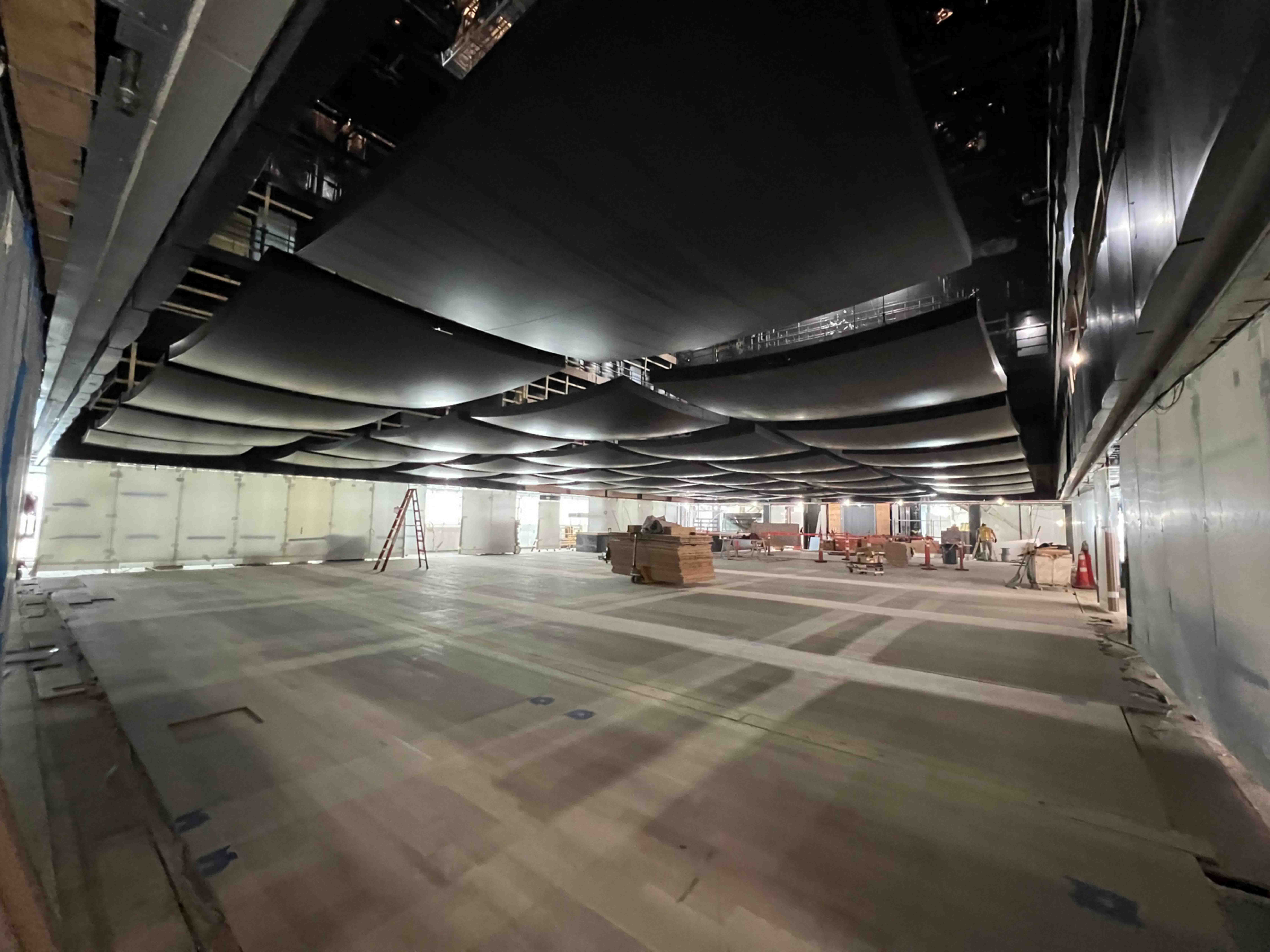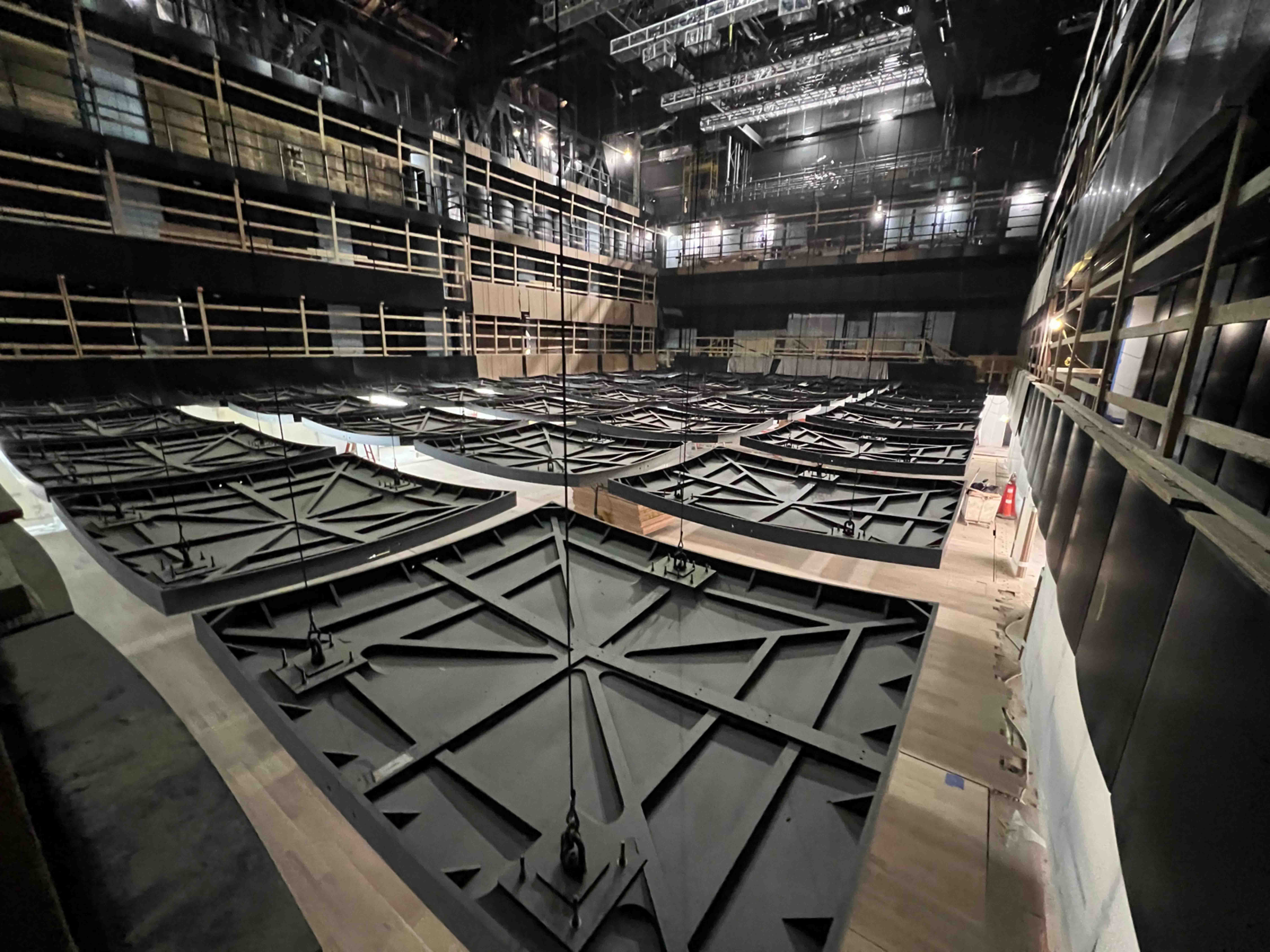 Acoustic reflector panels lowered to the align with the bottom of the gantries