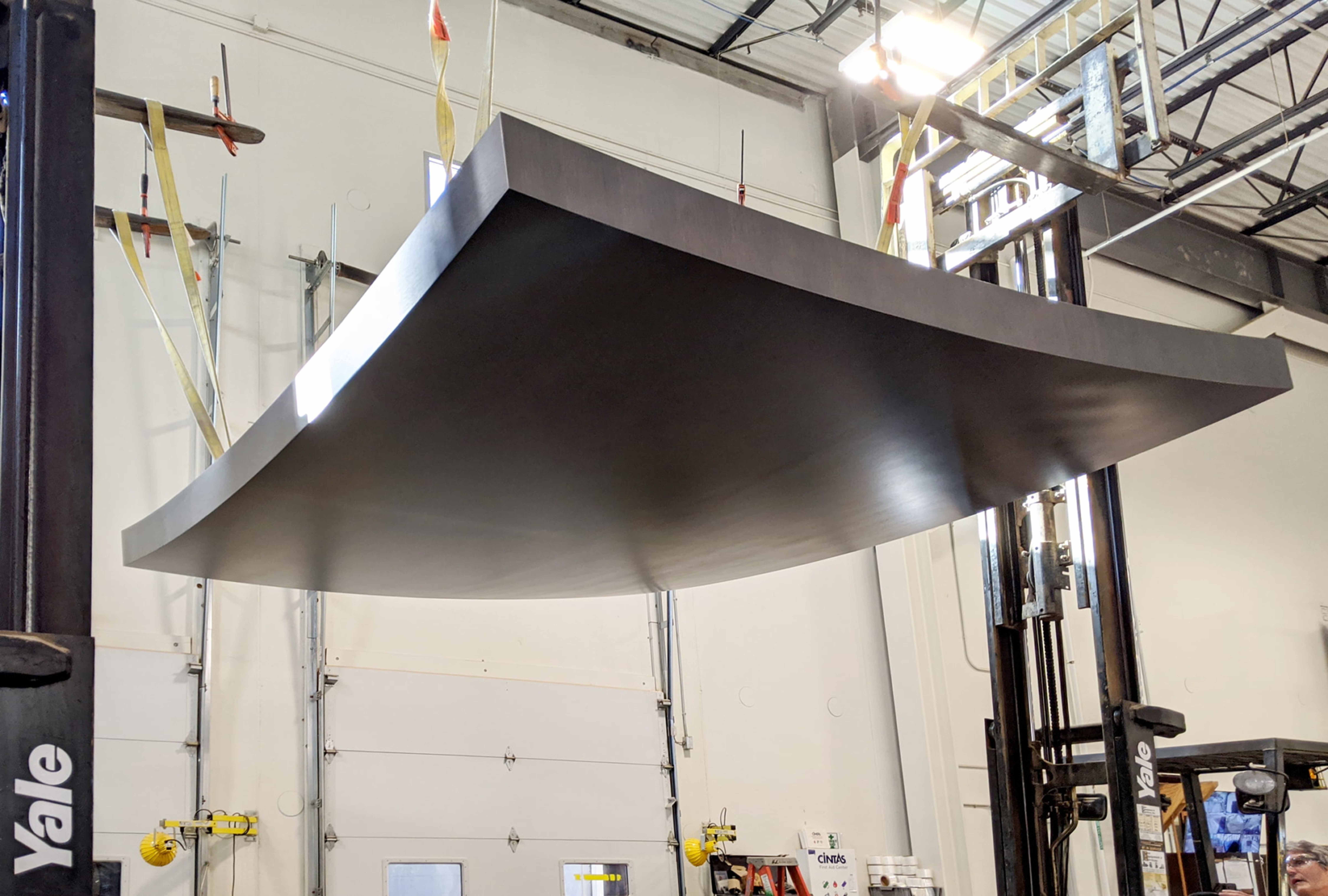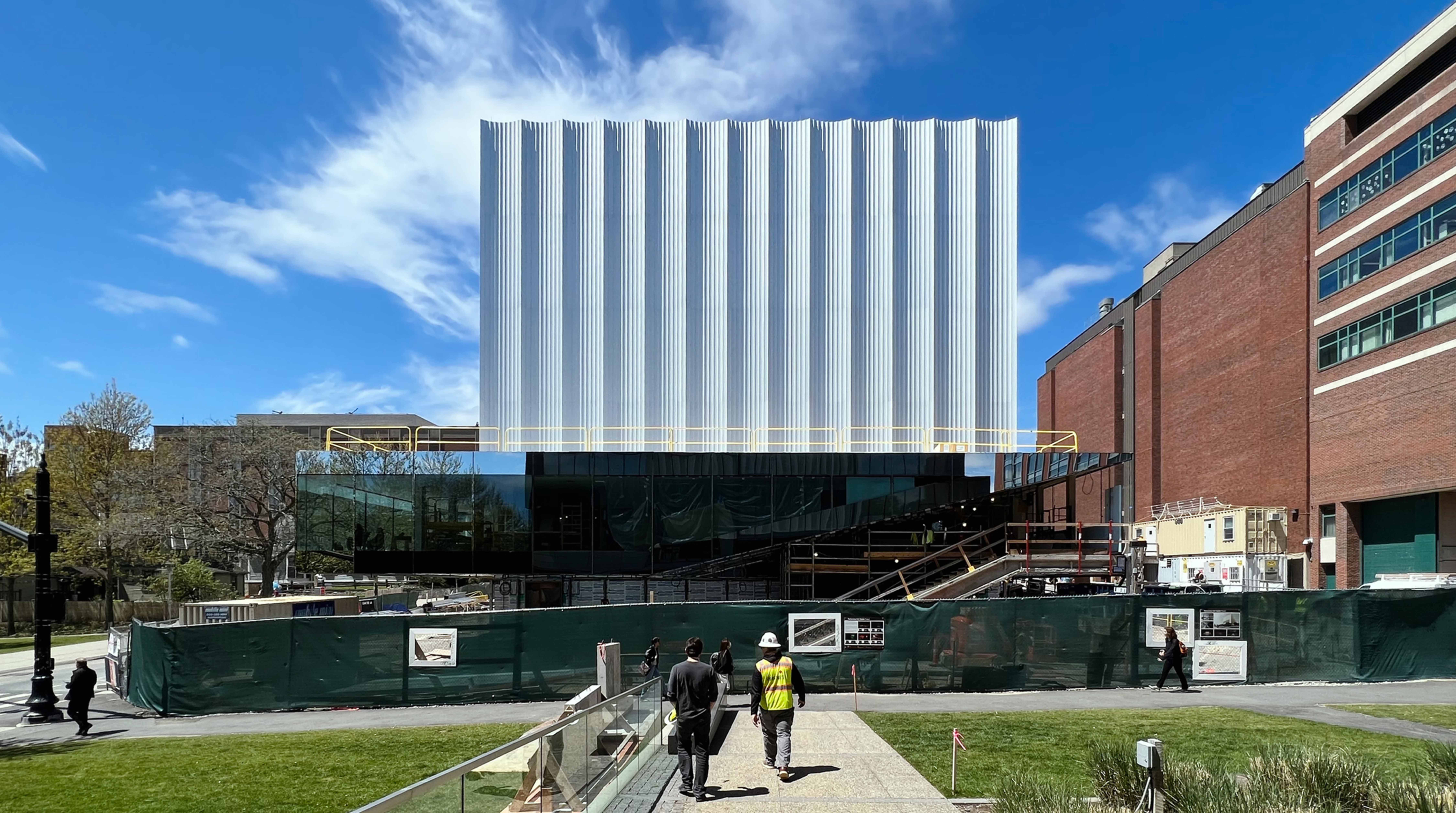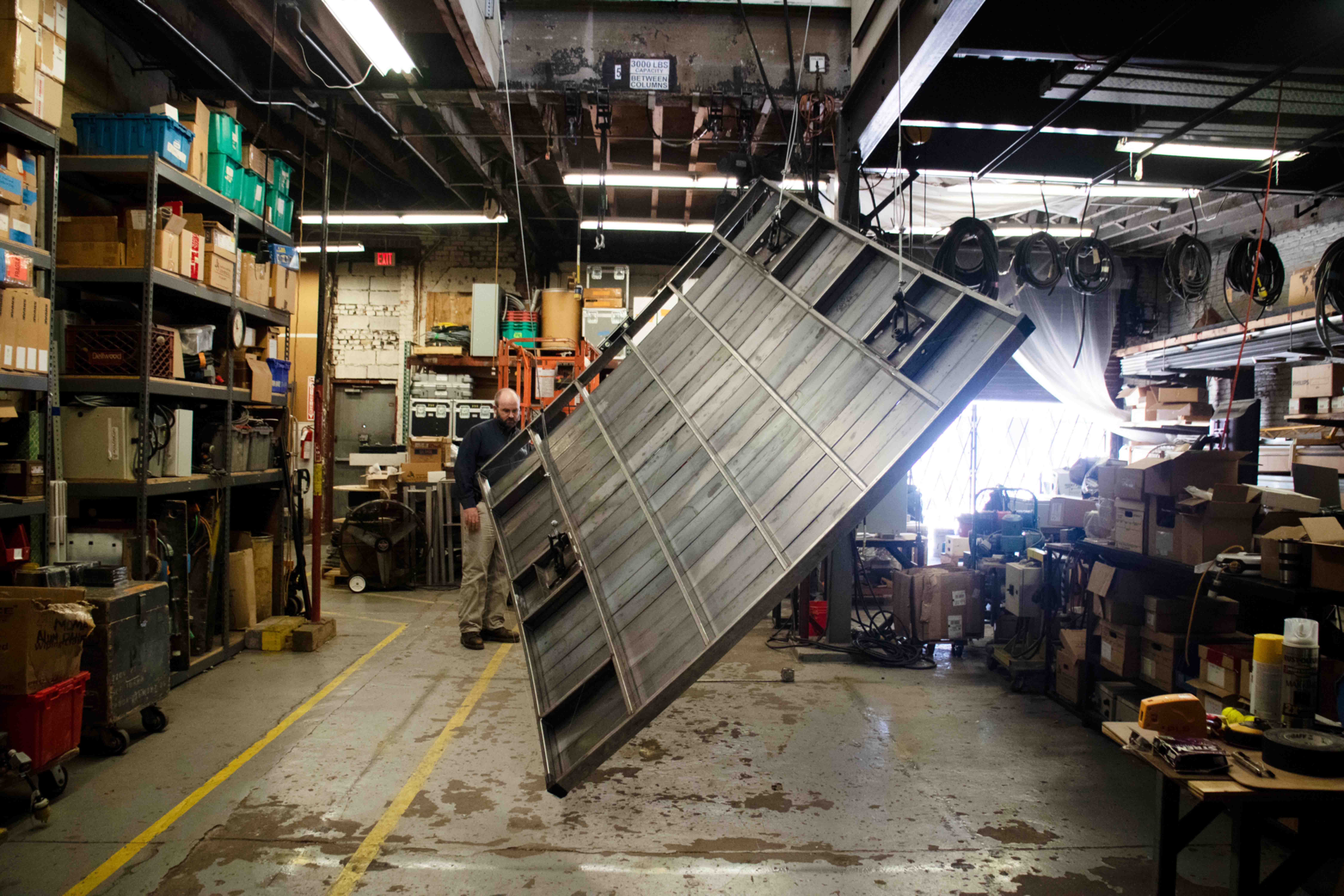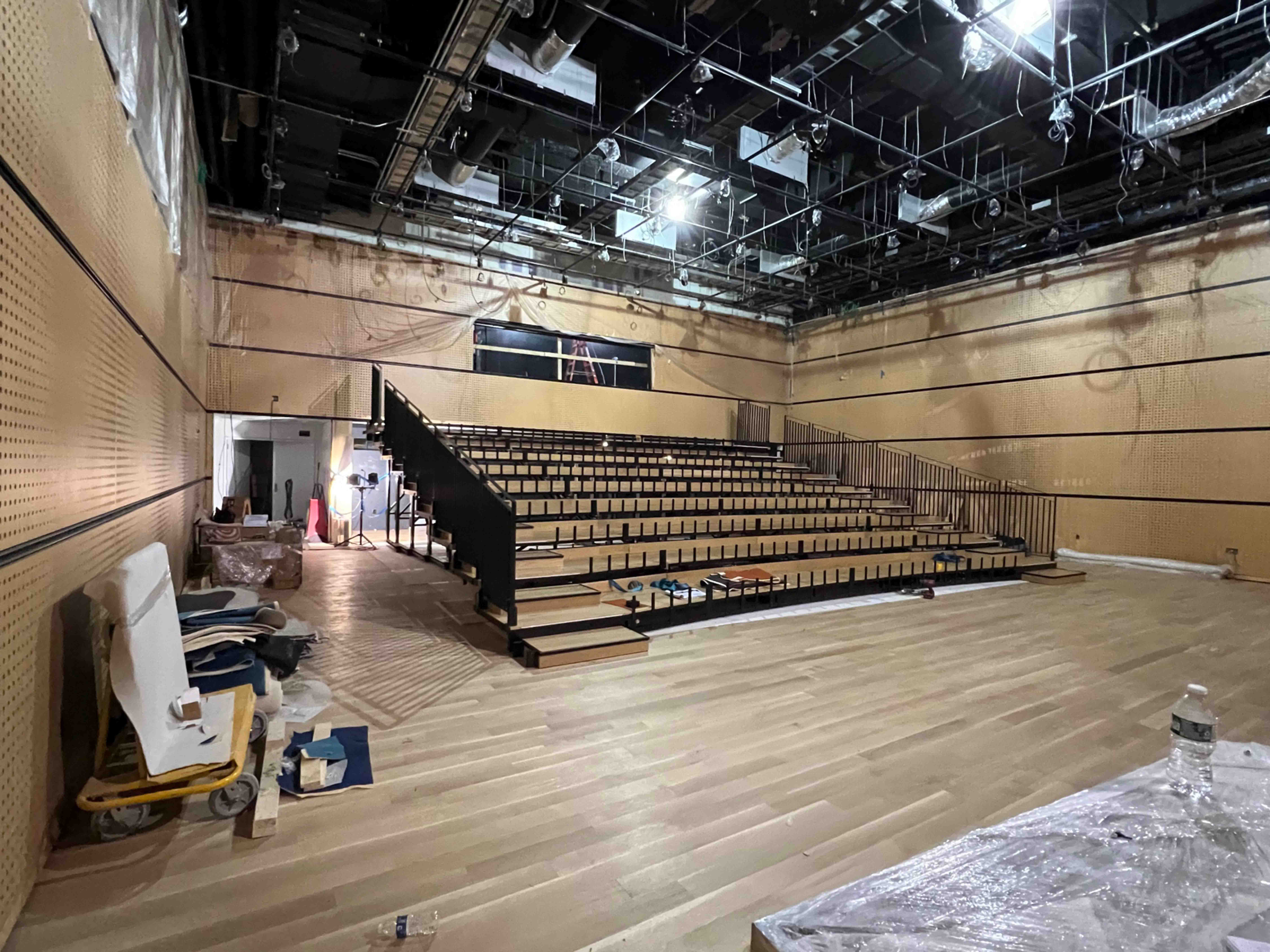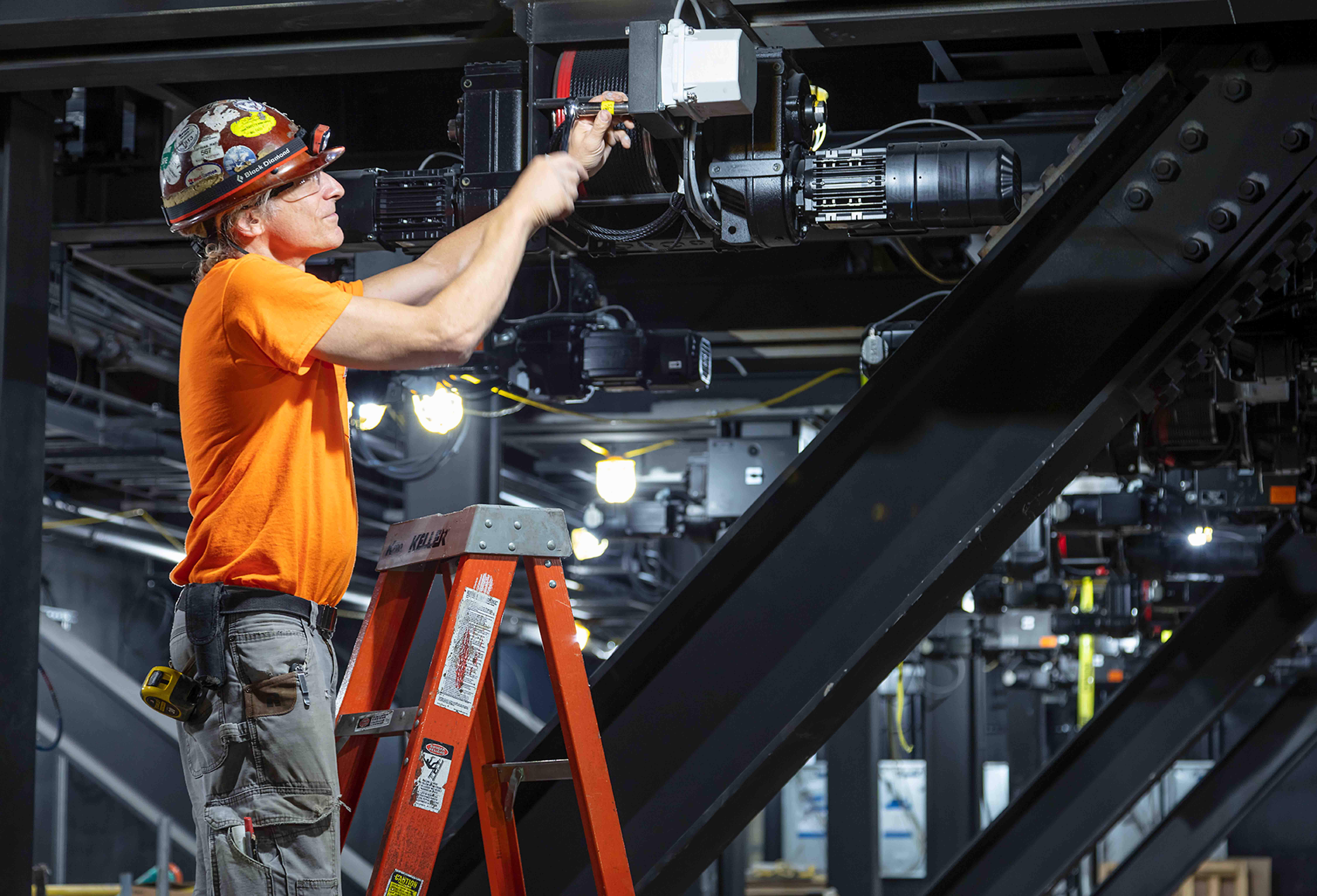 Acoustic reflector panels lowered to the align with the bottom of the gantries