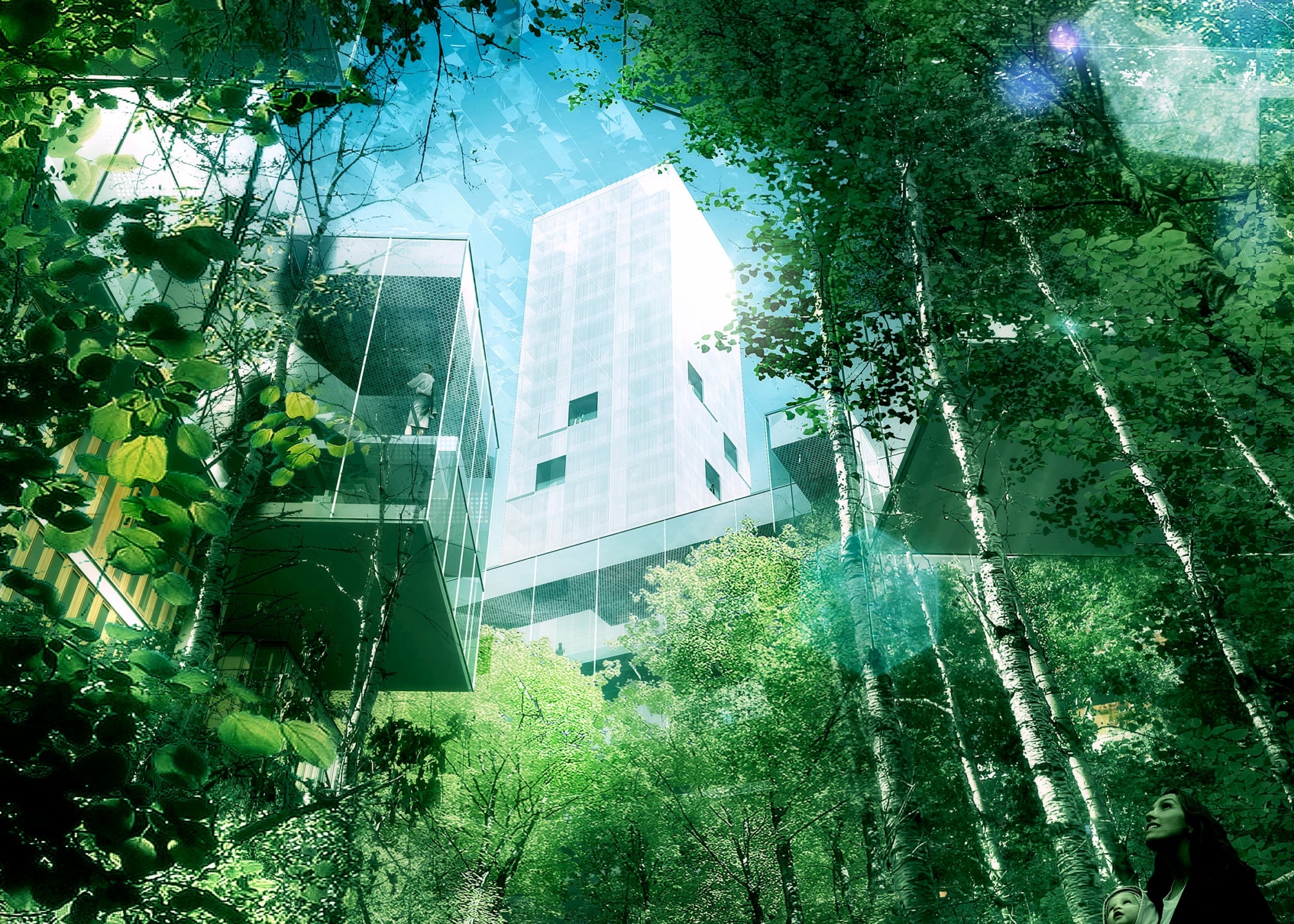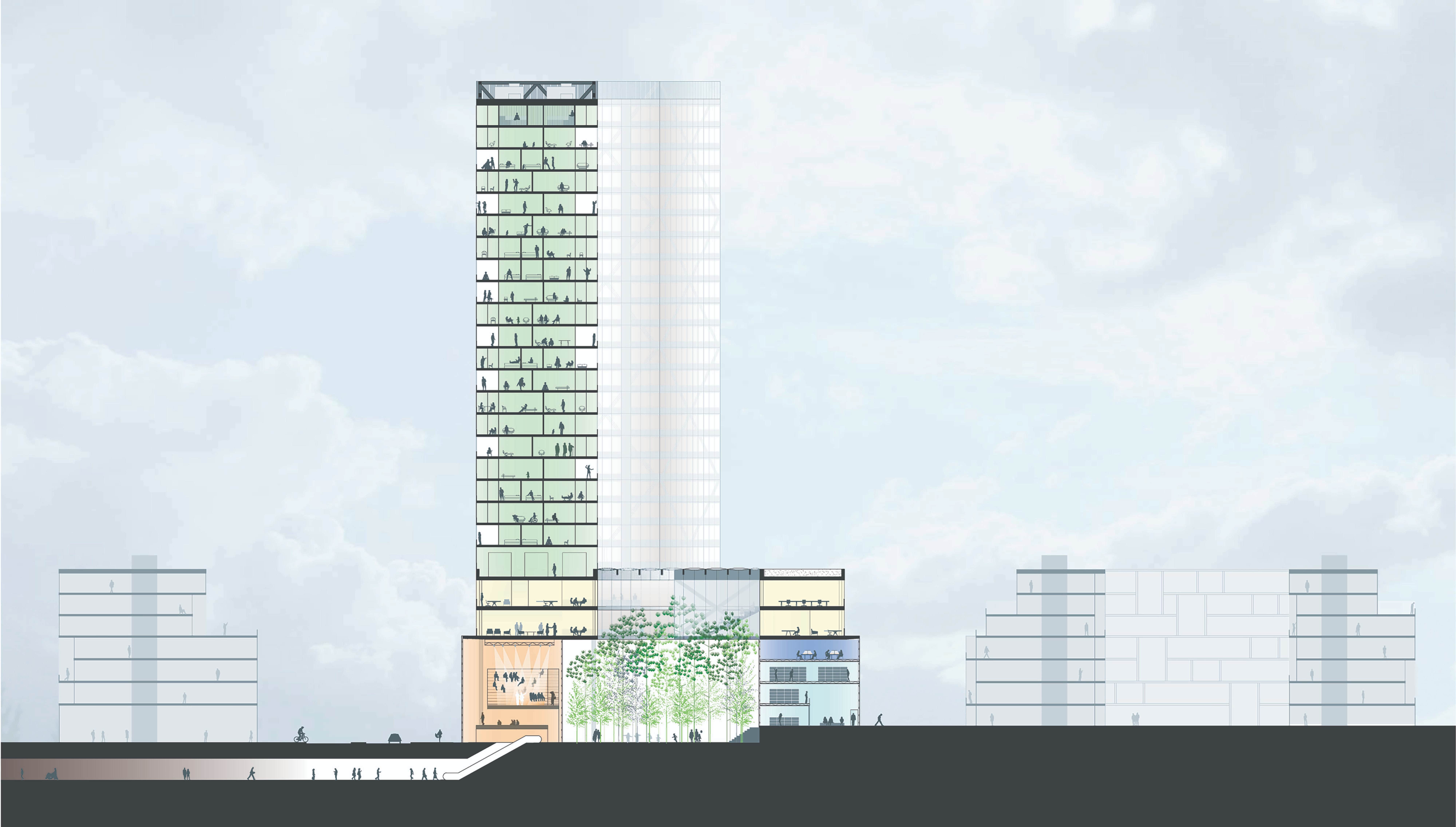 By concentrating 22,000 m² of program 14 meters above grade into two slender residential towers unified by a two story office ring …