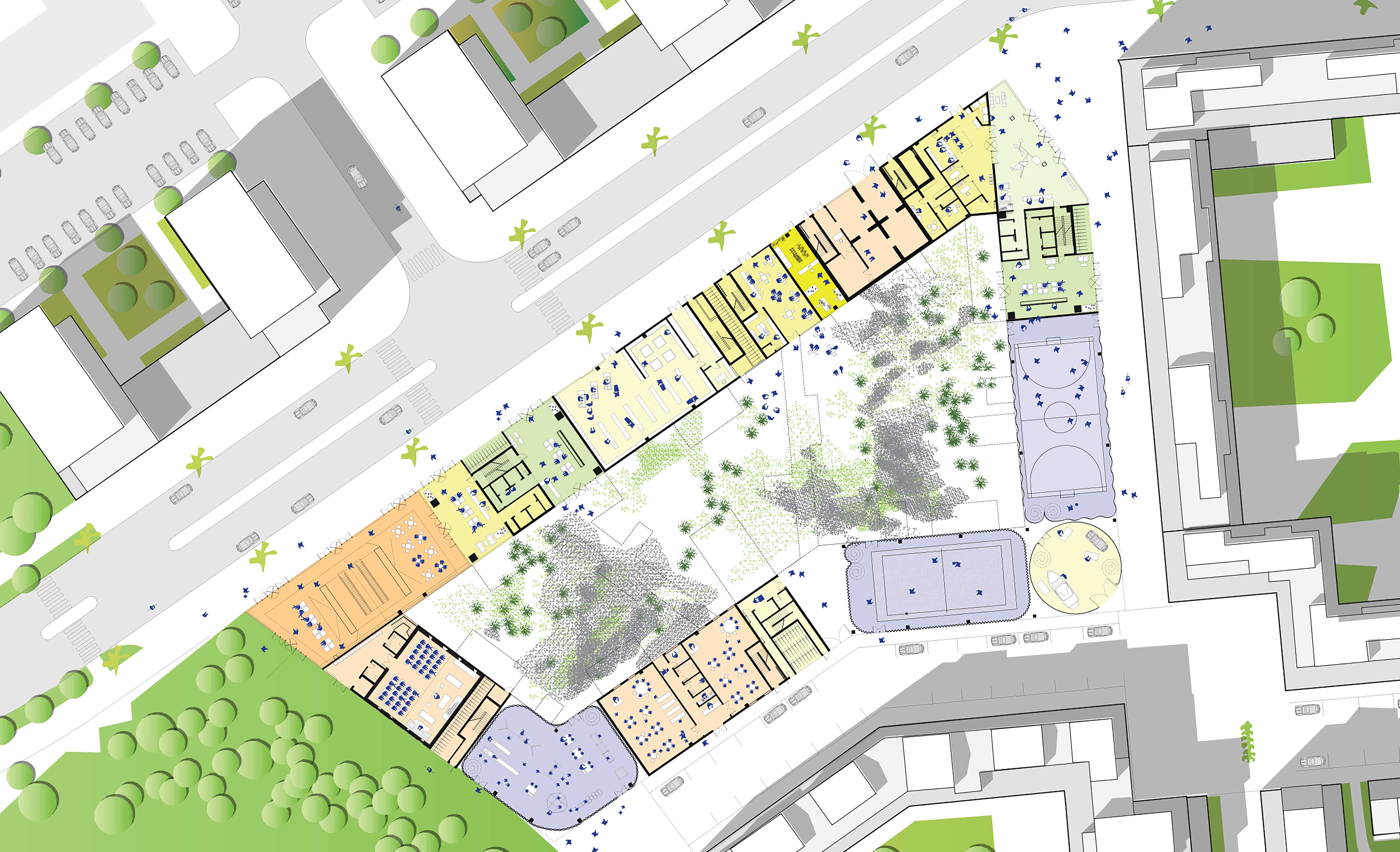 PROGRAM Mixed-use sustainable development containing 14,000 m² of residential units, an 8,000 m² headquarters, and 13,200 m² of “Urban Infill”