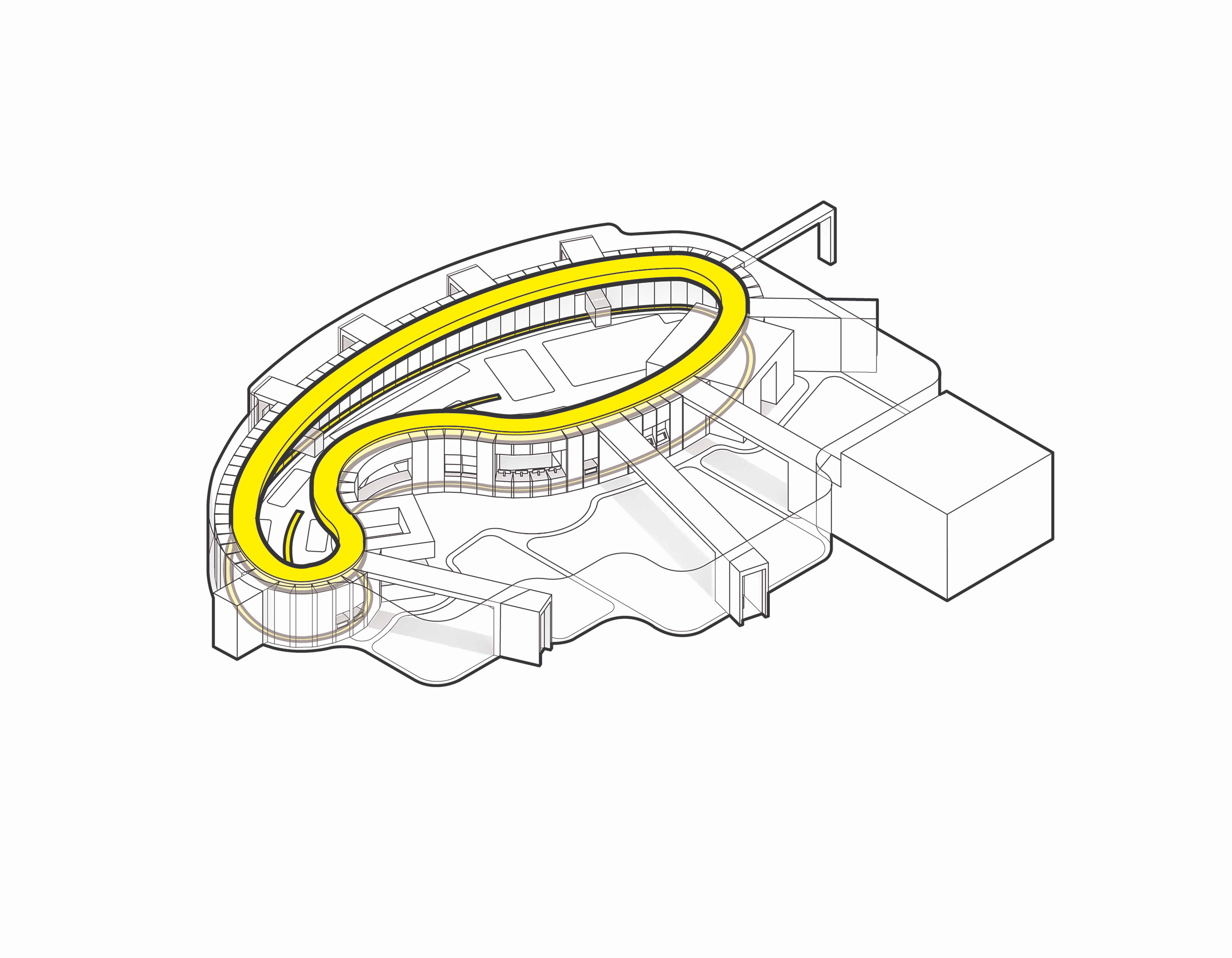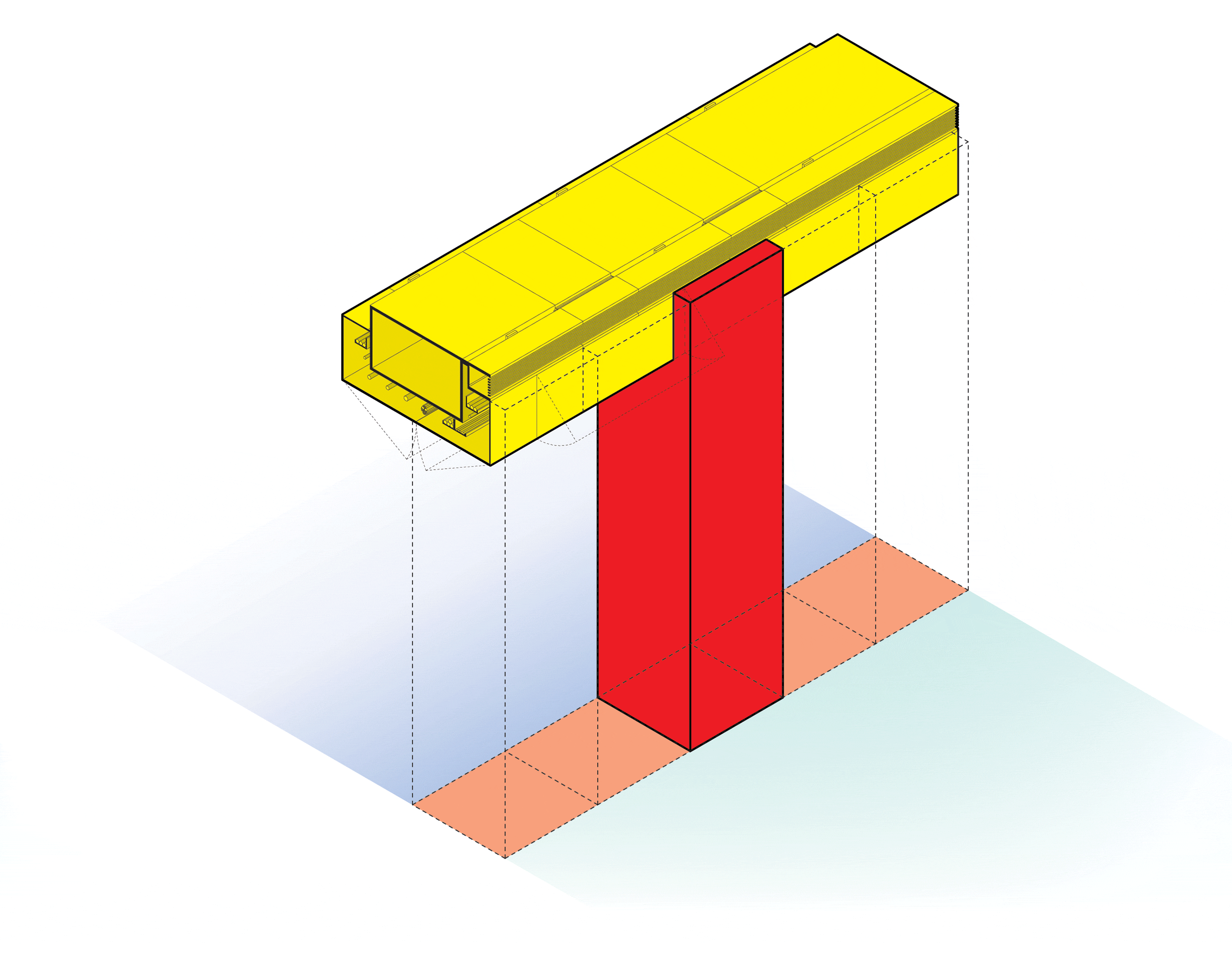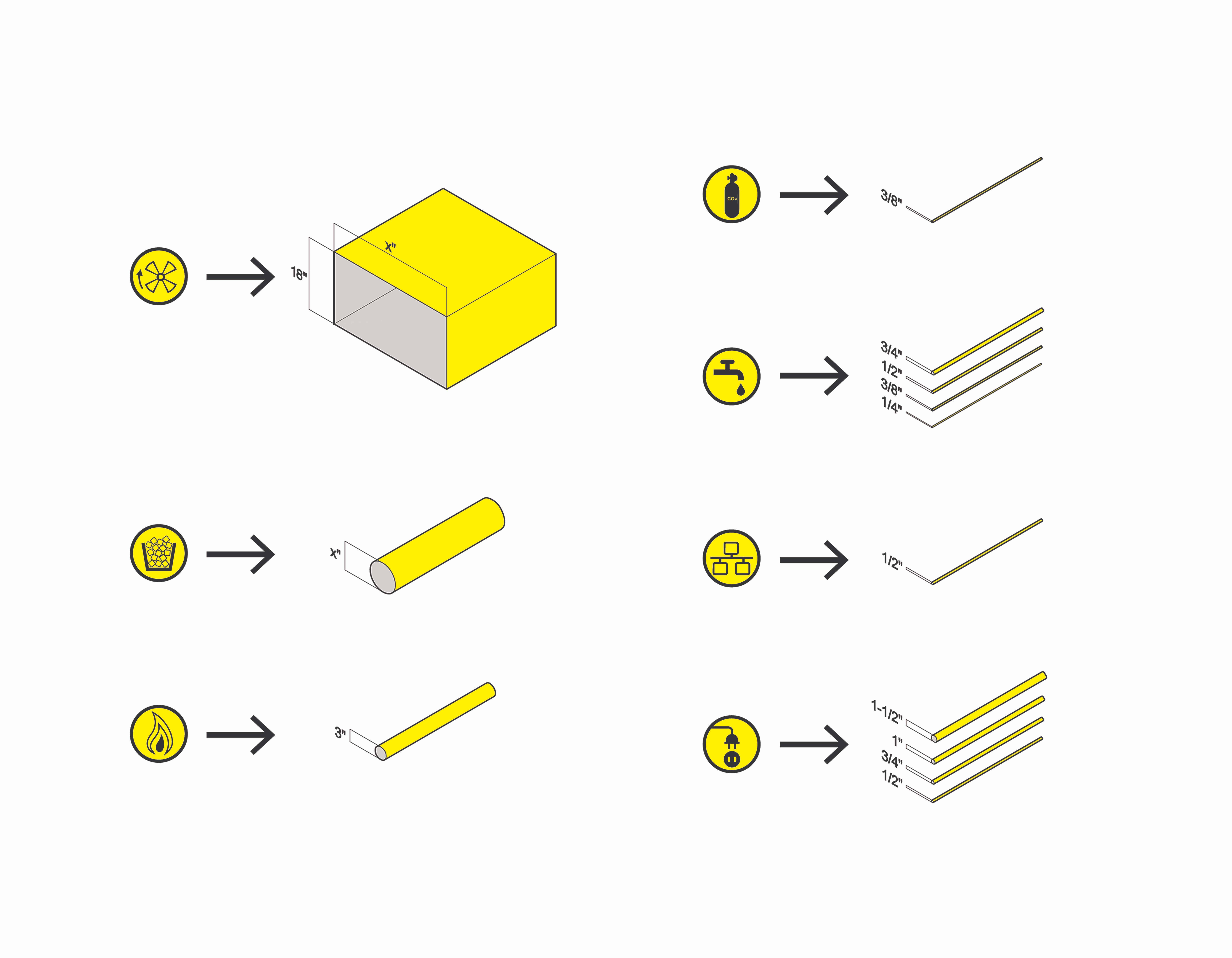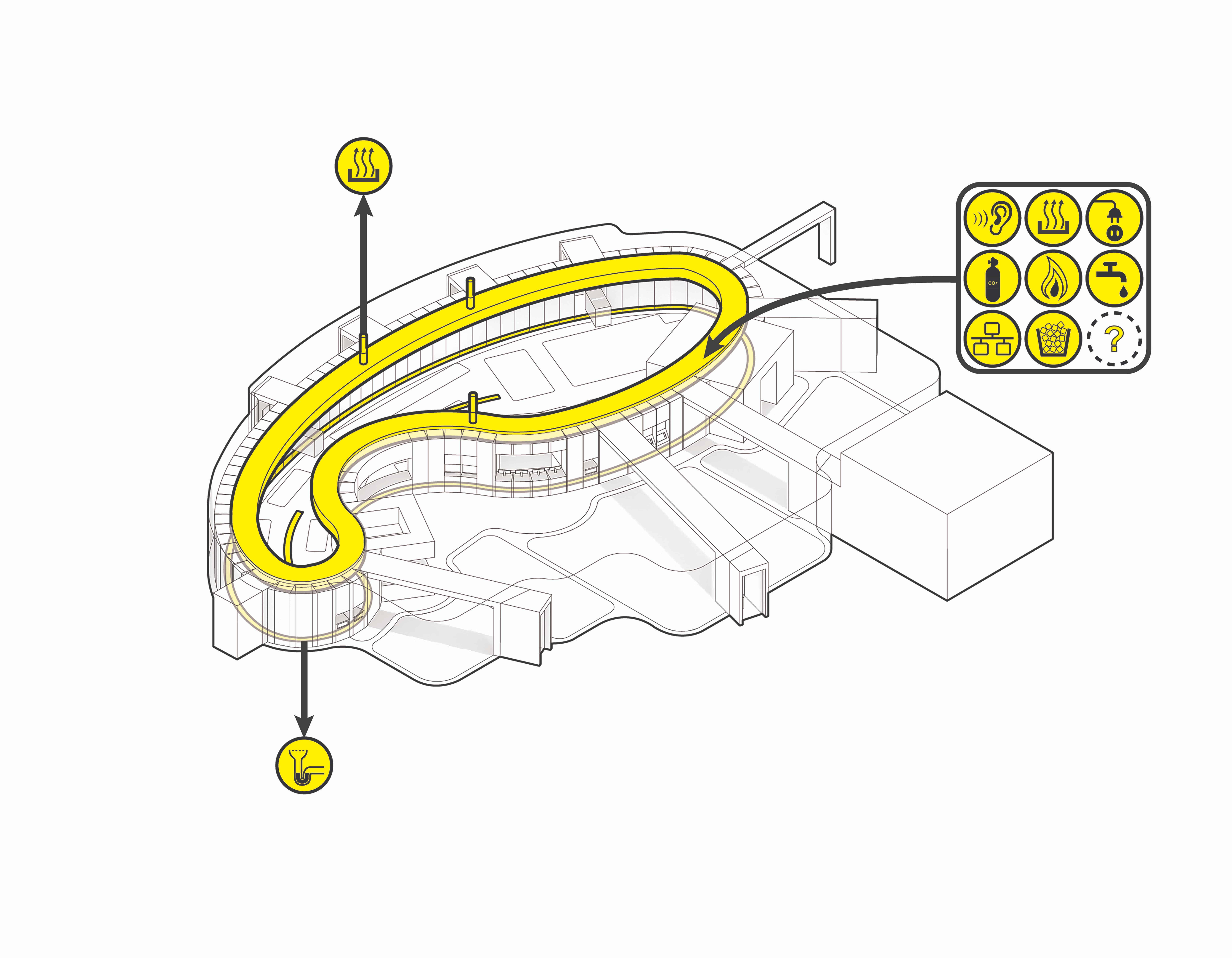 All infrastructural components (except drainage) are bundled into the Chassis, an easily accessible, overhead loop that allows for maximum flexibility over time while requiring a minimum amount of reconfiguration and cost. Drainage is placed beneath the Chassis, and in a trough drain running down the middle of the kitchen.
