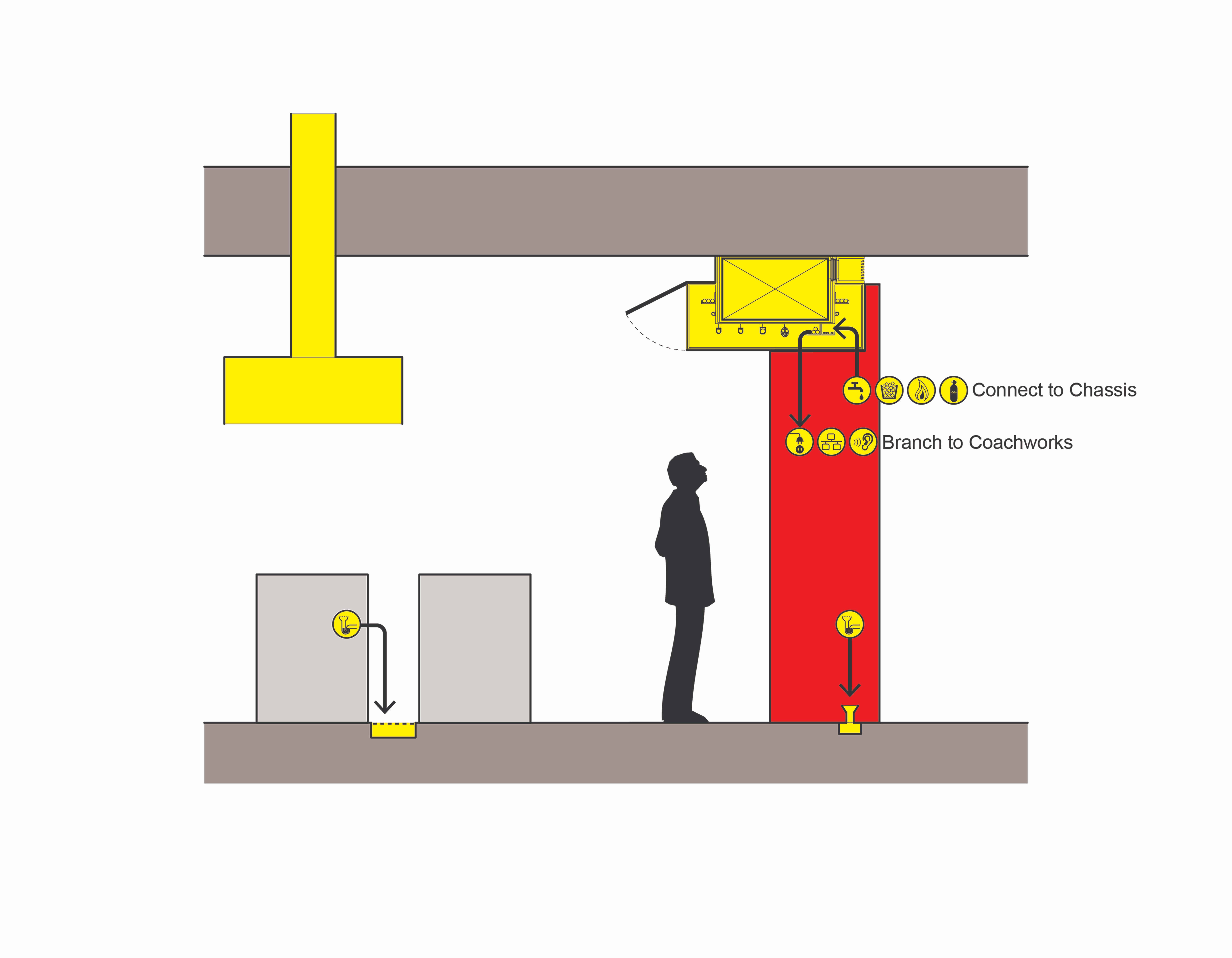 Connection points—or “whips”—are built into the Chassis from day one, and can be unraveled to accommodate additional or relocated Coachworks. This greatly reduces the time and cost of remodeling or the rearranging the Coachworks, and standardizes the Coachworks’ specification.