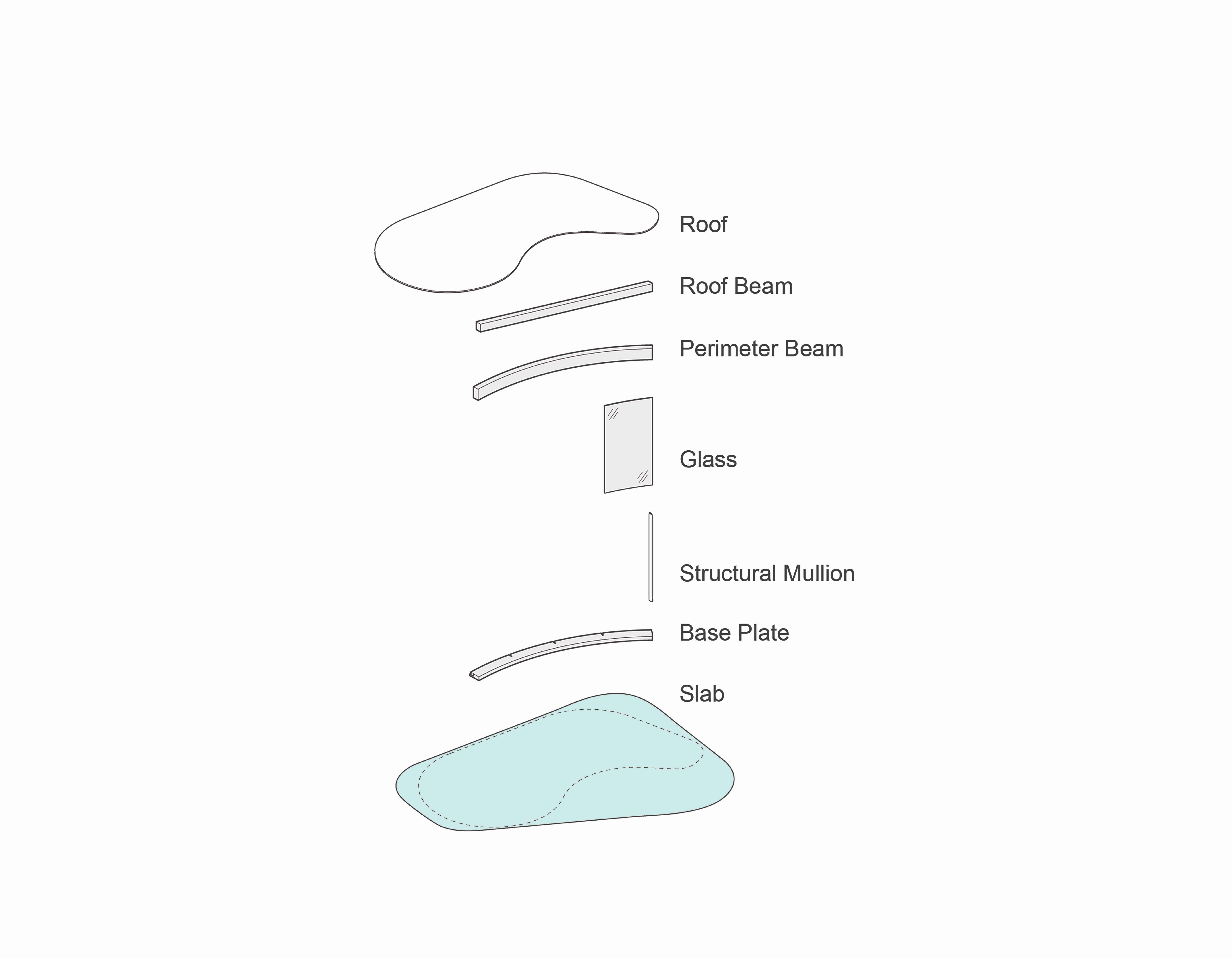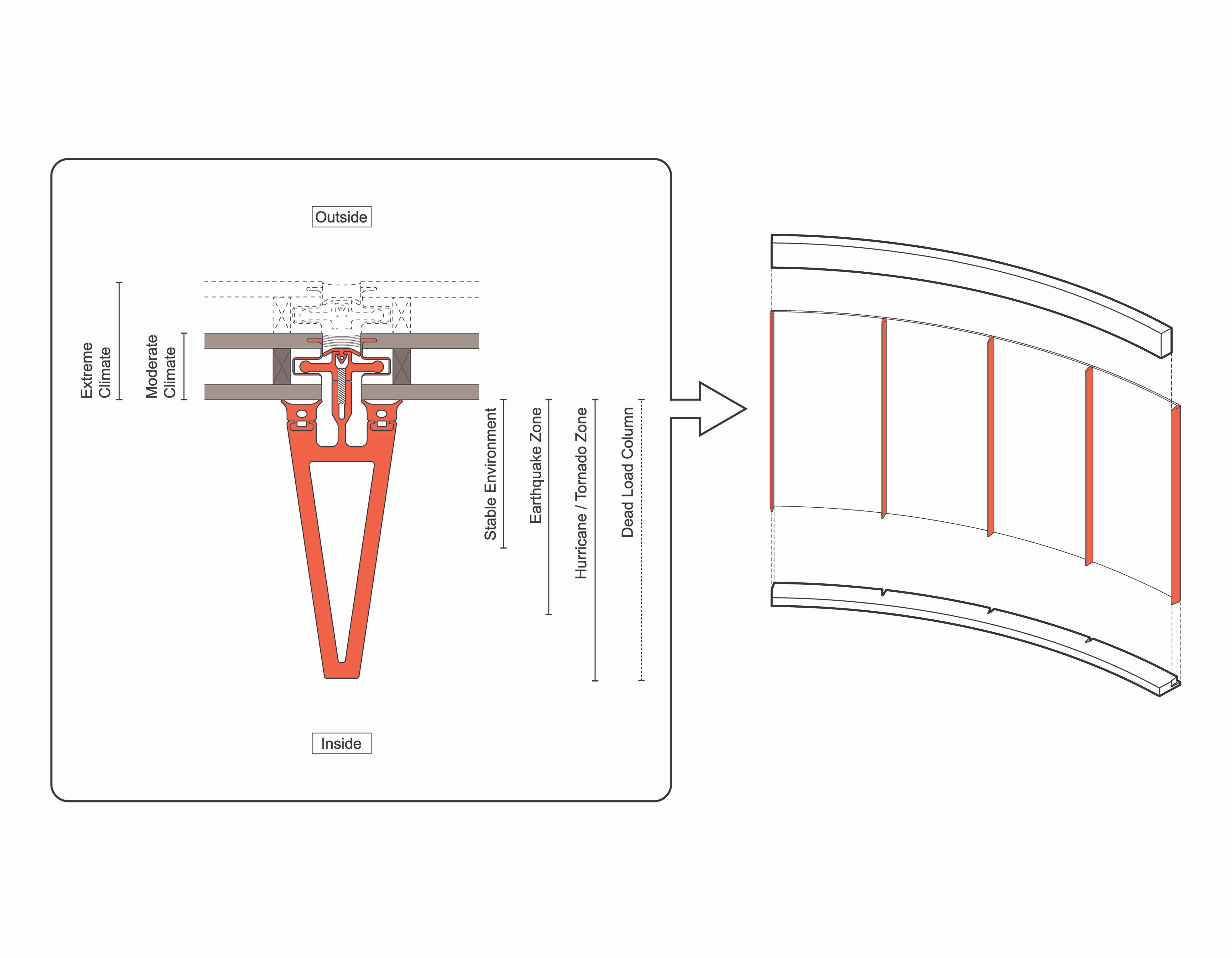 A kit of Enclosure parts yields a wide range of forms that respond to site and market. A standard structural mullion efficiently supports both the enclosure and the roof, eliminating the need for interior structure and reducing the number of construction pieces.