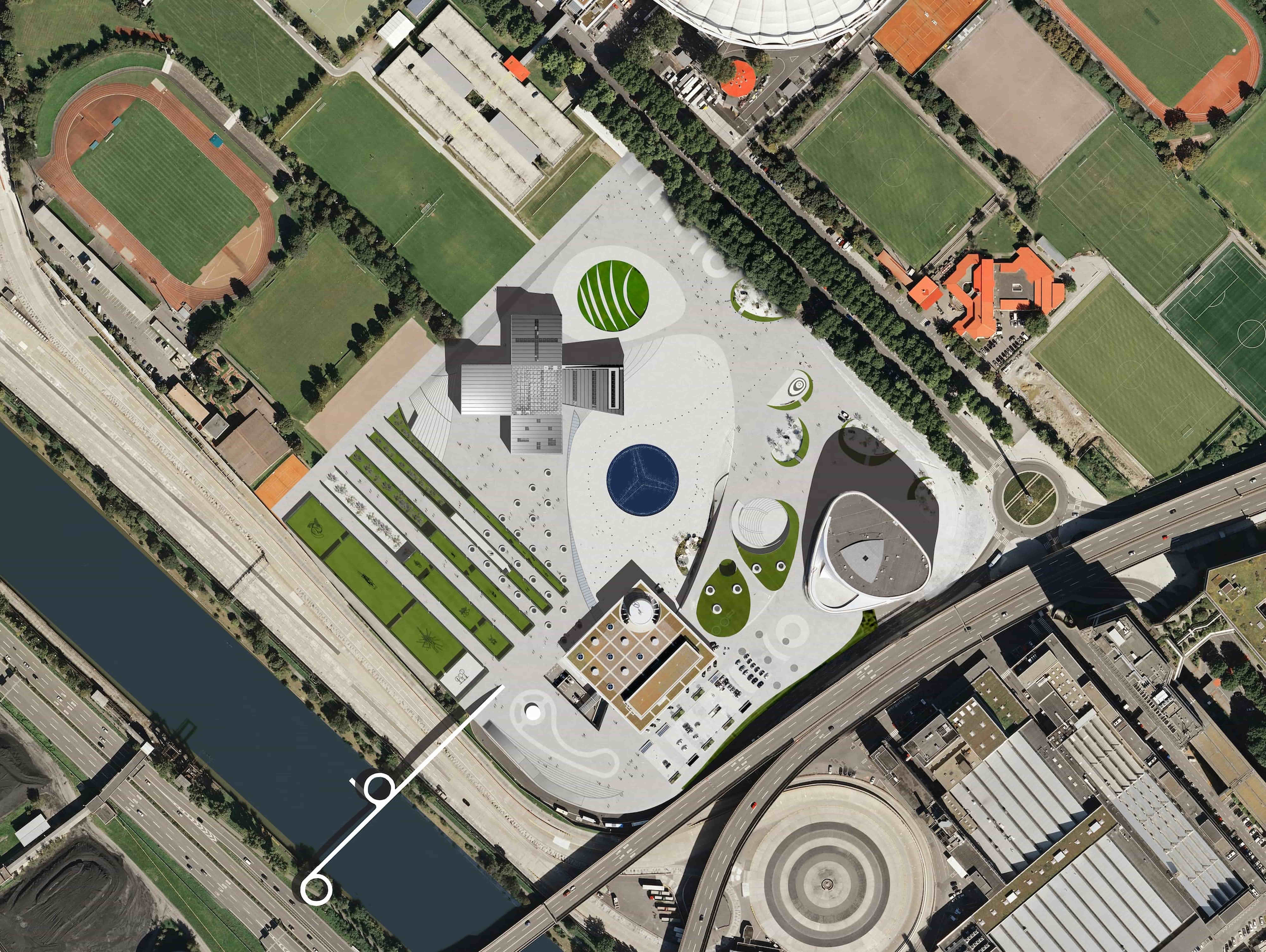 Blending the campus with its context, the rectangular forms of Neckar Park’s sports fields and the organic shapes of the existing stone plinth are drawn onto the new landscape from the northwest and southeast, respectively.