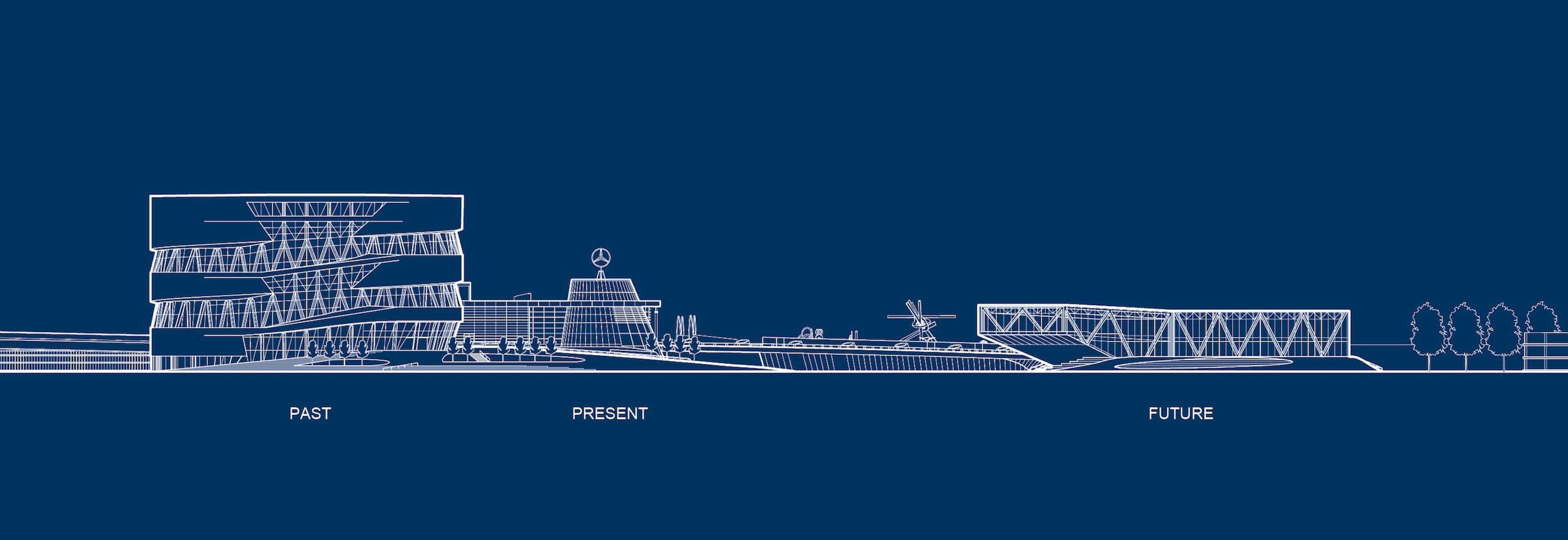 To fulfill this potential and construct a coherent narrative about the brand’s impact on state-of-the-art mobility, the Mercedes-Benz Future Lab is added to the constellation. Part exhibition hall and part factory for creating, debating, and presenting the indeterminate future, the Future Lab exposes the future’s possibilities in vivid presentations. Its addition completes a nucleus for the brand’s past (Museum), present (Center), and future (Lab).