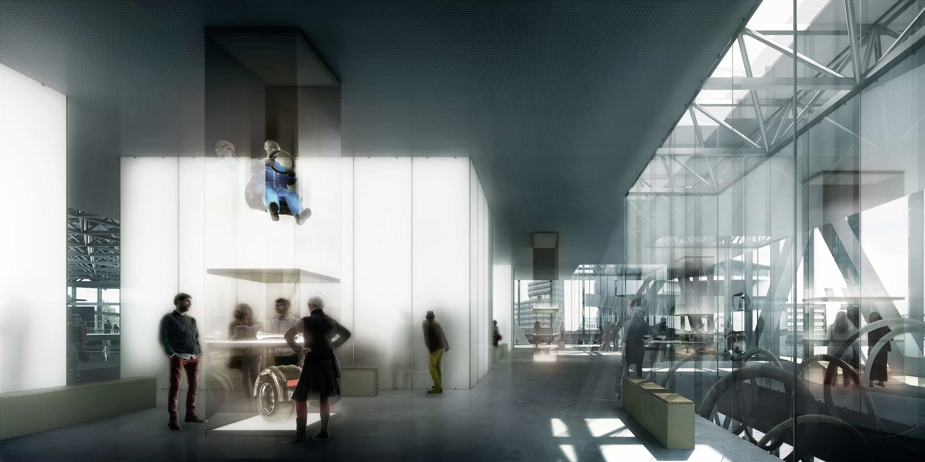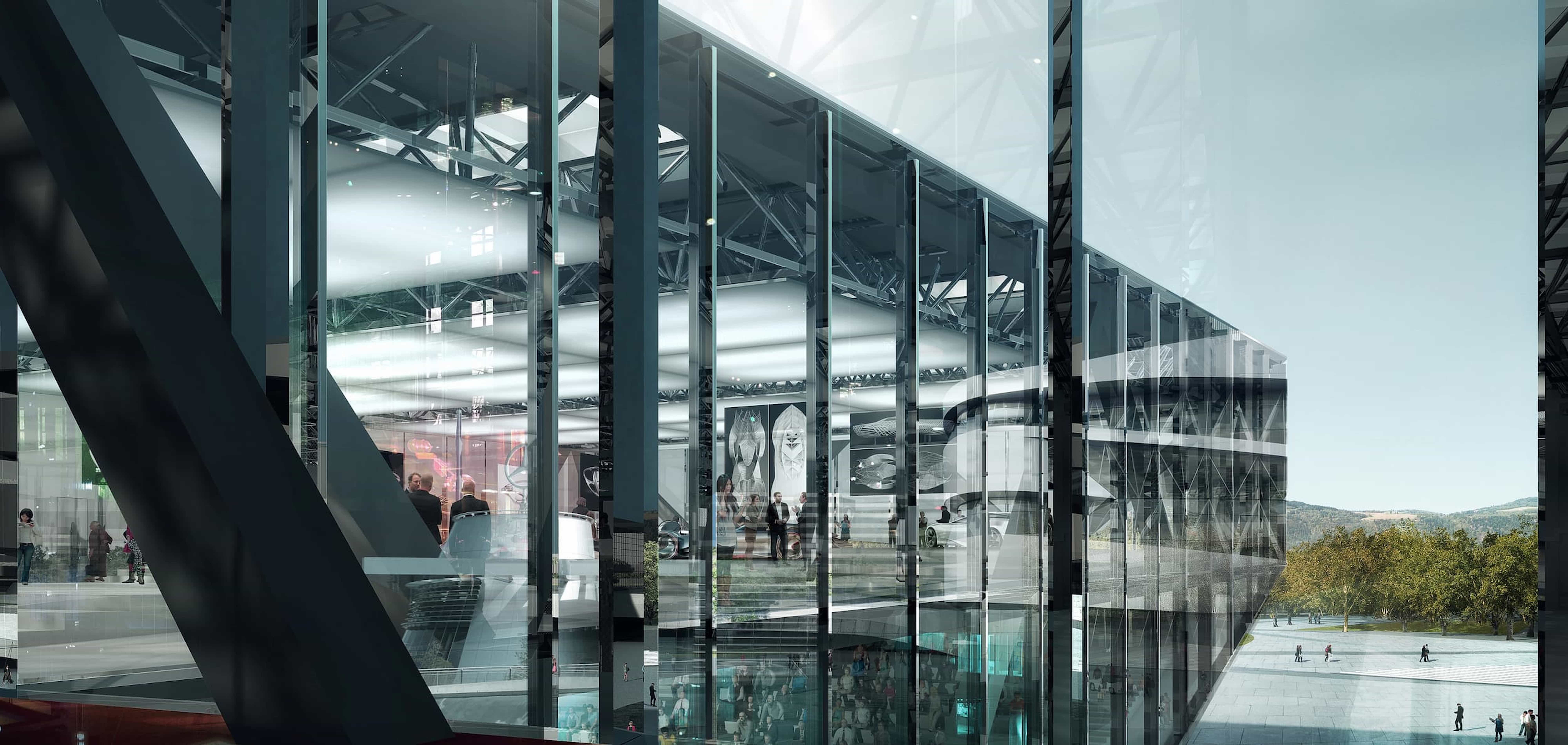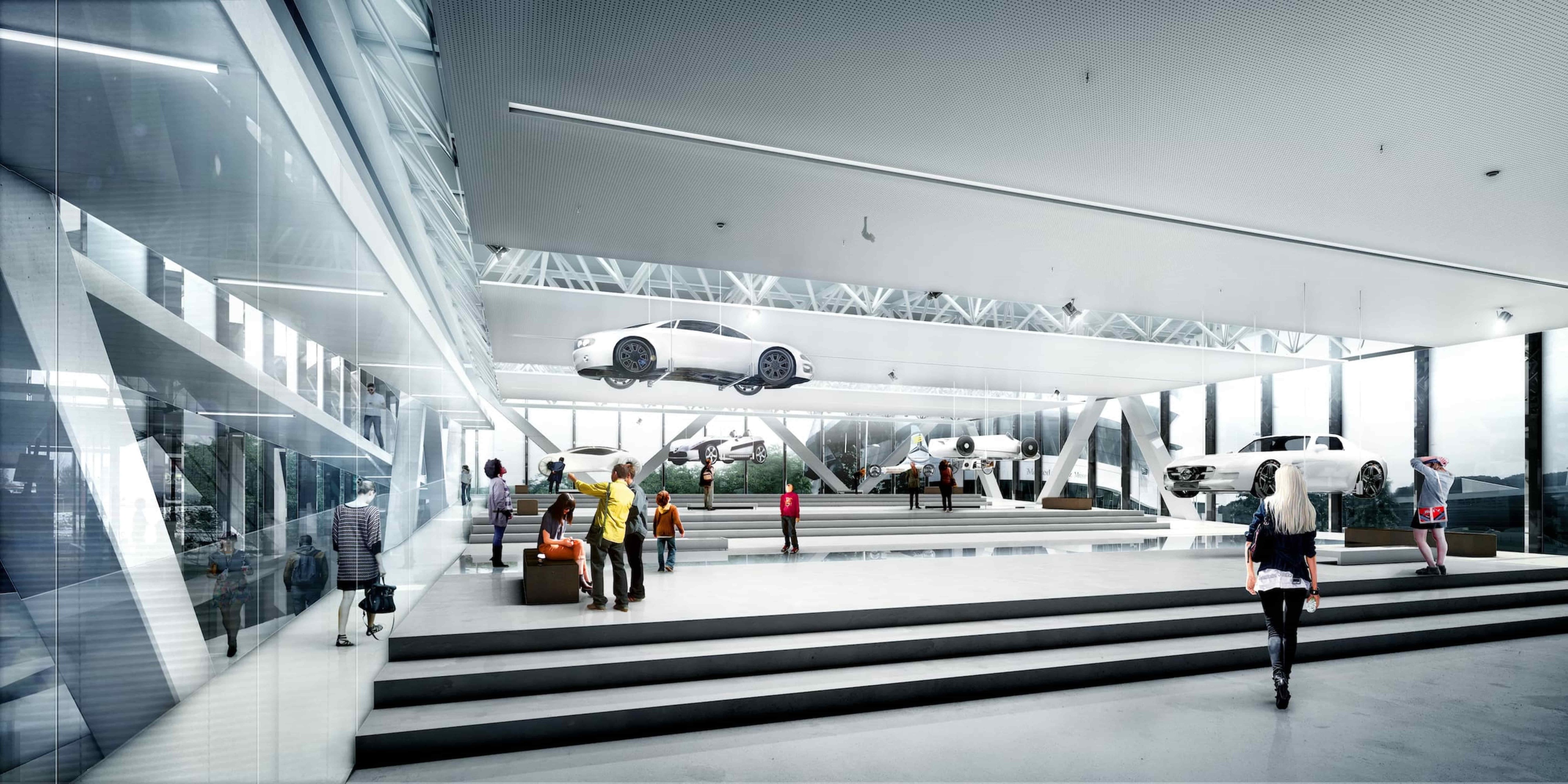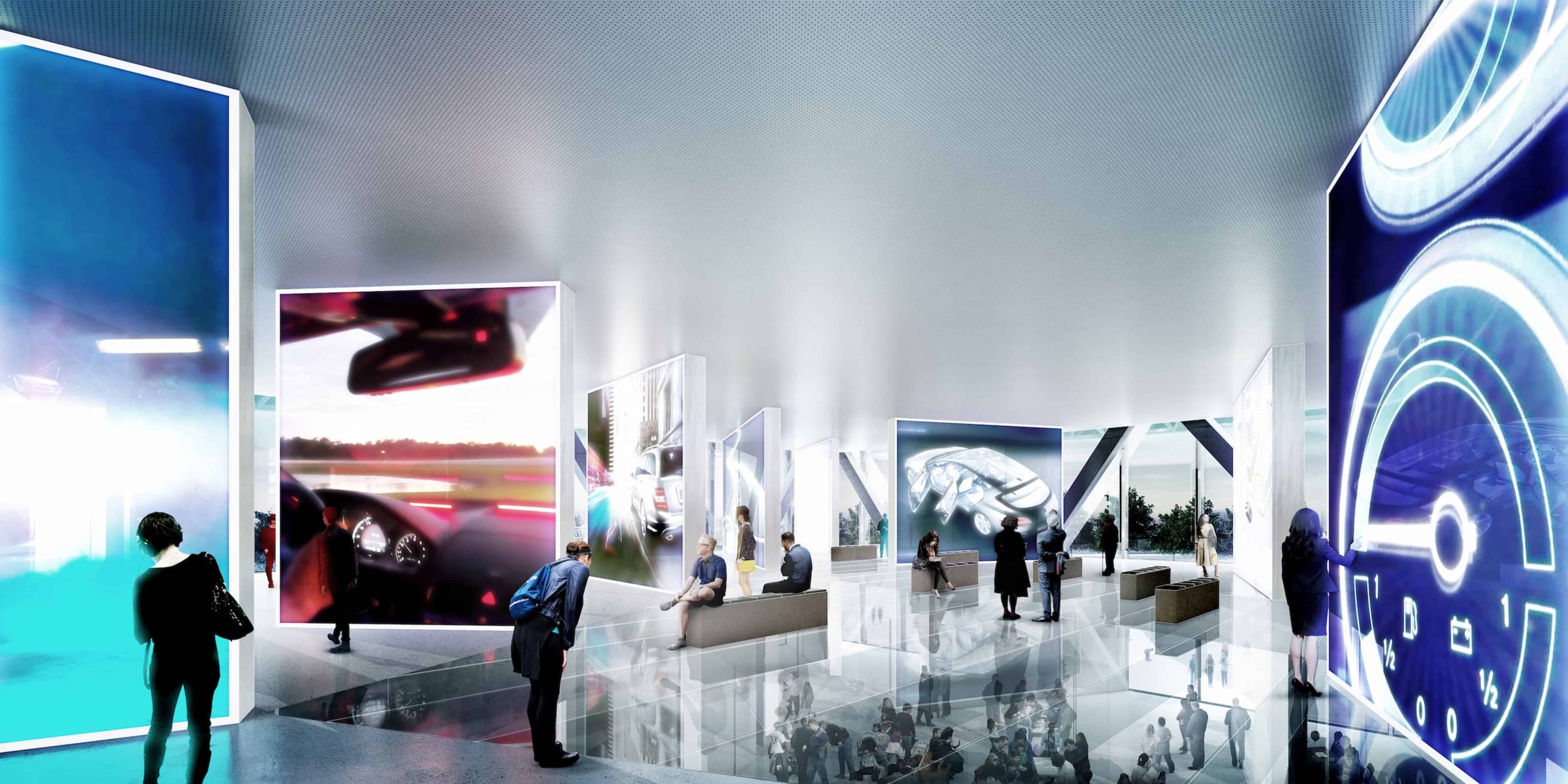 PROGRAM Campus expansion with Amphitheater, Central Plaza, Classic Center for showcasing legacy automobiles, Sculpture Garden, and Future Lab: a museum for the brand’s impact on state-of-the-art mobility and a factory for creating, debating, and presenting the indeterminate future; including exhibition space for showcasing research and development activities, and (A-Z) art gallery, café, club lounge, education spaces, laboratories, lecture hall, offices, and workshops