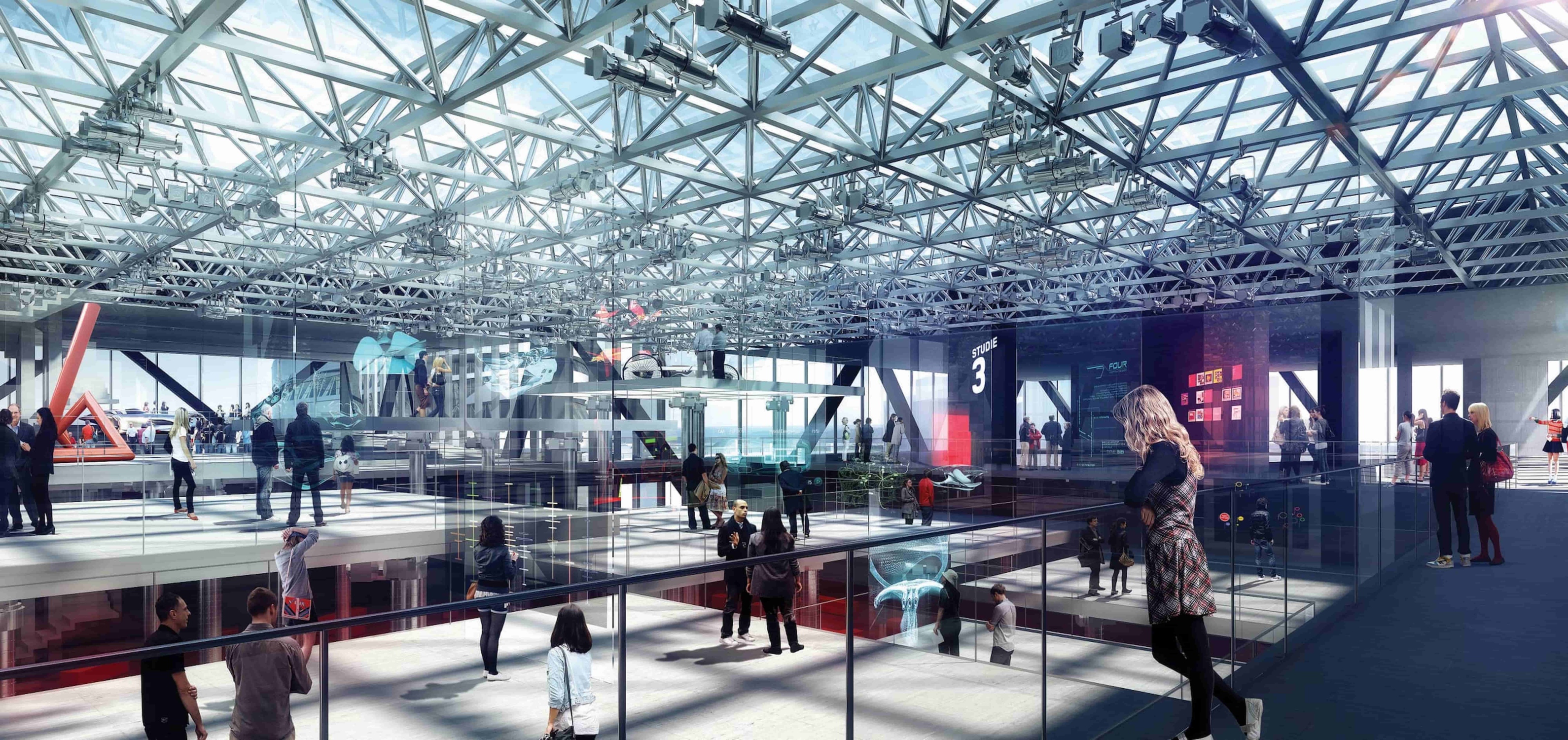 Upon entering the Future Lab, the Create-the-Future’s functions are ordered on the arrival level into clusters of programs with the most specific and divergent needs: Laboratory, Lecture Hall, White Cube, and Genius Workshops. Their distinct programmatic requirements are accommodated by tailored architectural responses within their individual pavilions. These clusters are all individually accessed from a central Foyer and Workshop pavilion to form a hive where urban intensity prevails and functions can be used after hours.