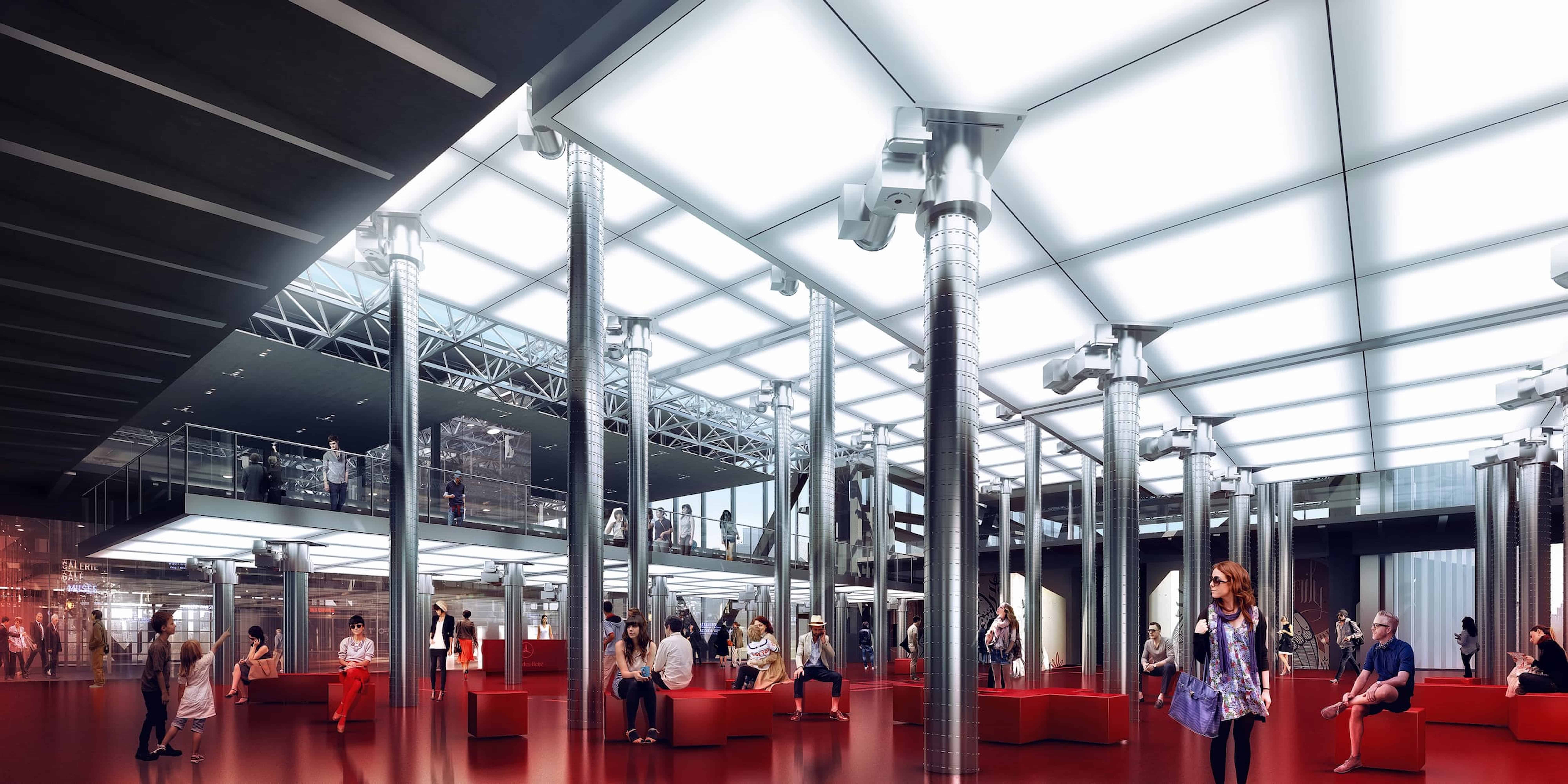 Situated between the Club Lounge and Milk Bar, the prestigious Classic Collections form a connective tissue between the Future Lab and the Retail Classic Center that can be observed from all sides, though not publicly accessed. The lyrical skylights in the existing stone plinth are repeated over these areas in a grid to provide requisite daylight.