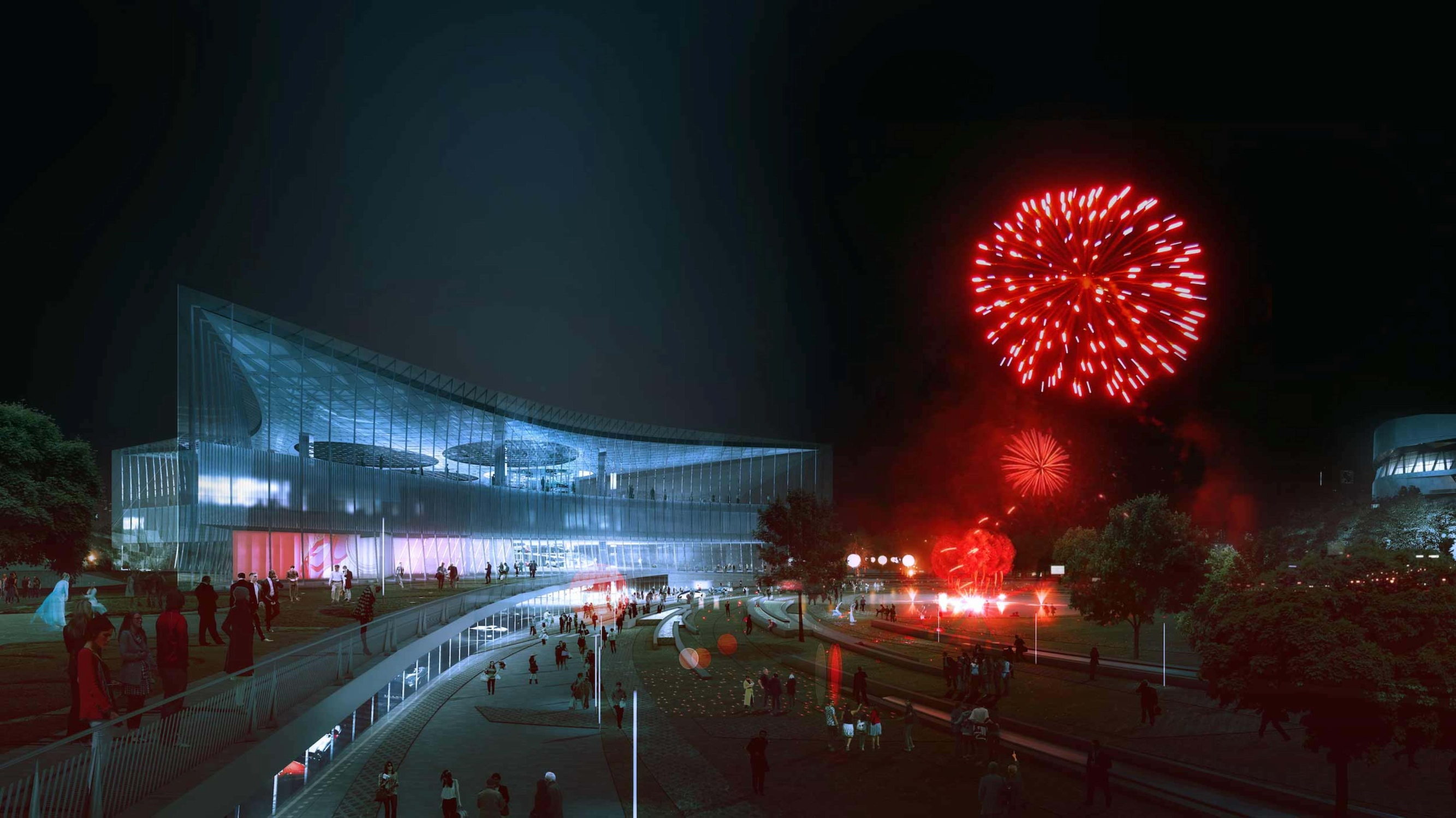 Also latent within the existing plan is the concept of a campus heart. The curving façade of the existing, stone plinth linking the Museum and Center is now extended to form a large oval that delineates a new Campus Plaza into a central landmark: a public event space and a ceremonial parade ground for vehicles.