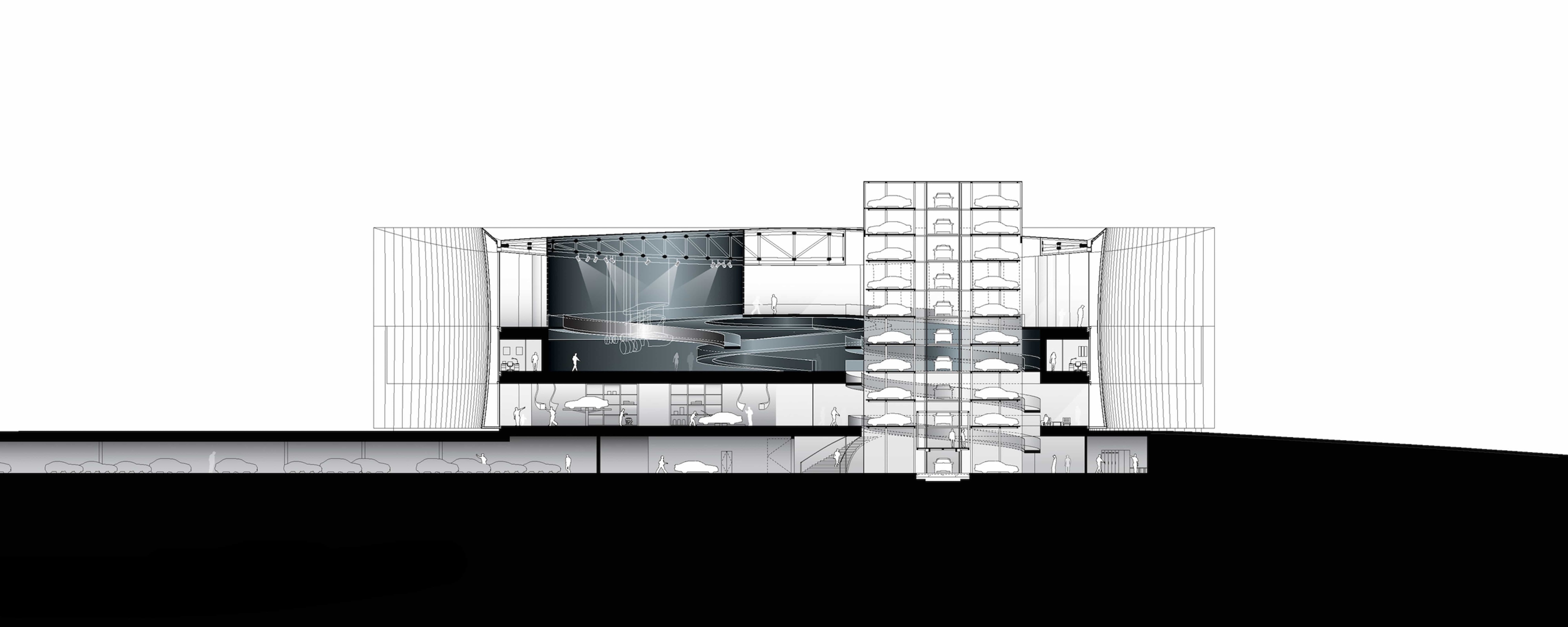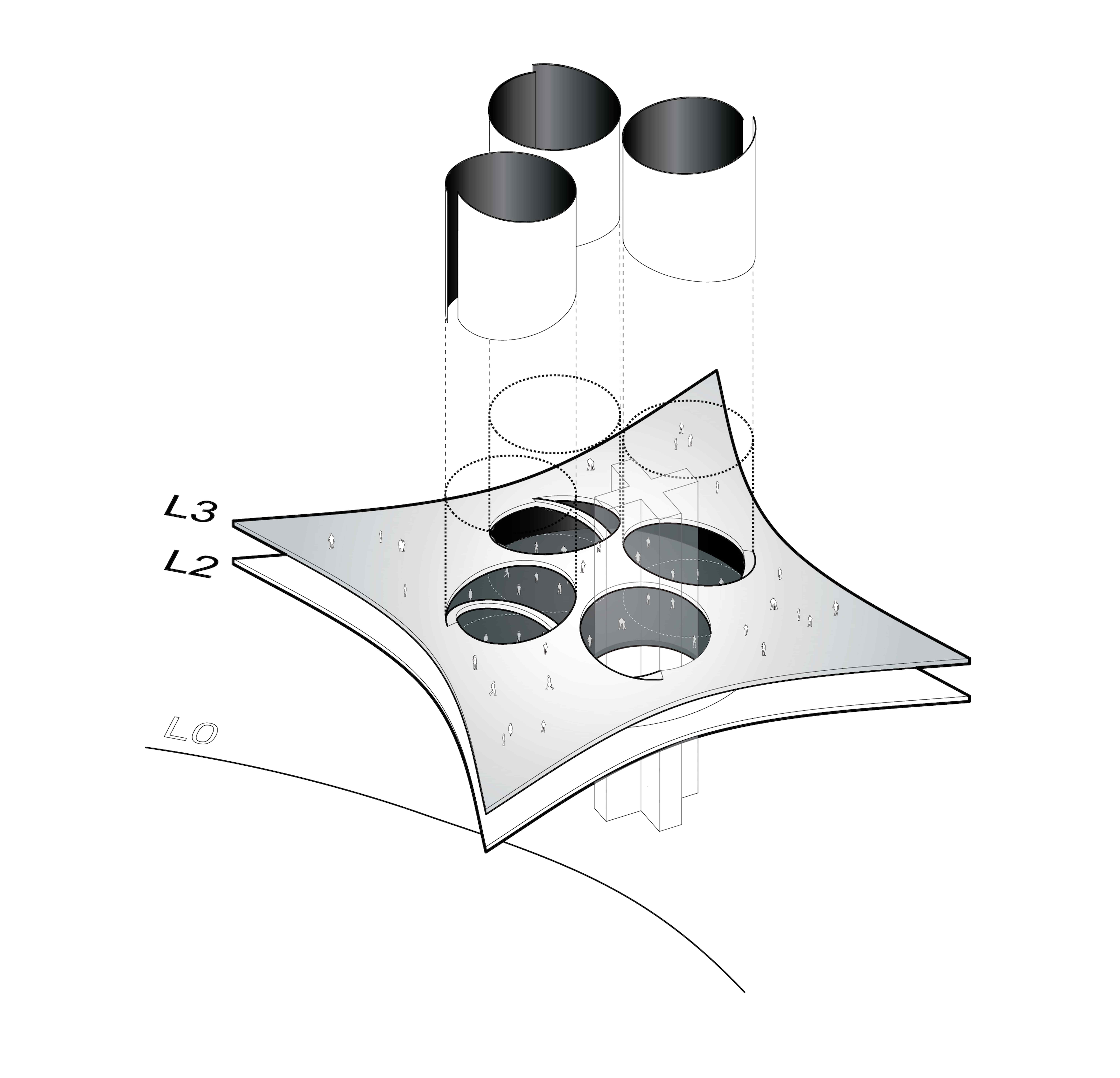 Three Vertical Silos penetrating the Horizontal Plateau to a height of 12.5 m compose the other atmosphere. The Silos land on Level 2 in a large, round room forming a continuous spatial ensemble. Providing societal, technological, and systemic provocations, the Vertical Silos are conceived as stages supporting the use of mise-en-scène, art, and cultural productions. They include a theatrical ceiling grid on which new media technologies can be rigged or heavy objects suspended.