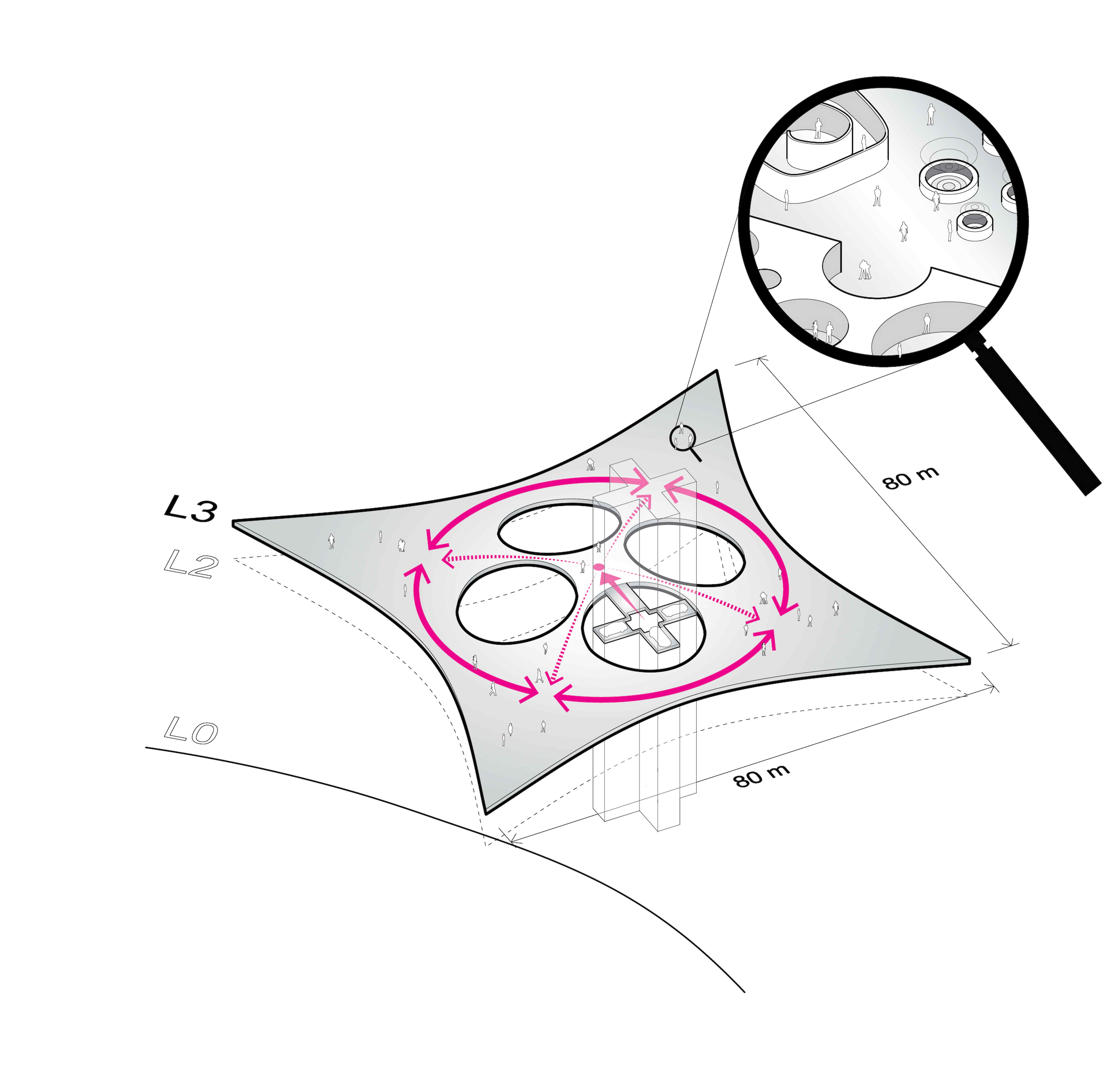 Wrapping around the perimeter of each Silo, circular ramps provide diverse vantage points of that stage’s production. Connecting the Horizontal Plateau on Level 3 to the Vertical Silos’ base on Level 2, these ramps encourage visitors to break and challenge the exhibition sequence curated on the Horizontal Plateau above.