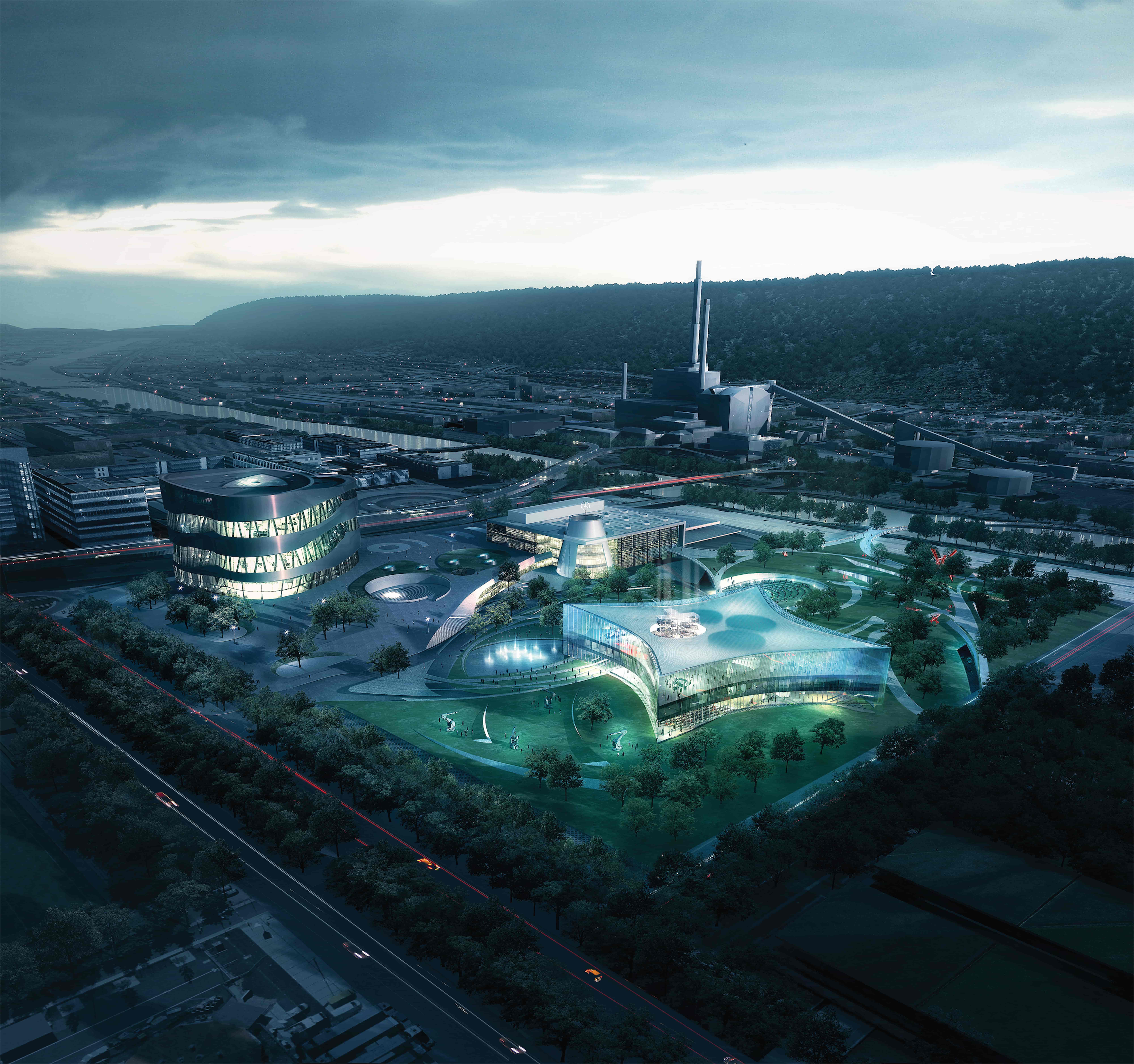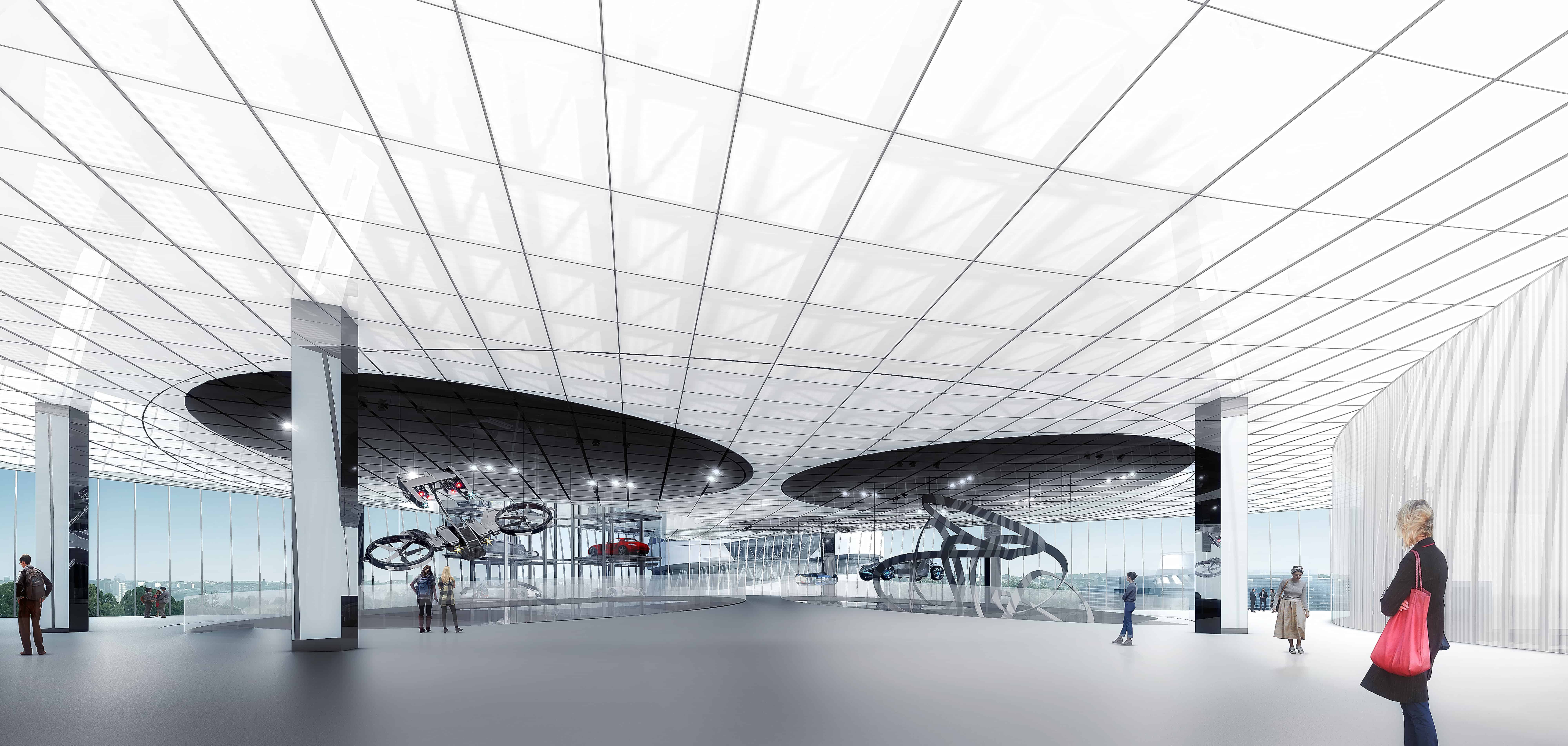 PROGRAM Campus expansion with Amphitheater, Classic Center for showcasing legacy automobiles, Central Plaza, Sculpture Garden, and Future Lab: a museum for the brand’s impact on state-of-the-art mobility and a factory for creating, debating, and presenting the indeterminate future; including exhibition space for showcasing research and development activities, and (A-Z) art gallery, café, club lounge, education spaces, laboratories, lecture hall, offices, and workshops