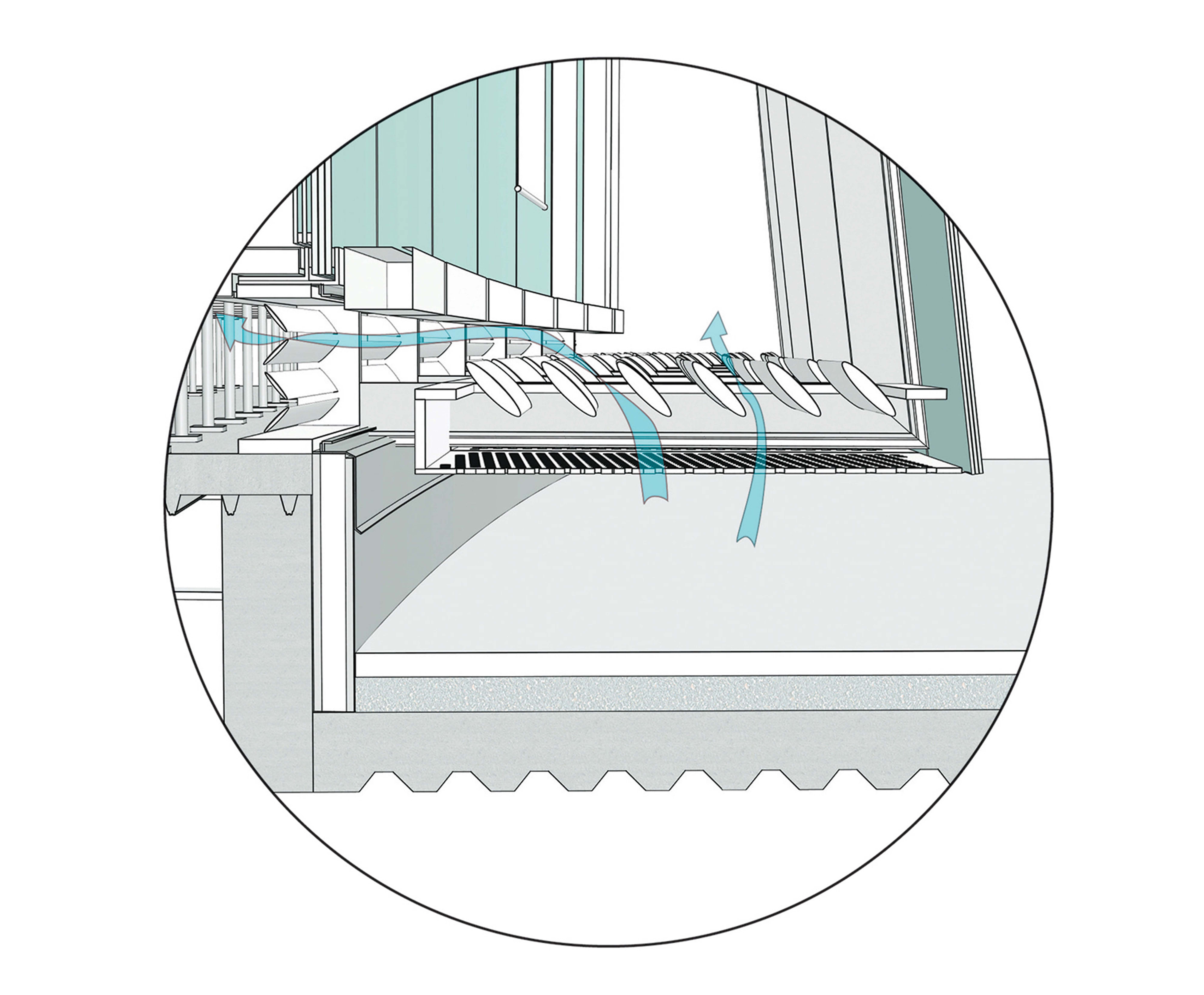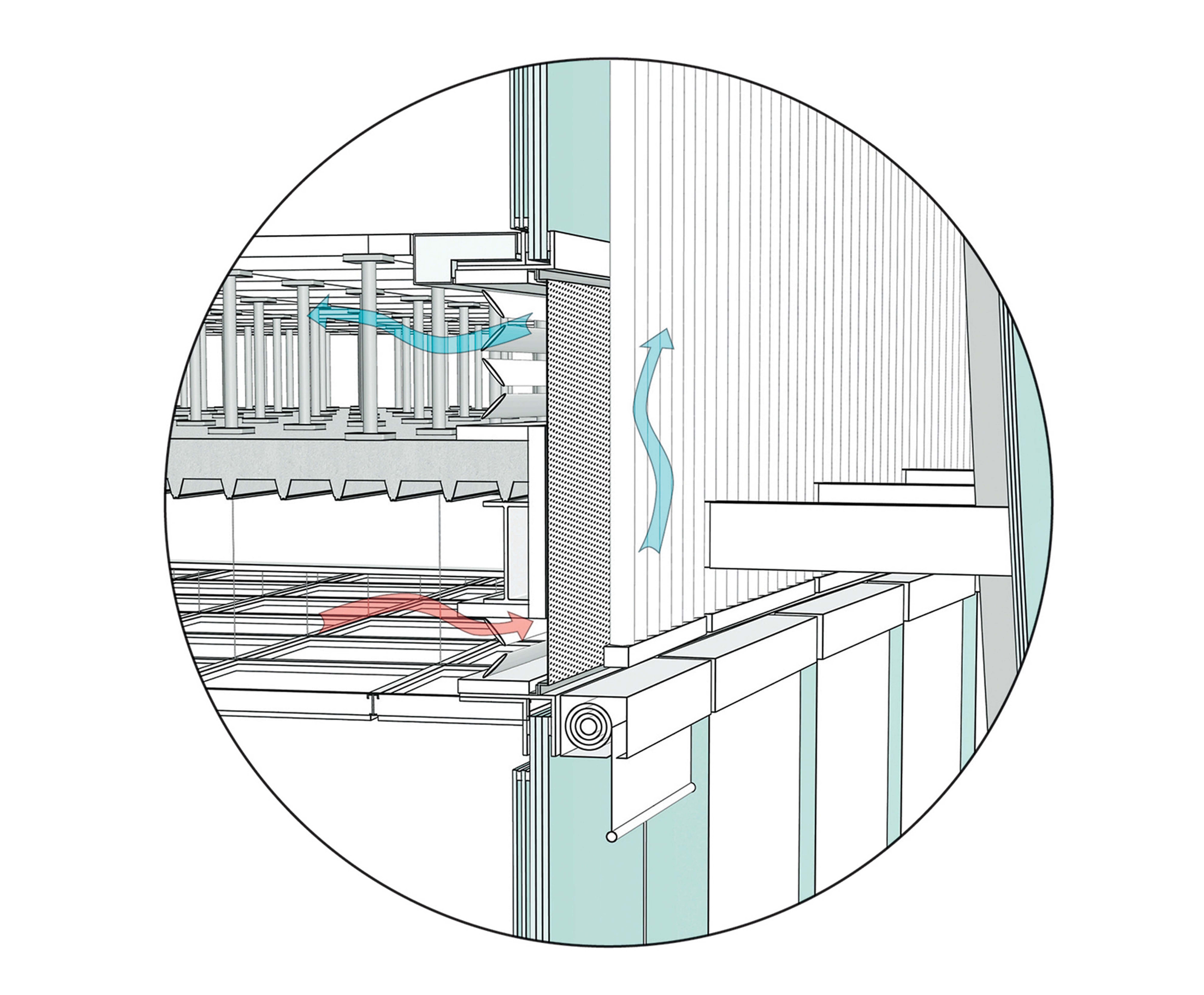 The double-skin/air cavity system is a highly insulated barrier that mitigates the fluctuations of external temperatures. In addition, the air cavity creates a chimney stack effect which allows natural and mixed-mode ventilation, as well as heat recovery or discharge. Intake and exhaust vents at the base and head of the wall, respectively, draw fresh air into the building’s raised floor plenums, and suck used air back into the cavity via ceiling plenums.