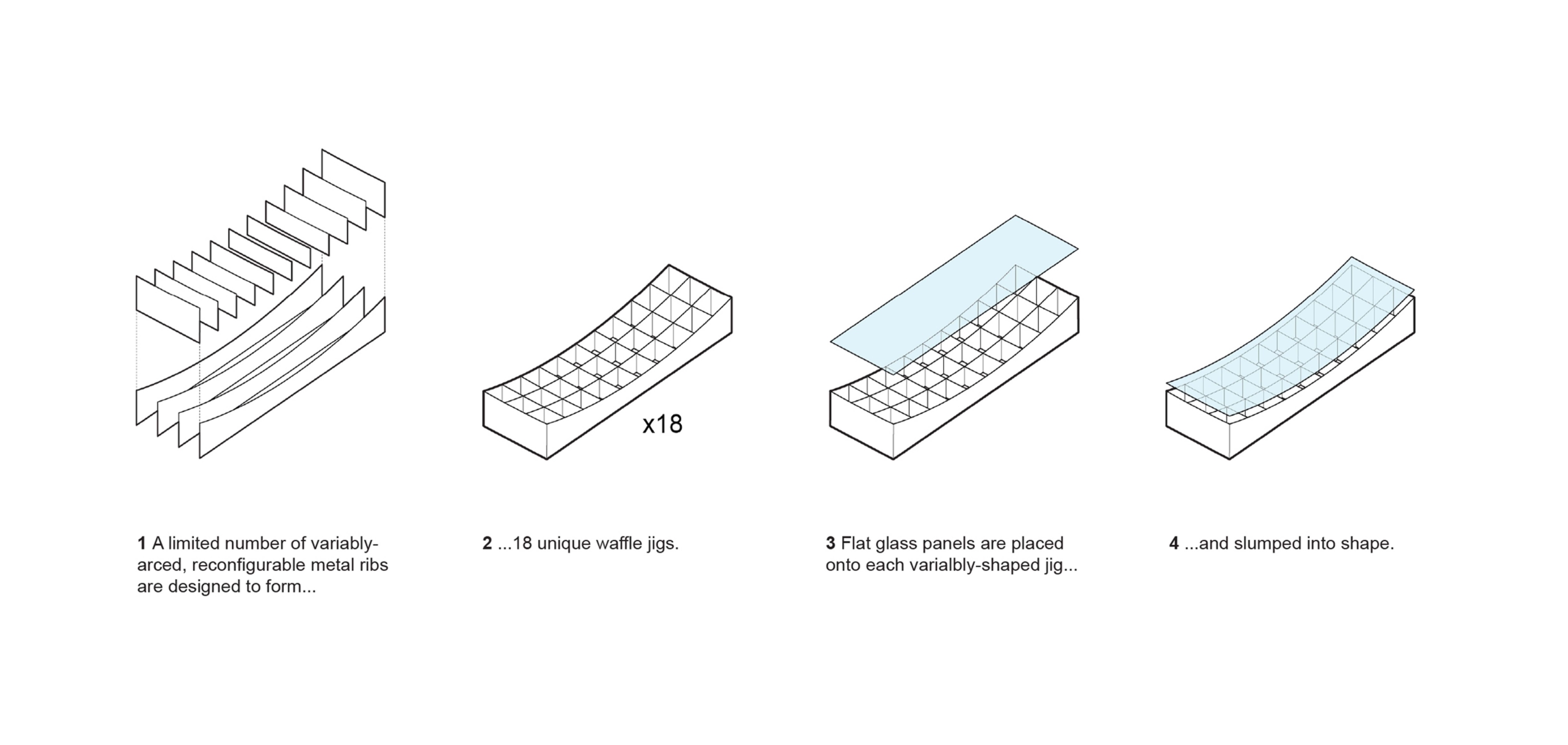 To further optimize costs, the 18 unique jigs are created through a limited number of reconfigurable arced metal ribs.