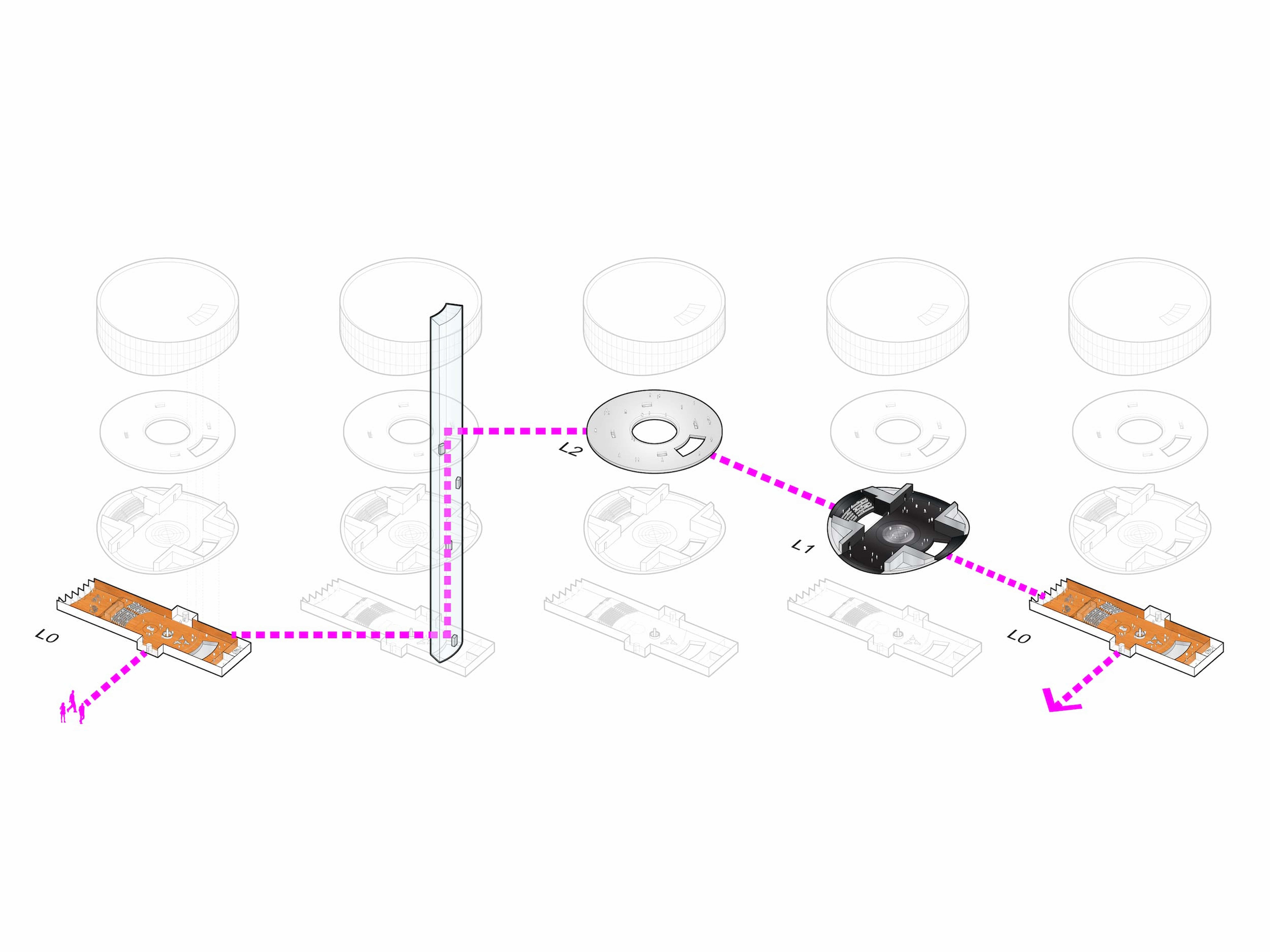 The Future Lab’s ever-changing nature is experienced fully in its gallery space. A dynamic canvas, it is divided into three radically distinct architectures: the Near Future (Level 2) at the building’s top, where visitors can connect its content to the ‘immediacy’ of their surroundings; the Far Future (Level 1), an immersive environment that becomes the visitors’ last impression as they leave the building; and the Future Core, a dynamic cylinder that mediates between the two and pierces through their center.