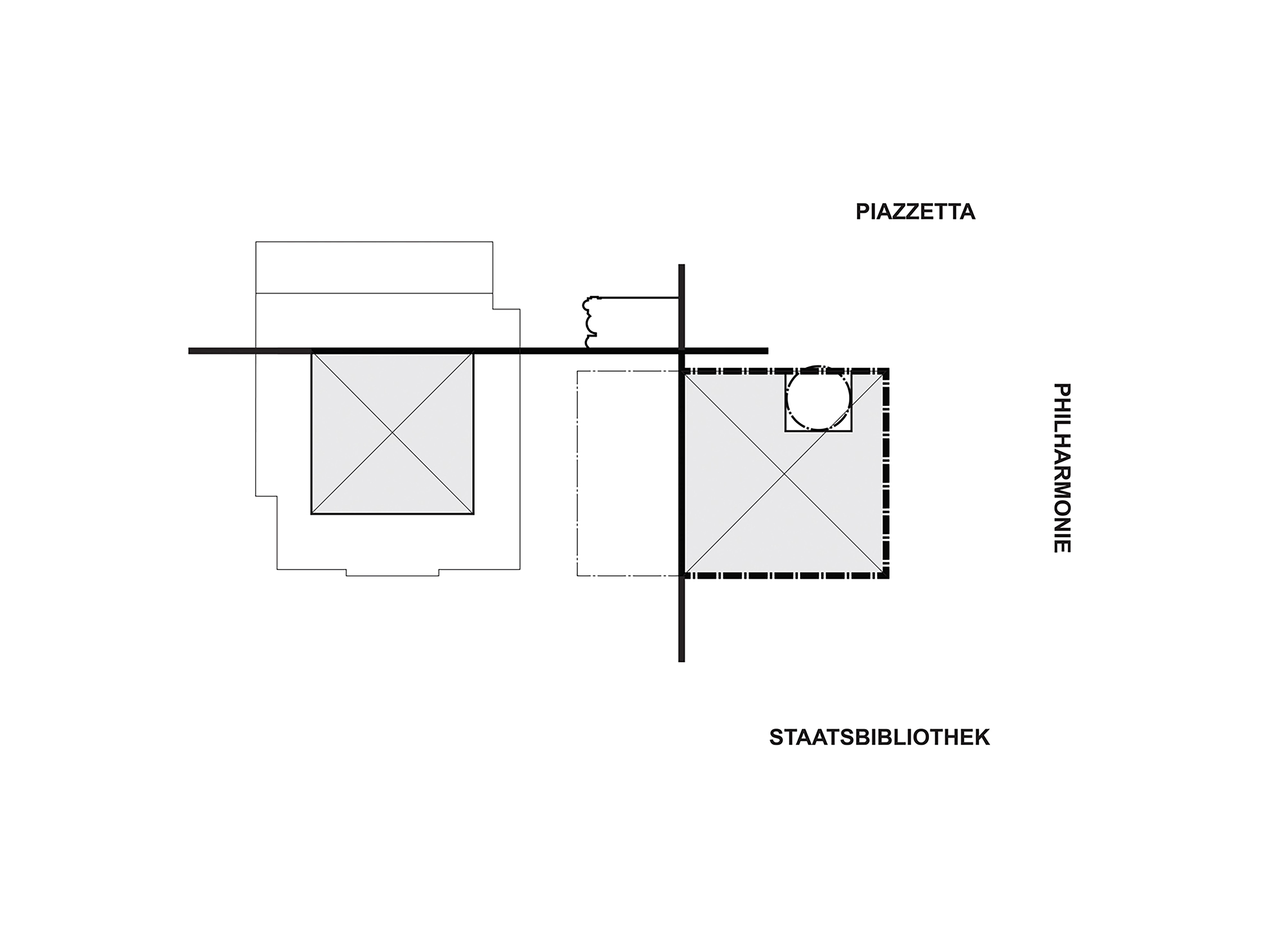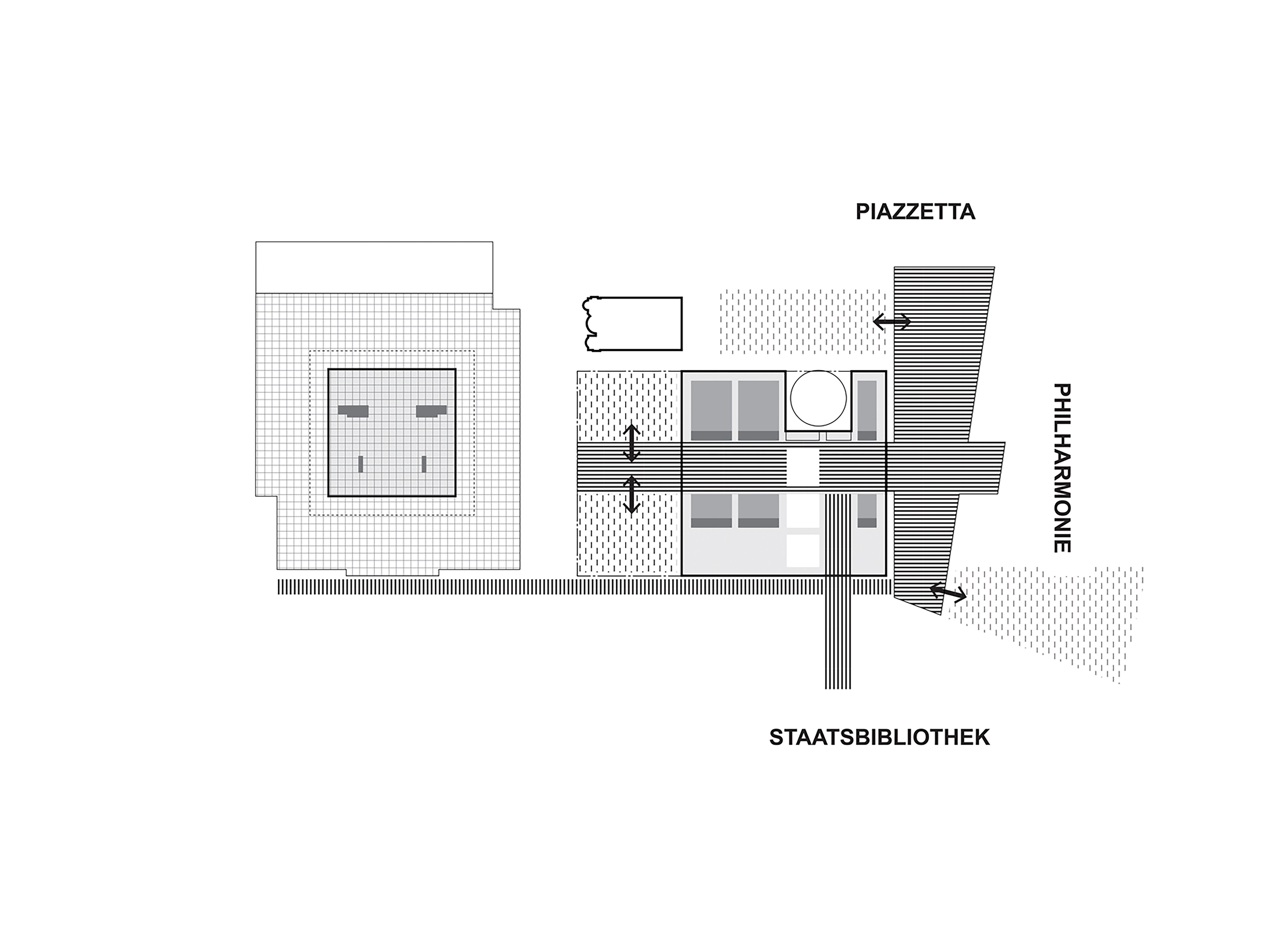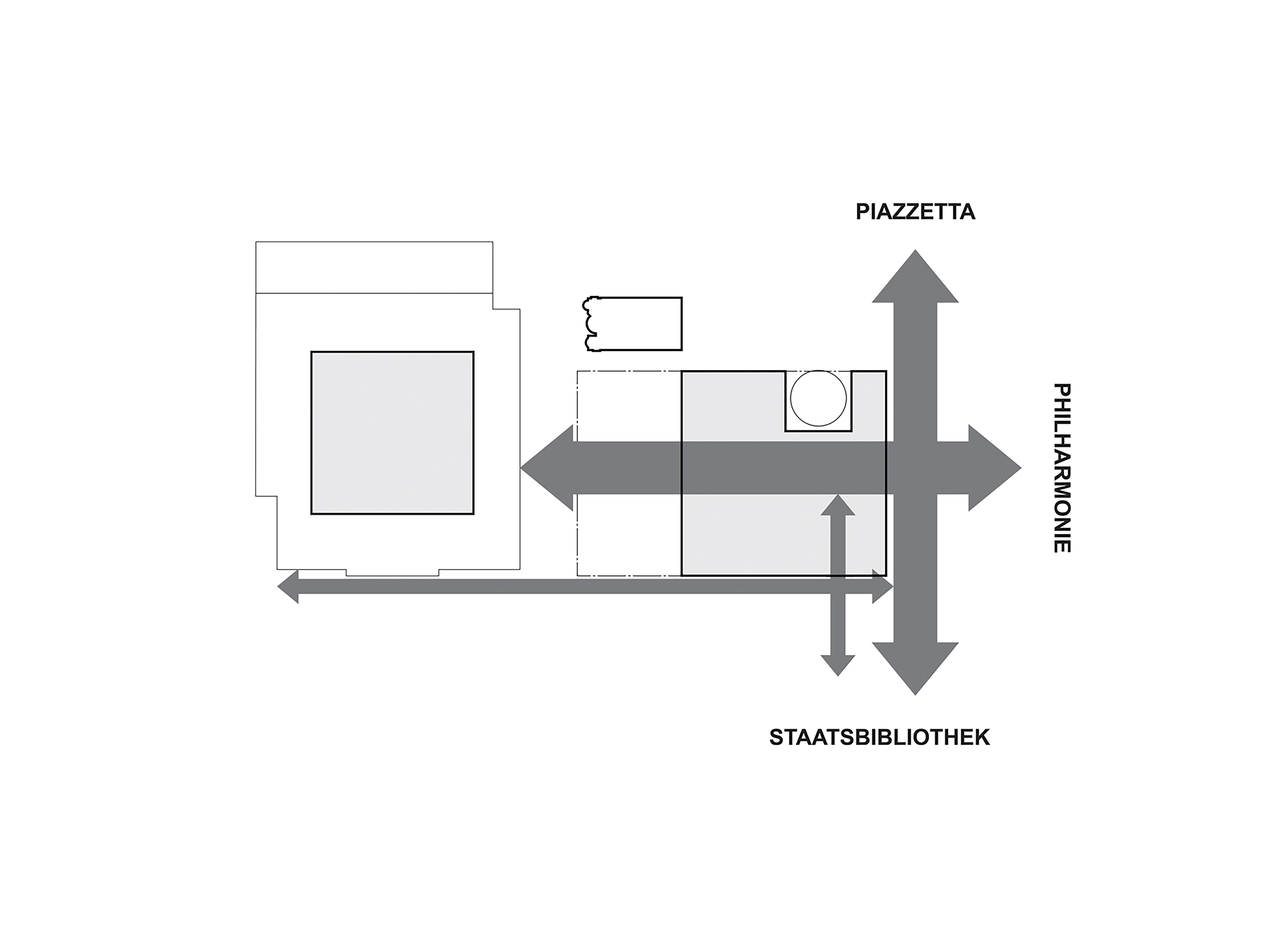 Two major axes transect and organize the site and The Museum’s connections to its neighbors. The north-south axis from the Philharmonie to the Neue Nationalgalerie traverses through The Museum. The east-west axis passes between The Museum and the Kammermusiksaal, from the Piazzetta to the Staatsbibliothek. Two minor axes complete the site’s hierarchy: the first along Potsdamer Strasse connects The Museum and the Neue Nationalgalerie, and the second from the Plane Tree through The Museum, and across to the Staatsbibliothek, folds the latter more closely into the Kulturforum. These four axes organize a new primary pedestrian circulation for the Kulturforum, while offering significant public spaces.