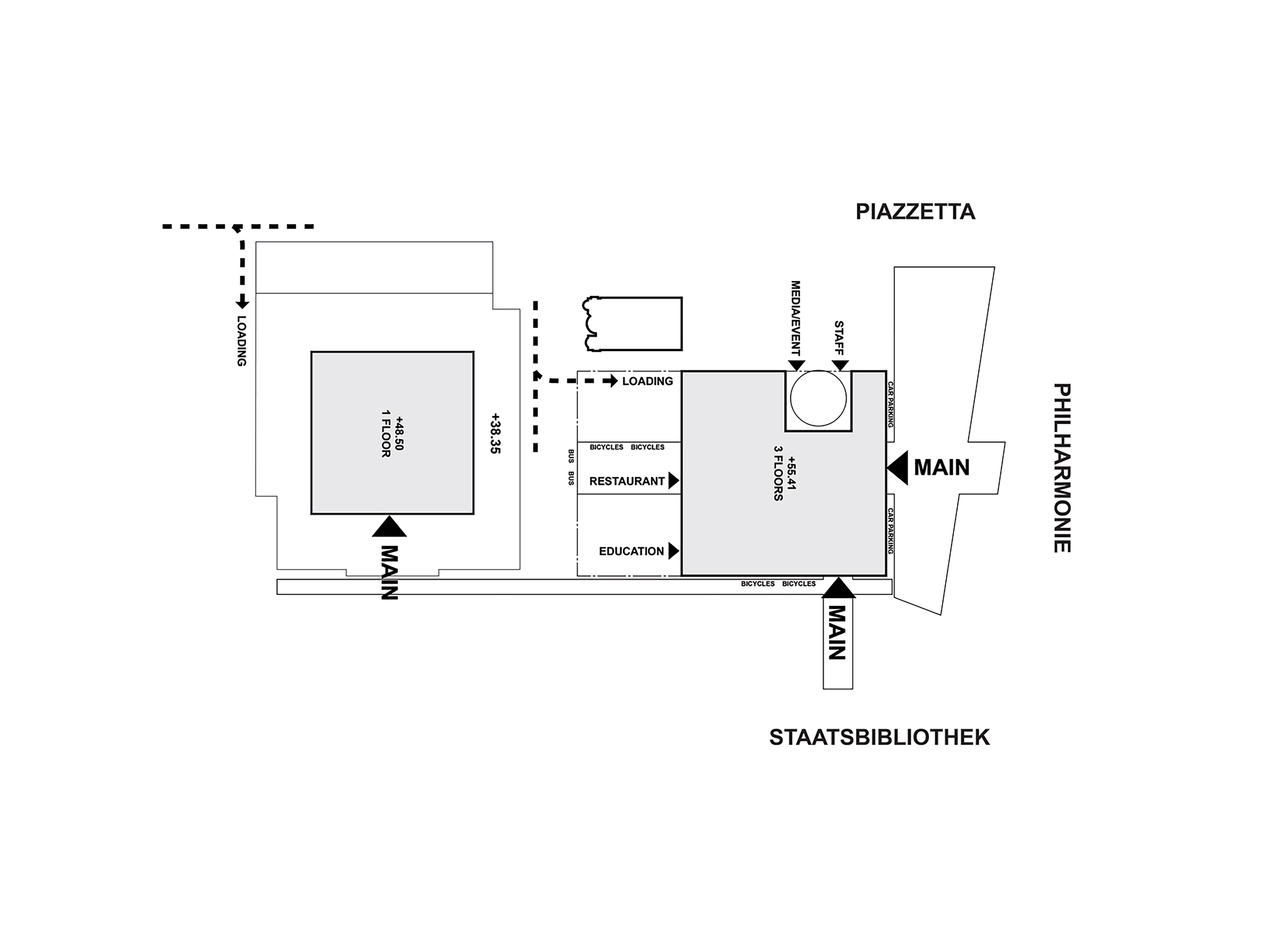 The two public entrances of The Museum take advantage of the site’s pedestrian circulation axes and maximize The Museum’s relationship to the Neue Nationalgalerie. The Museum’s entrance on Potsdamer Strasse connects—via the new, granite-paved pedestrian axes—with the Neue Nationalgalerie’s entrance as well as to the grounds of the Staatsbibliothek. Additional entrances are dedicated to certain functions that can remain open while The Museum is closed: Restaurant/Bar, Education/Art Appreciation, Museum Shop, and Media/Event Space. They face the building’s open spaces and the Plane Tree courtyard.