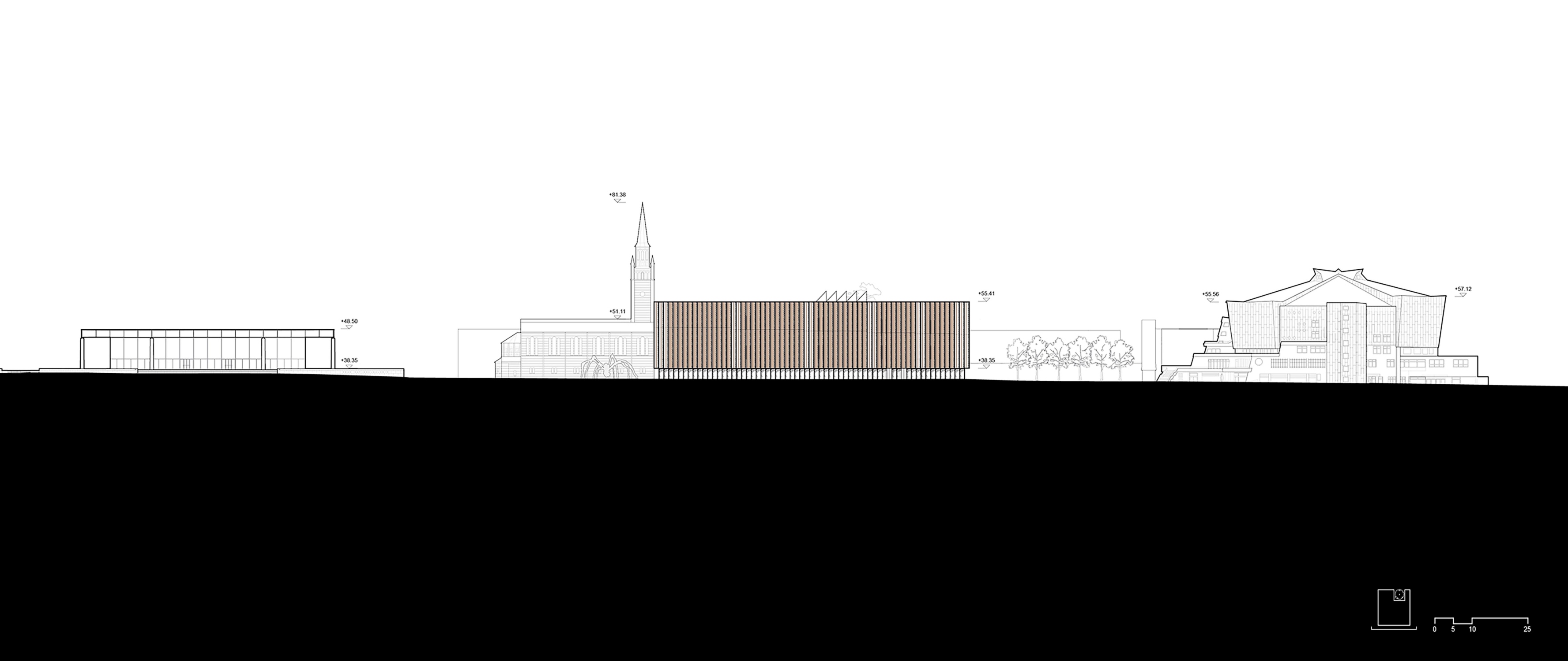 The site’s east-to-west slope is integrated within the building, enabling the 6 m heights necessary for the Media/Event Space on Level 0 and the Marx Collection on Level -1. By placing the Changing Exhibitions Gallery on Level -1—and cutting out the Level 0 floor slab above it—that gallery also achieves extra high ceilings, as well as sightlines from the public and education functions on the ground level (Foyer, Restaurant/Bar, Education/Art Appreciation, Shop, and entrance to the Media/Event Space).