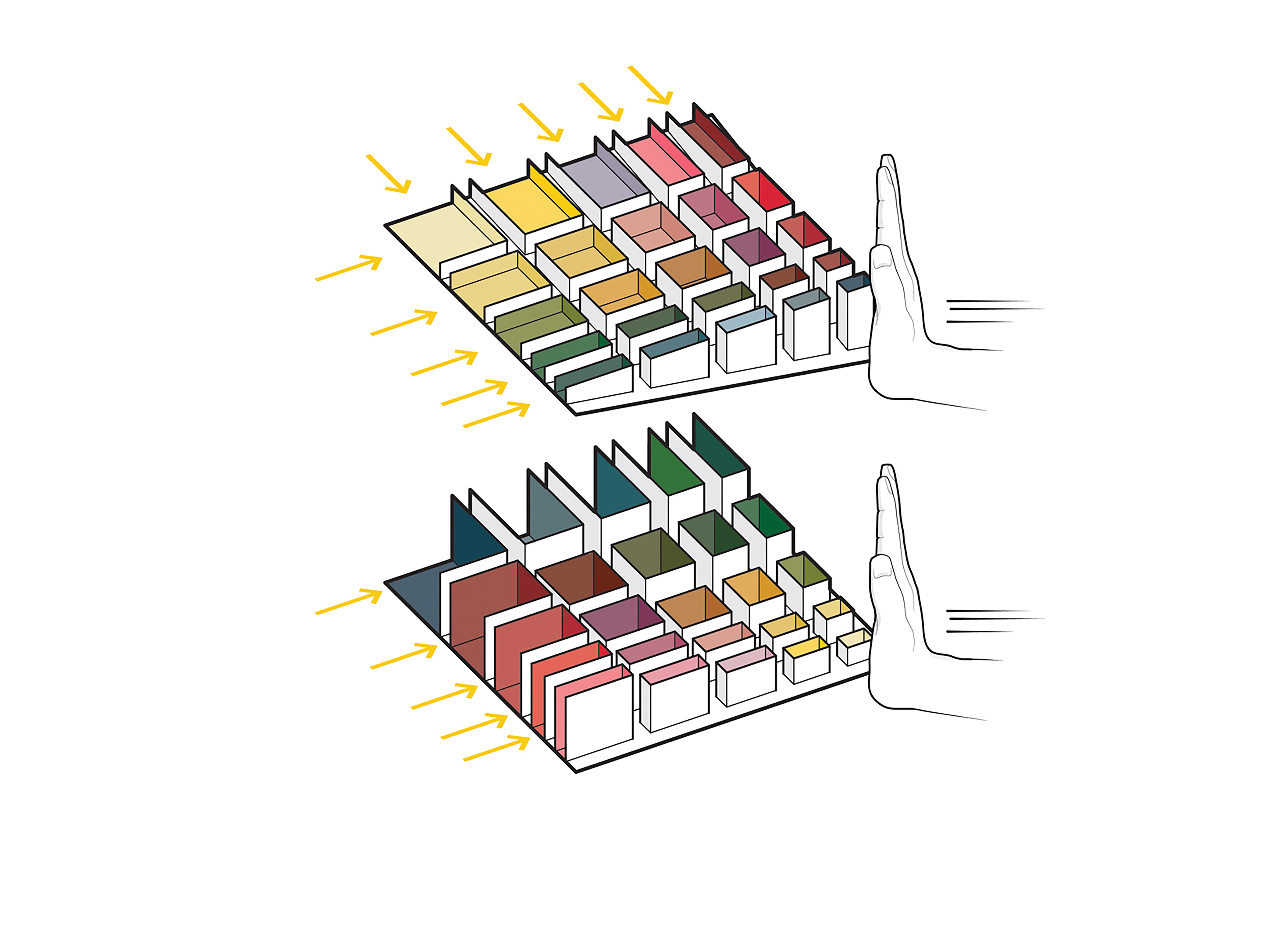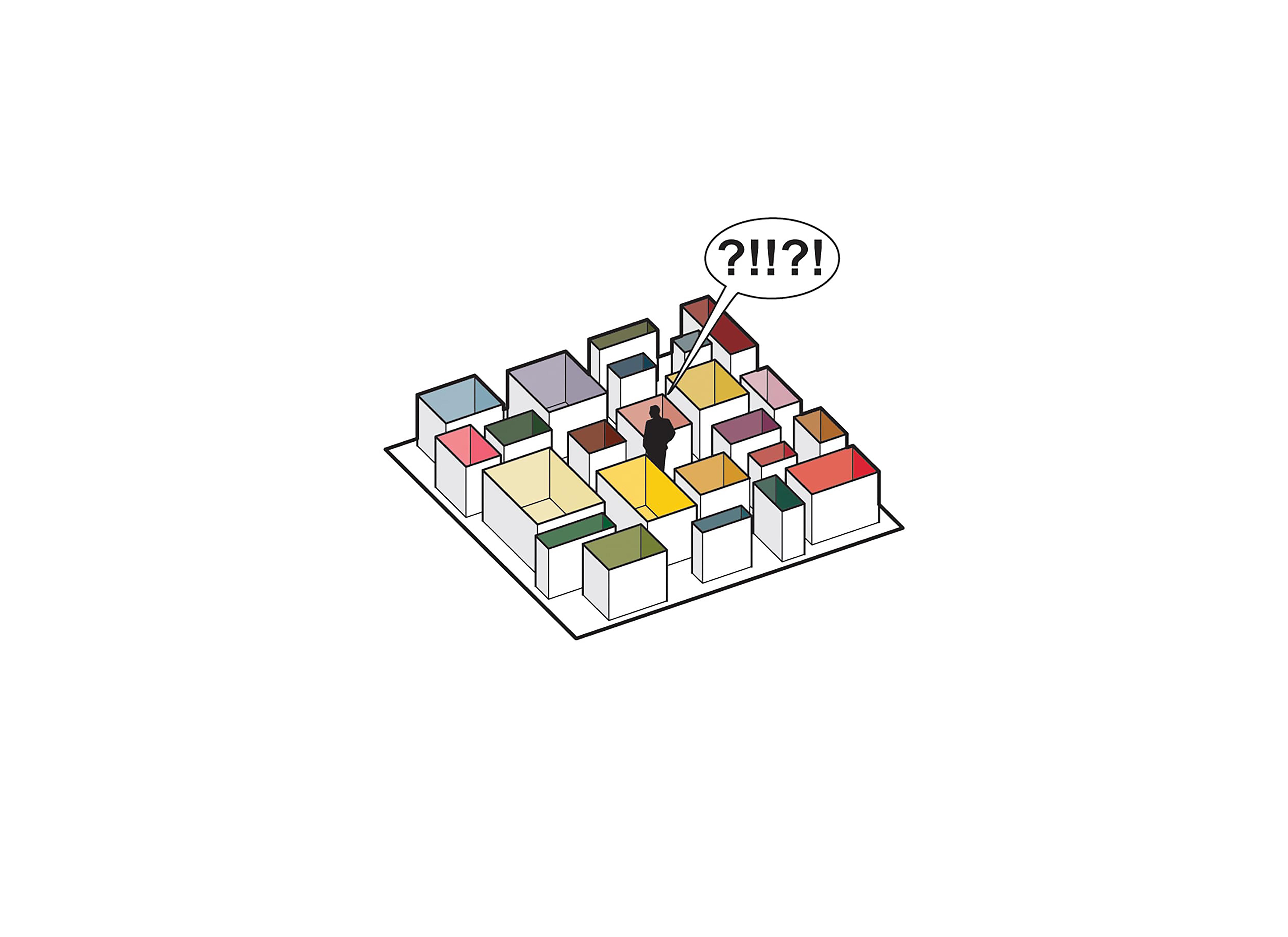 A random field of galleries—each endowed with distinct characters—provides individual choices of routes and modes of perception, but renders the overall collection and individual thematic complexes difficult to organize and illegible. Intuitive wayfinding is obfuscated, causing futile wanderings.