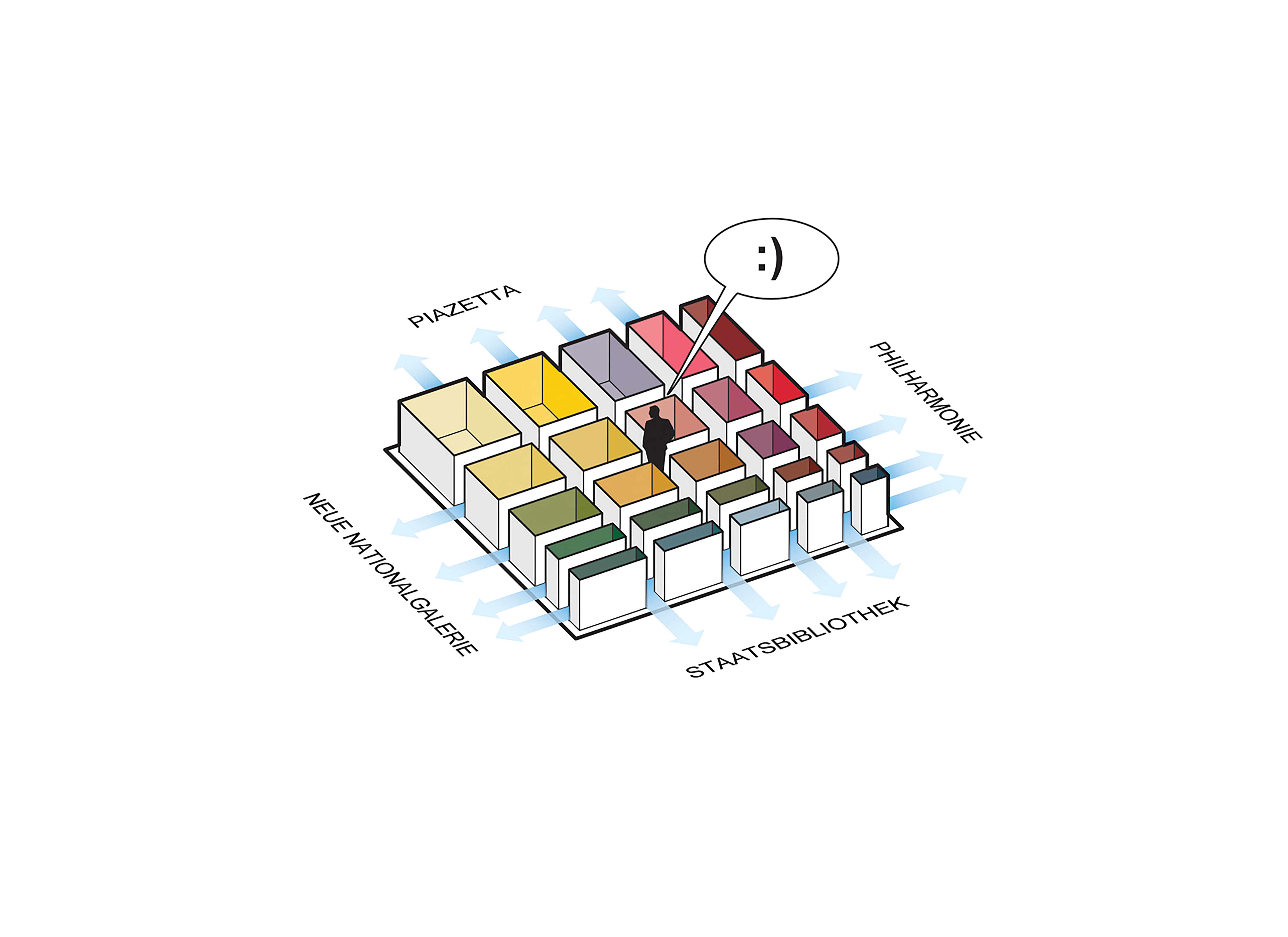 A gradational grid of galleries, however, offers curatorial clarity and facilitates self-navigation, while still offering diversity in room character, size, and proportion, as well as multiplicity of experience and individual choice of route. From anywhere on the floor, patrons can see the Neue Nationalgalerie, the Piazzetta, the Philharmonie, and the Staatsbibliothek down the hallways created by the matrix, further aiding orientation.