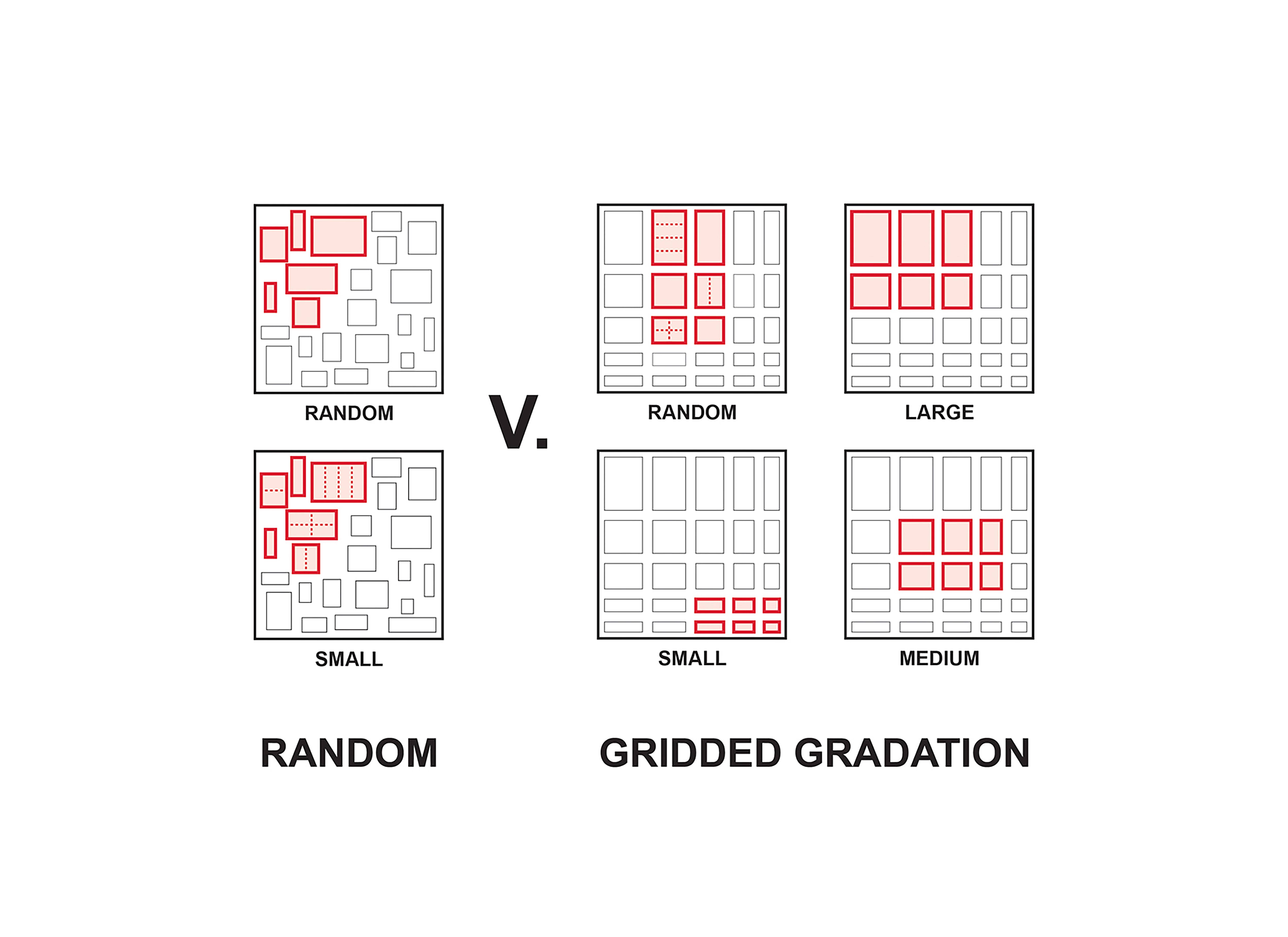 Unlike an arbitrary assemblage of rooms of various sizes which limits curatorial ‘play’ to a haphazard combination or a constellation of small rooms only (via divided larger galleries), the gridded gradation expands curatorial freedom as it provides flexible zones of potential collaborating galleries for any exhibition or theme desired: all large galleries, all small galleries, mixed gallery sizes (via division of some larger galleries), or even all medium sized galleries (by organizing a show in the center.)