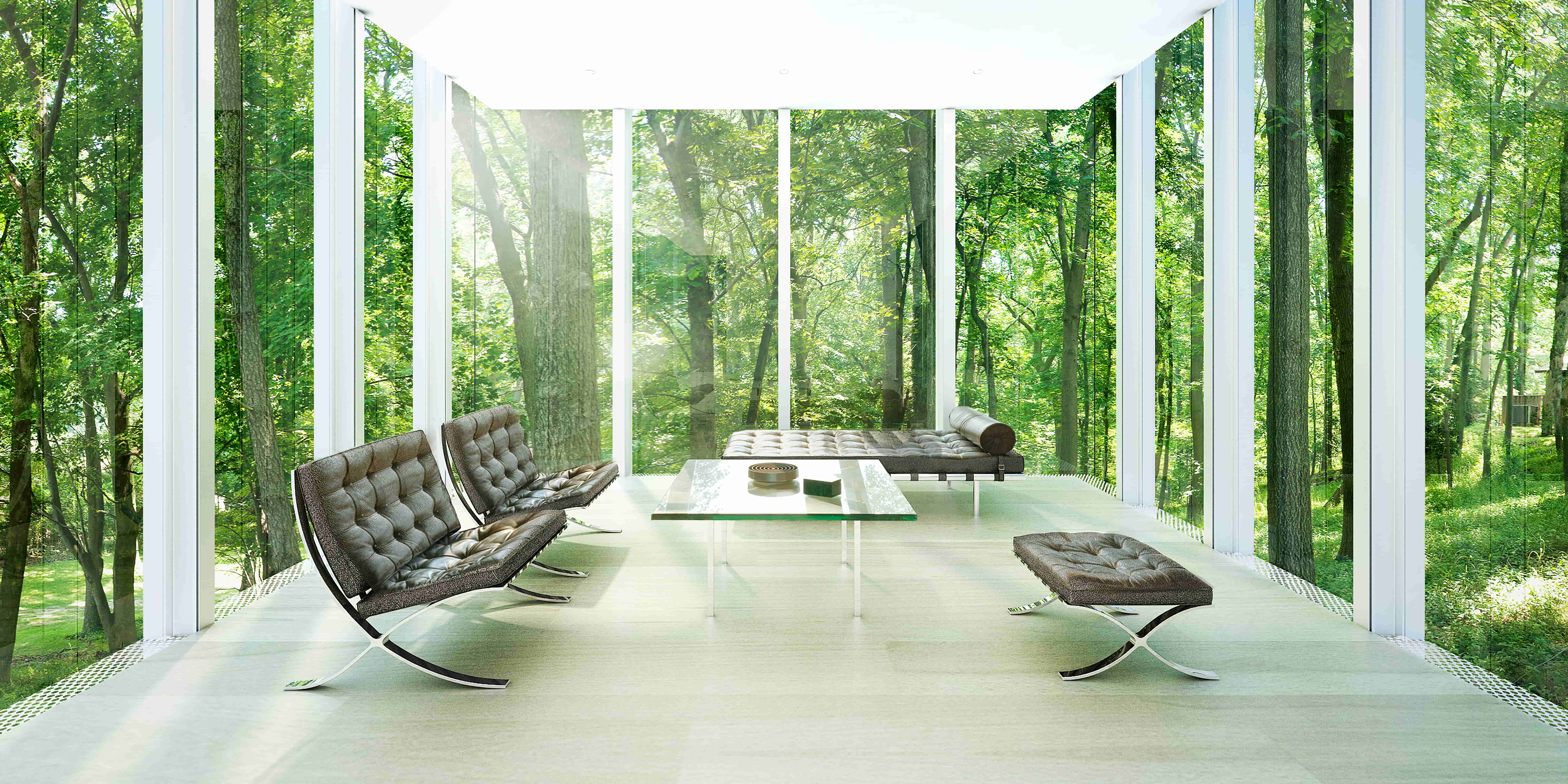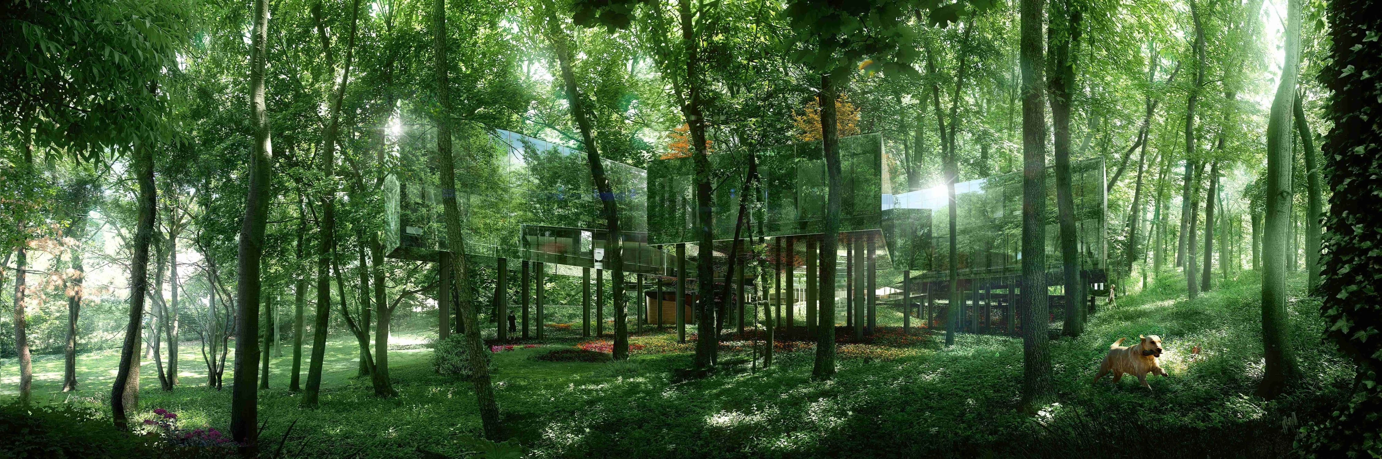 The residence’s exterior is wrapped in mirror glass such that upon approach, the building disappears into the site. The effect reduces the perception of the structure’s large mass, and by looking like it is not there at all, actually achieves the patriarch’s desire for a structure that “looks as if it has always been part of the site.”