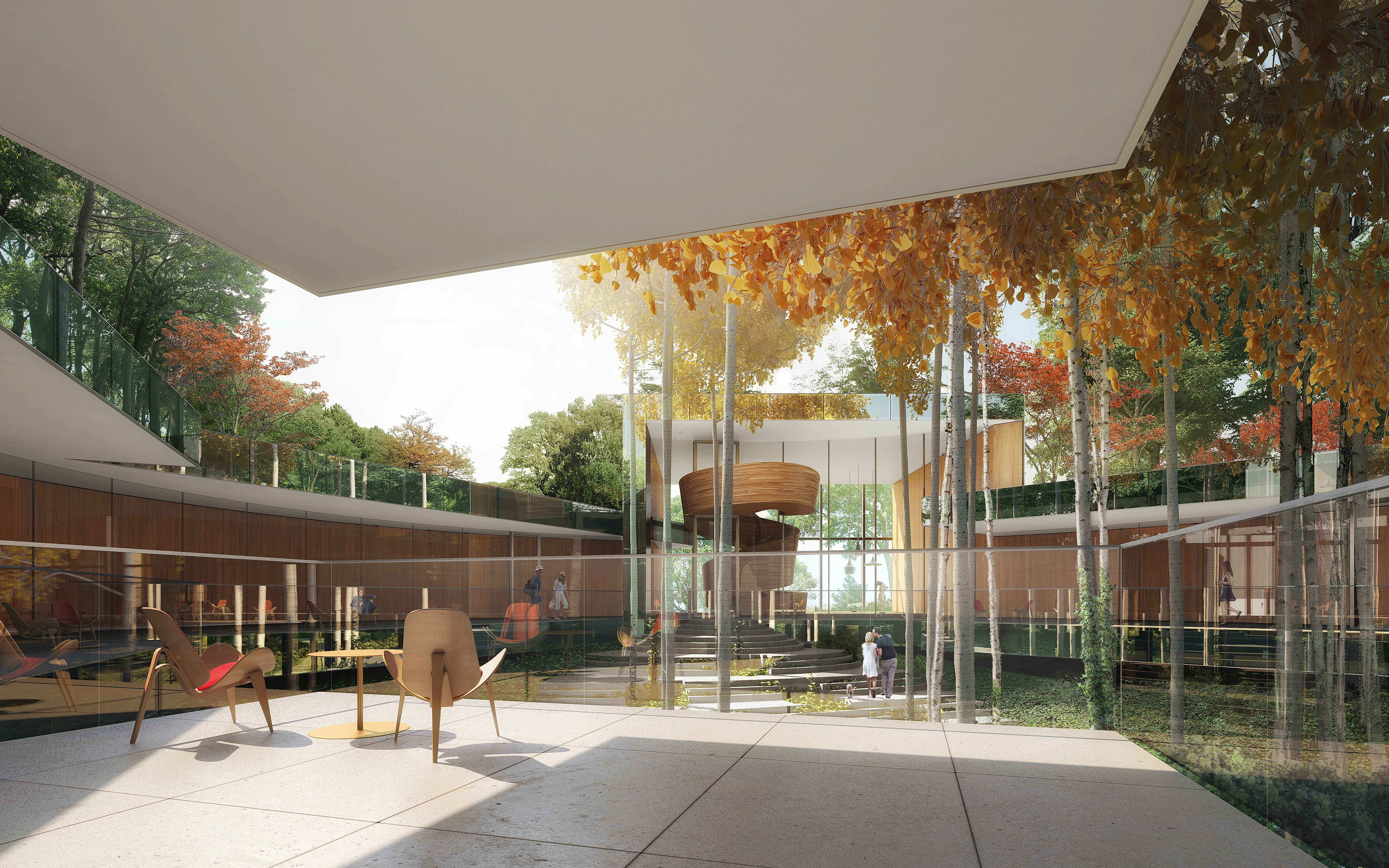 Driving under the residence’s elevated components, one enters the courtyard: a secret garden of Quaking Aspen surrounded by a ring of clear glass with a circular walkway behind, which ties this three-generational-family campus together visually.