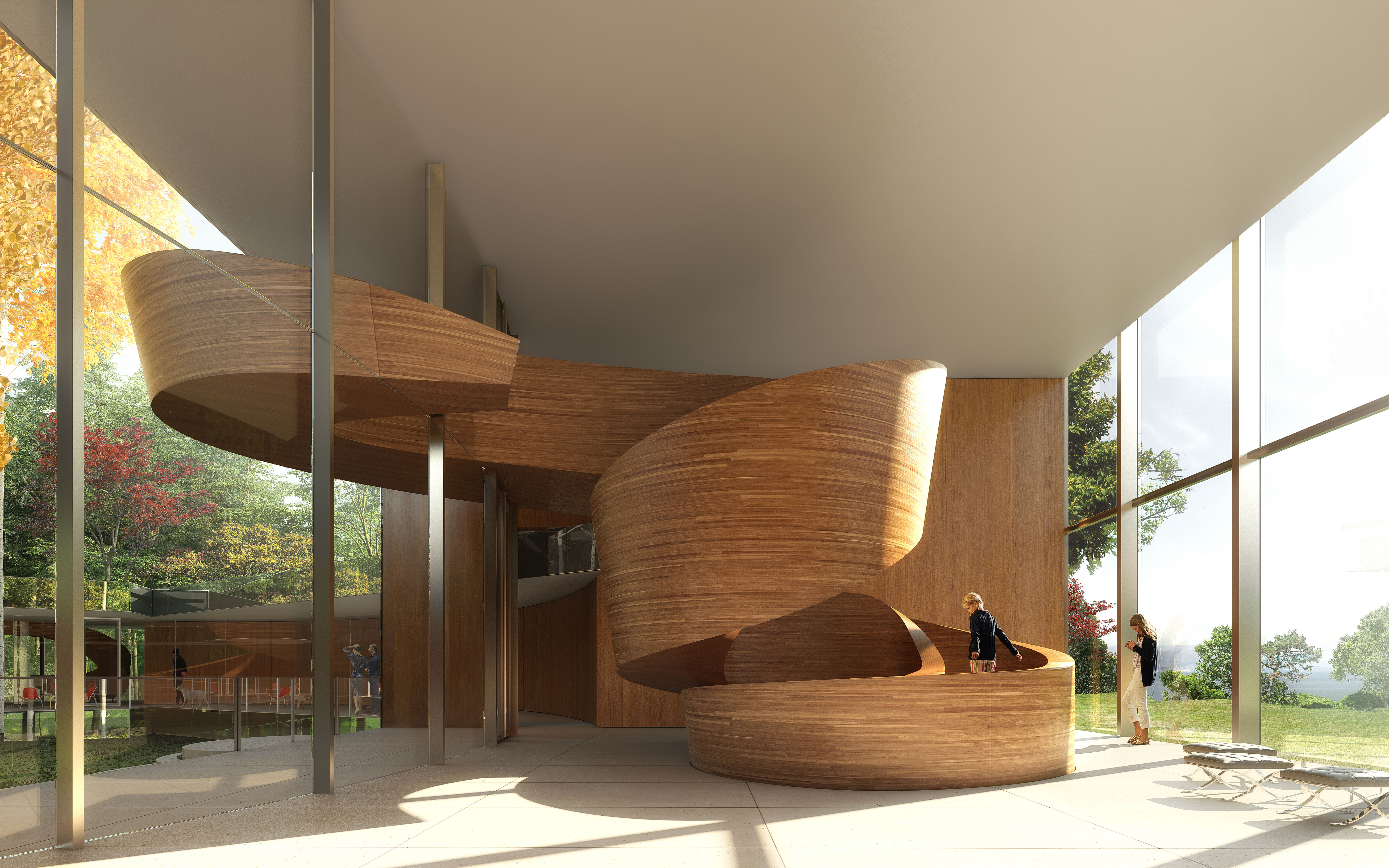 Overlooking the courtyard garden, the circular walkway is the physical connector for all the residence’s gems. It is lined by a simple cherrywood wall that morphs into functional yet playful, ribbon-like objects—as if sculpted or rolled by hand—within the Event Pavilion (seen above from across the courtyard) and Entertainment Pavillion. The wood wall is divided into full-height, pivoting panels that can open each home up, or close them off, when families want to engage each other or want privacy.