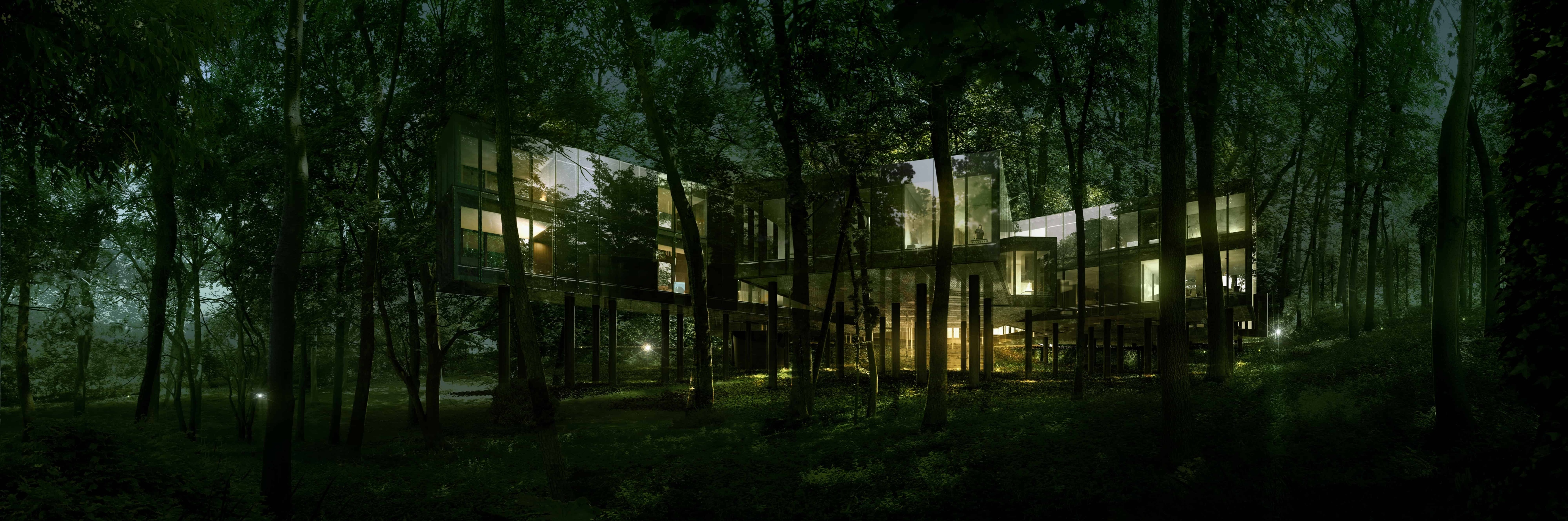 The Entertainment Pavilion’s object also extends below the house to form a stair—with an interior mud room—connecting to the forest.