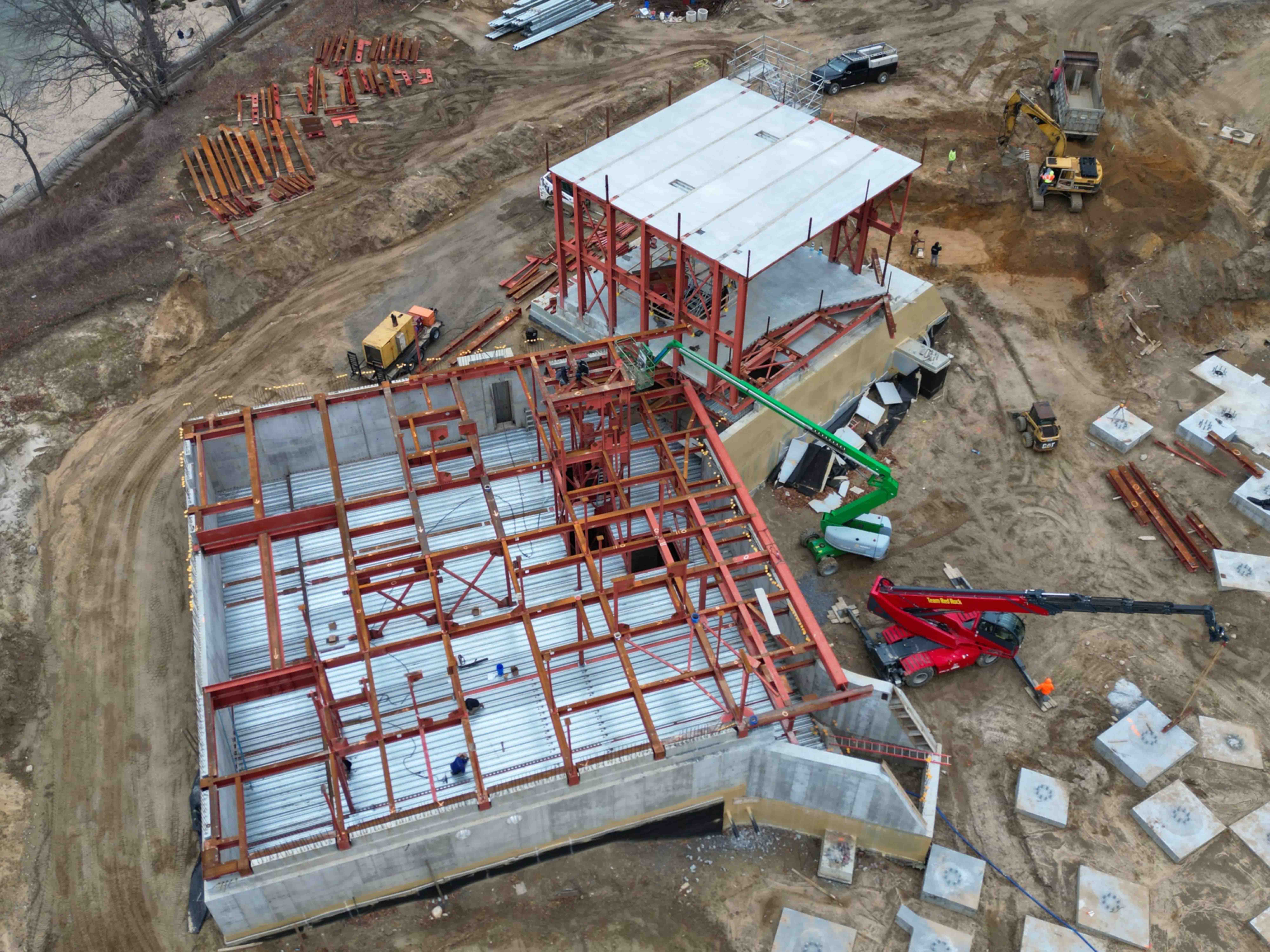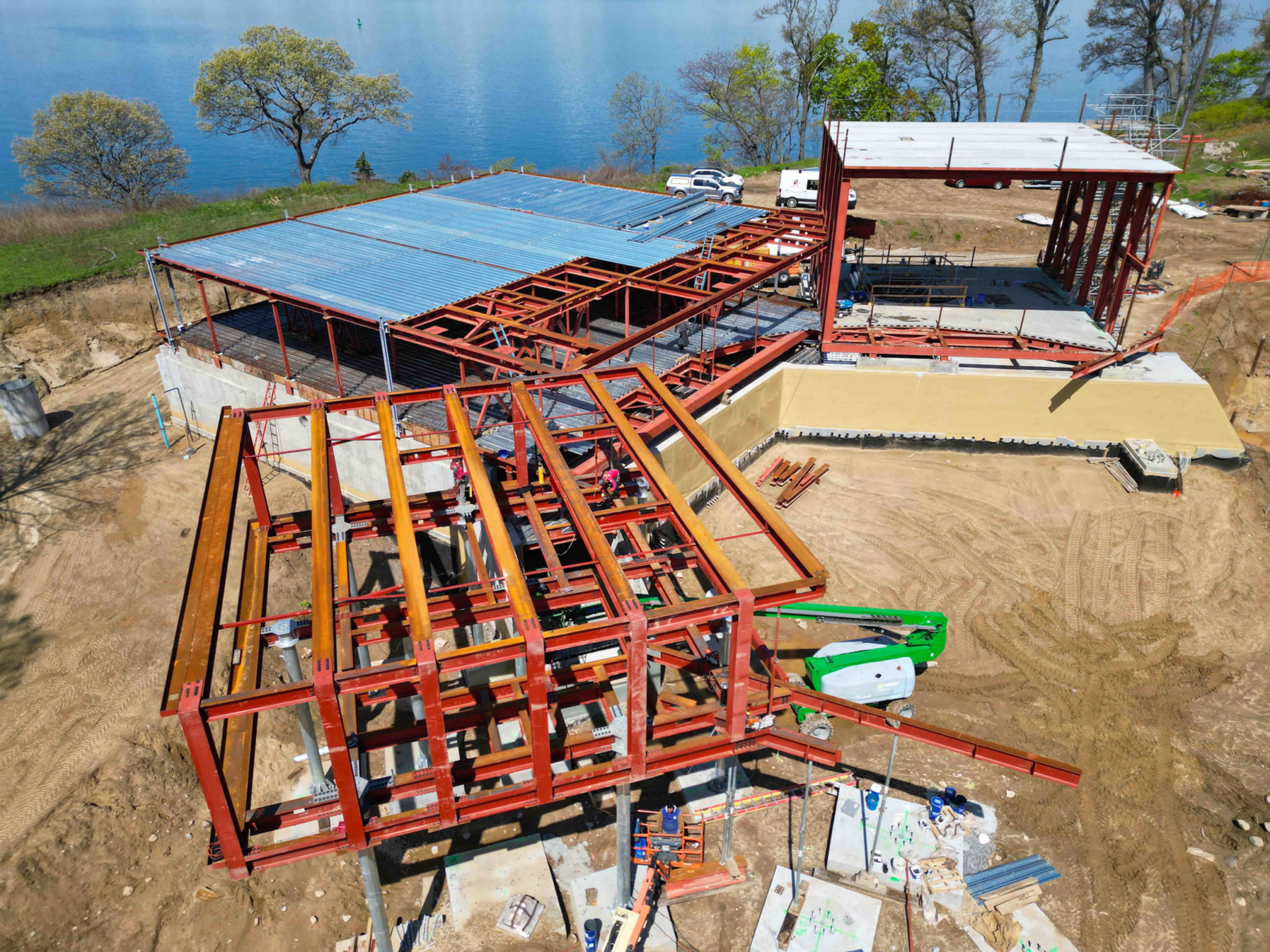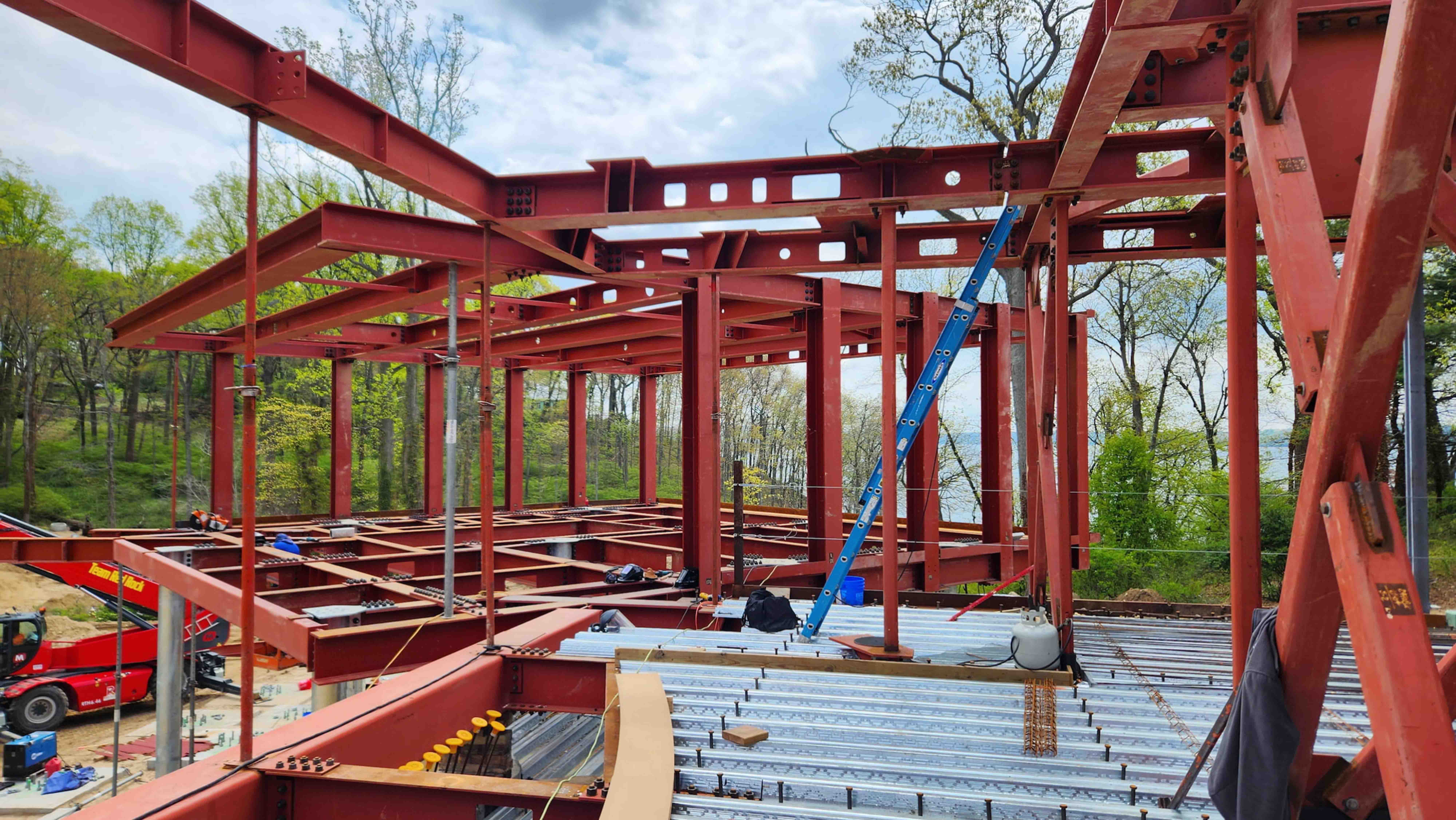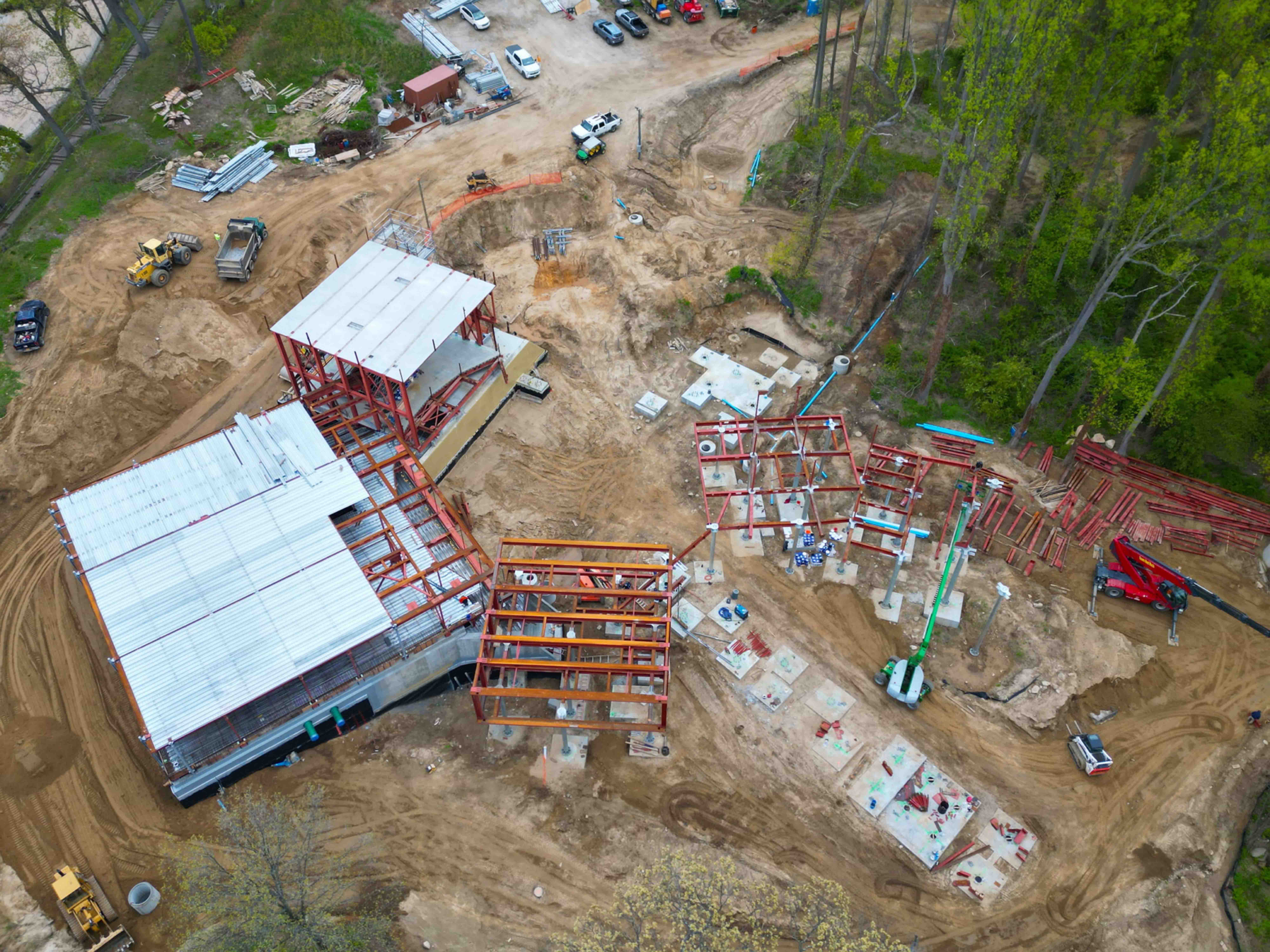 The primary steel structure is complete on the Event Space and nearly complete on the first home, March 2023