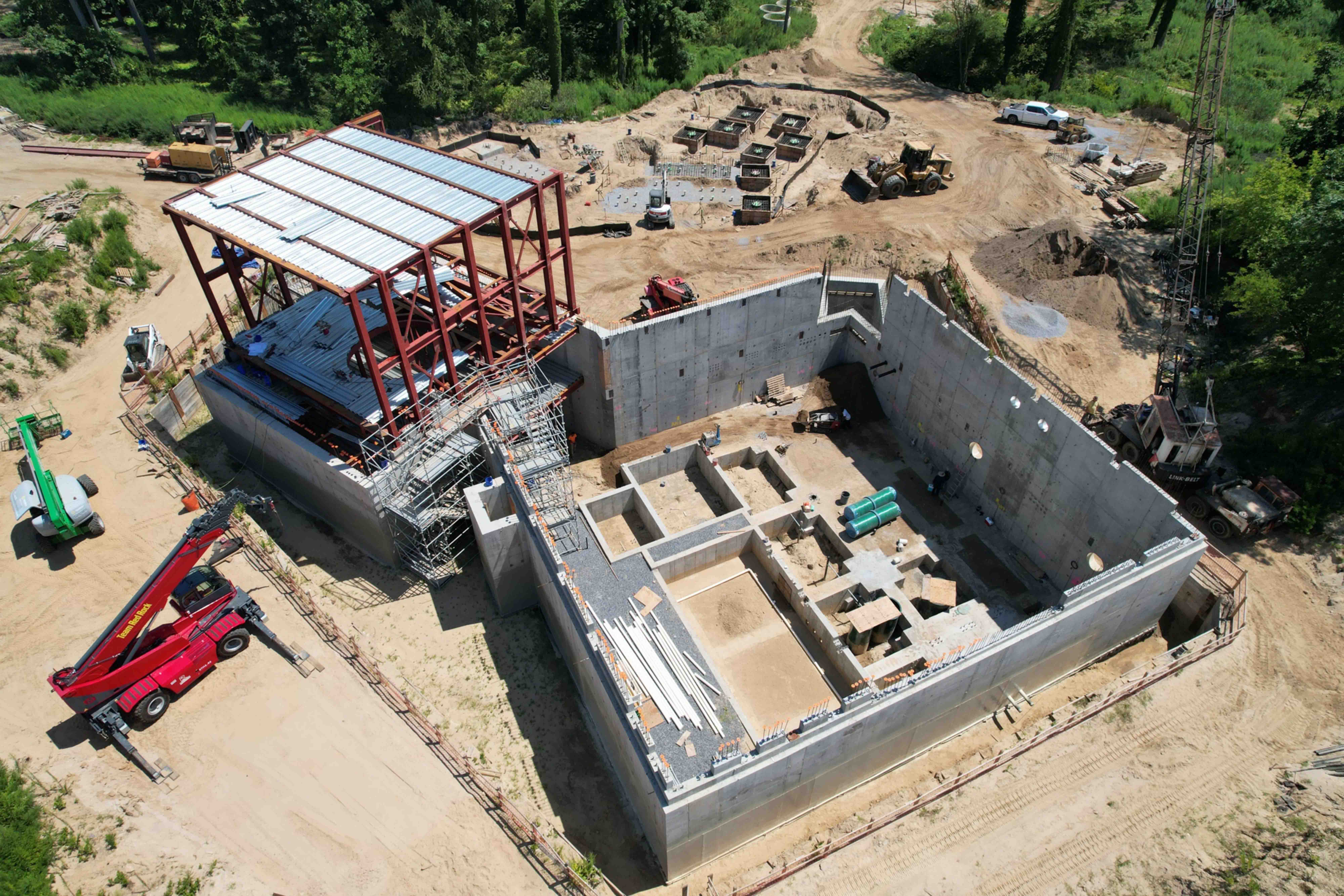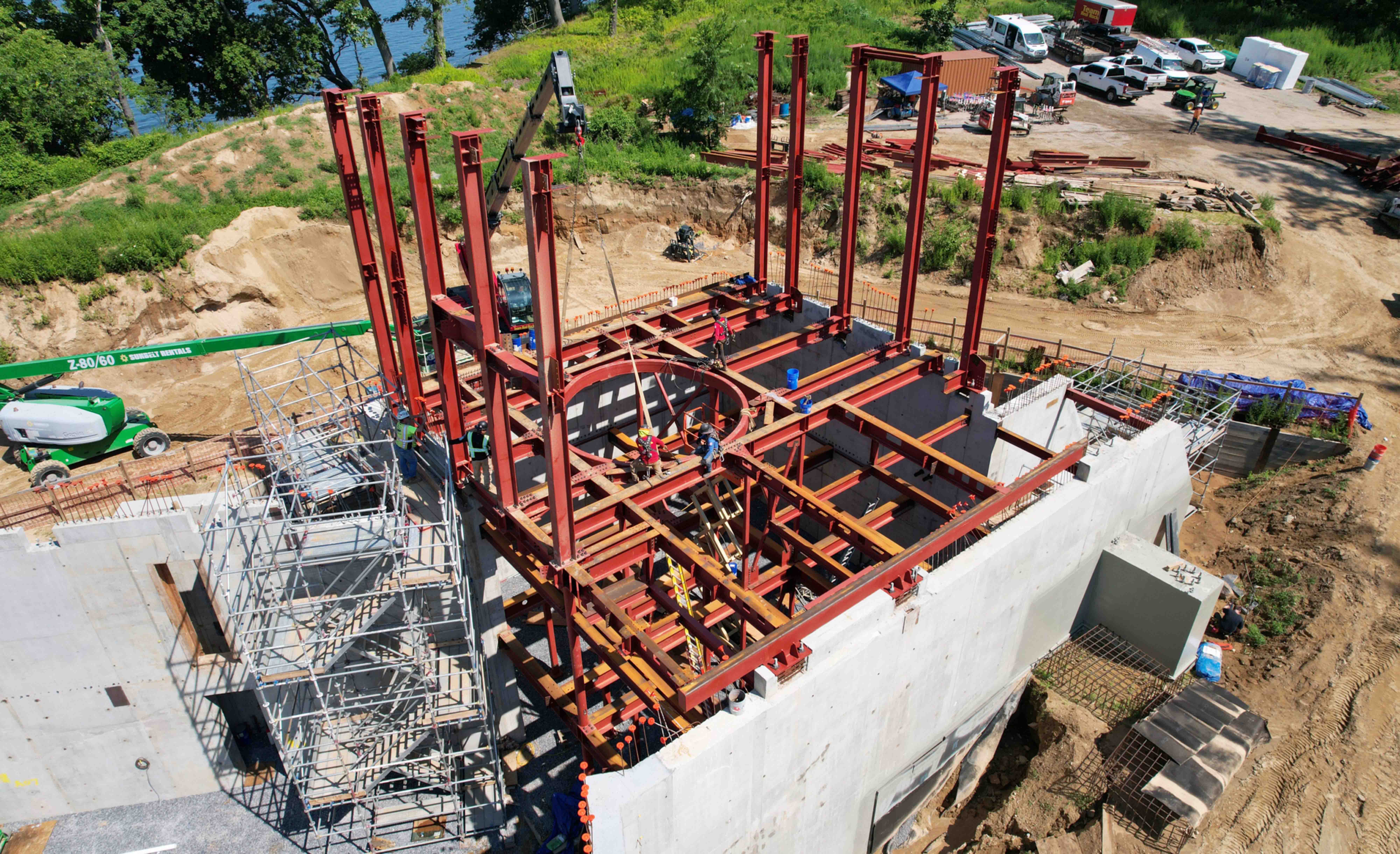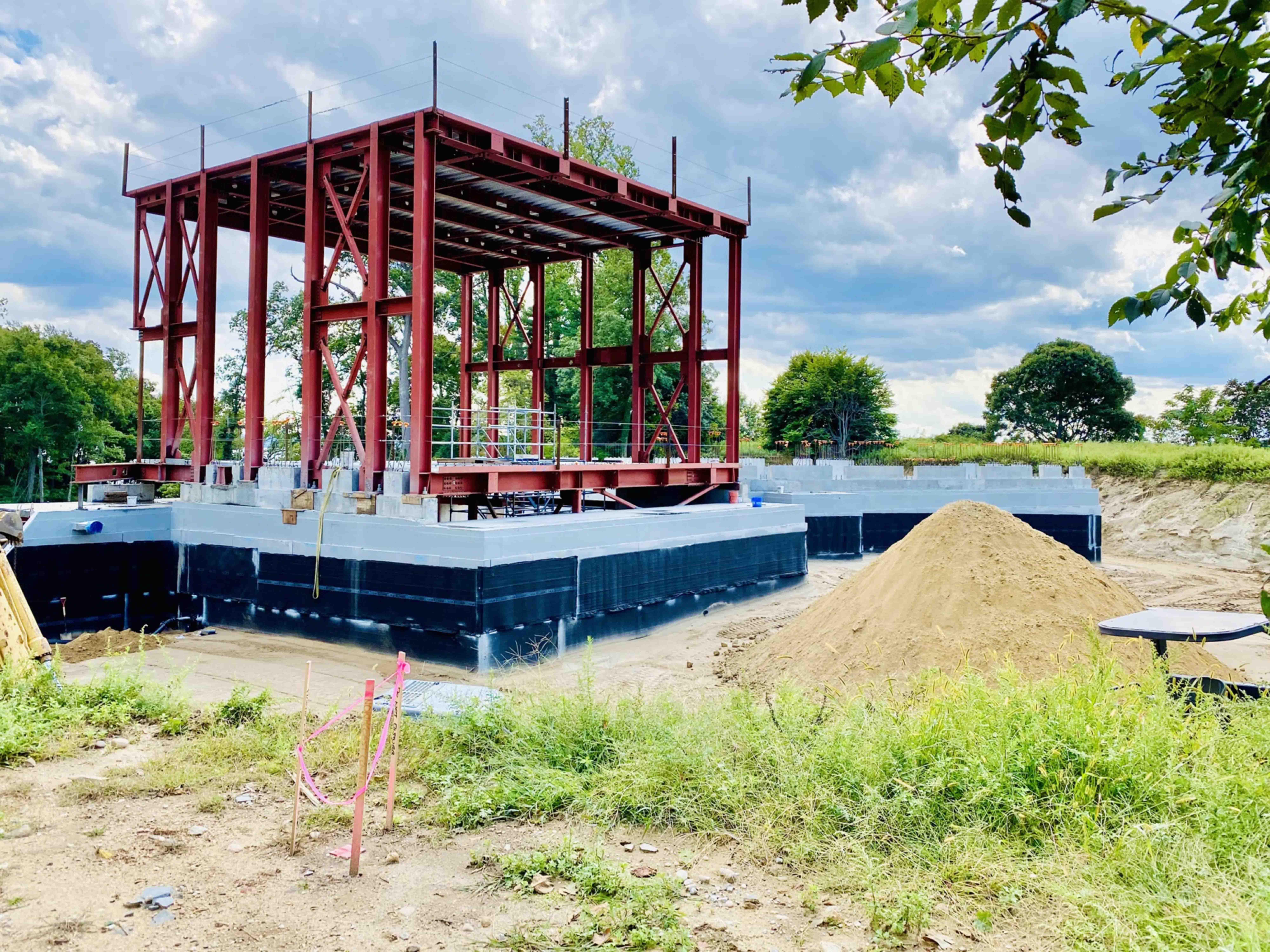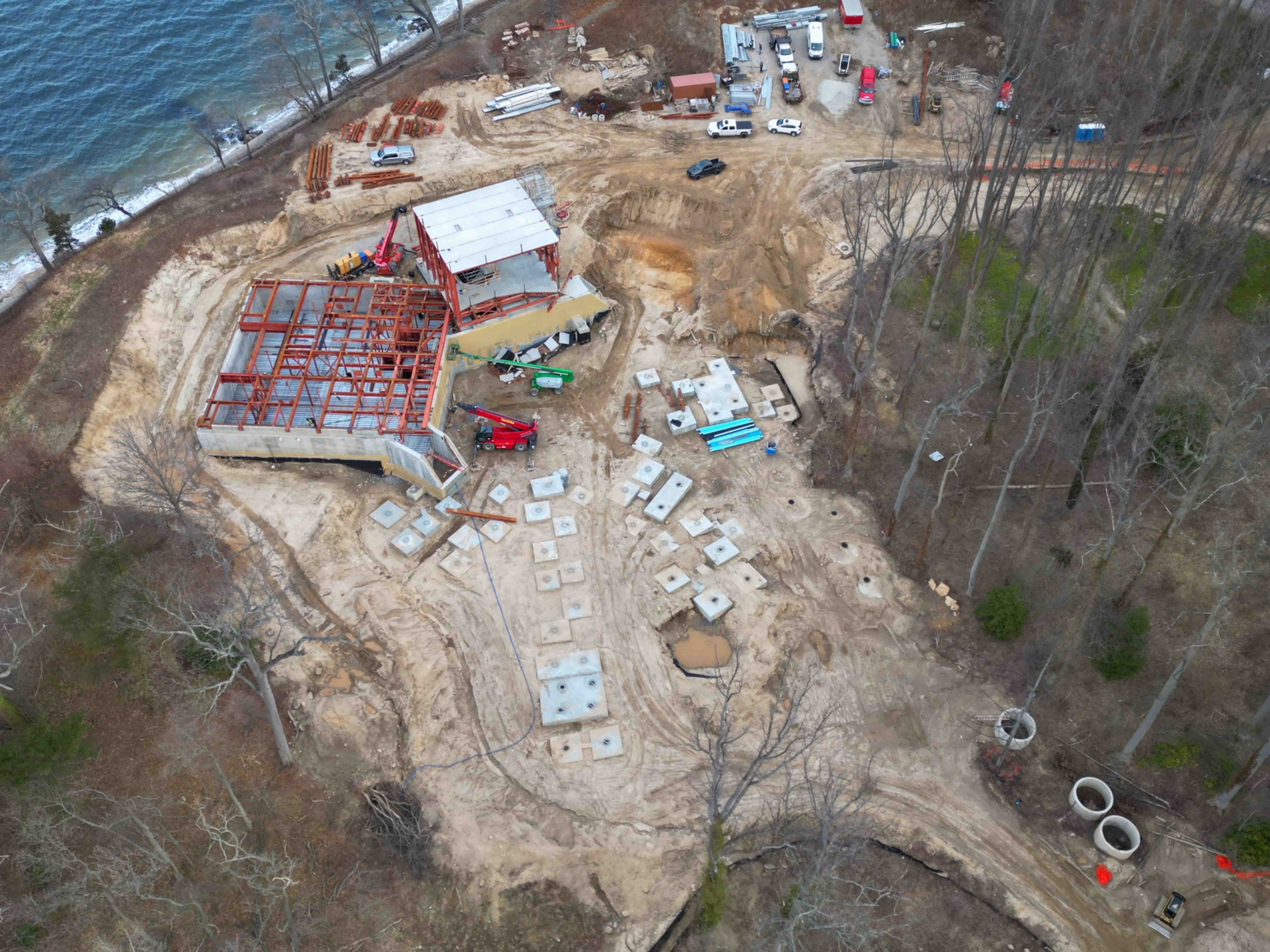 The primary steel structure is complete on the Event Space and nearly complete on the first home, March 2023