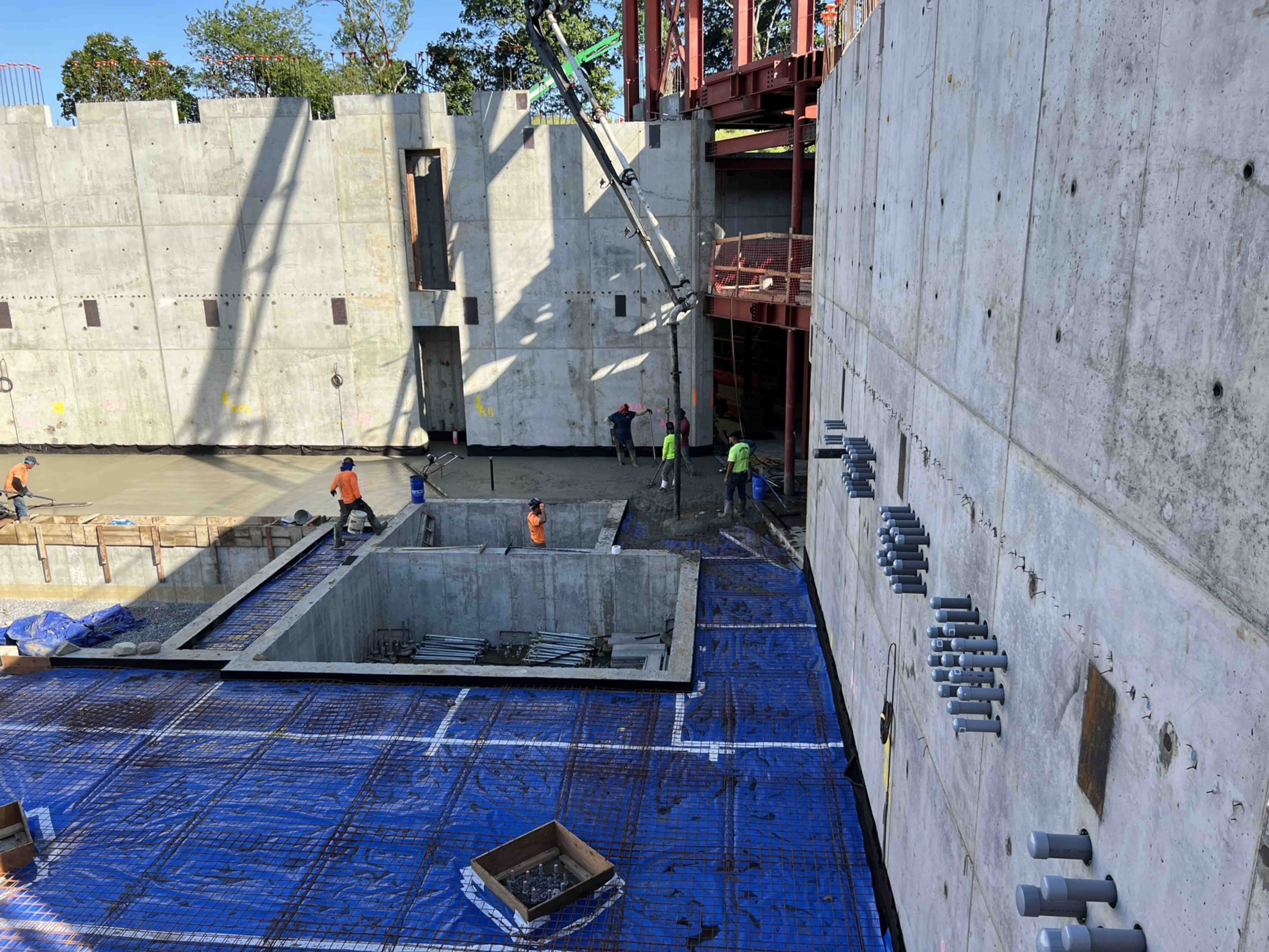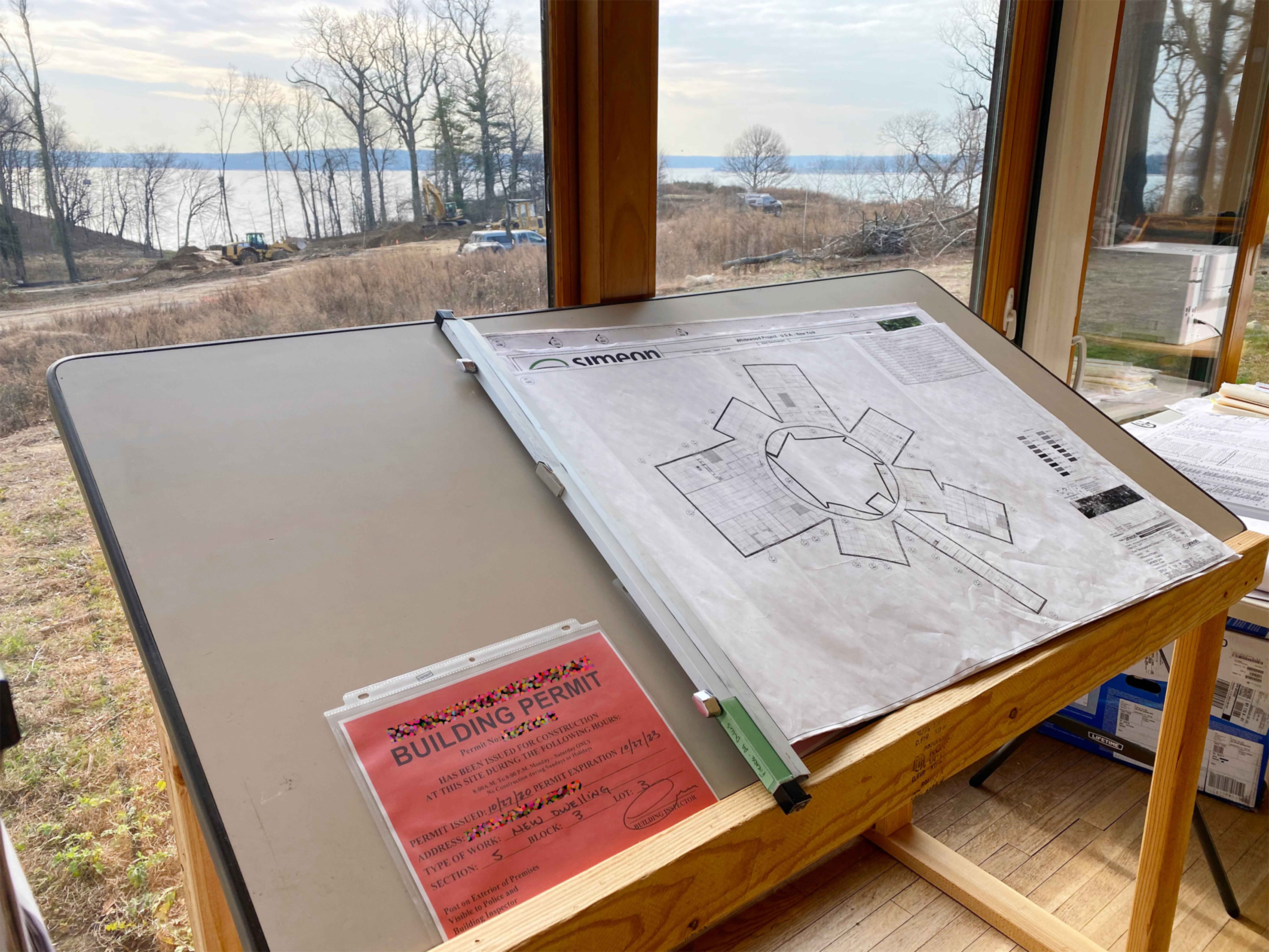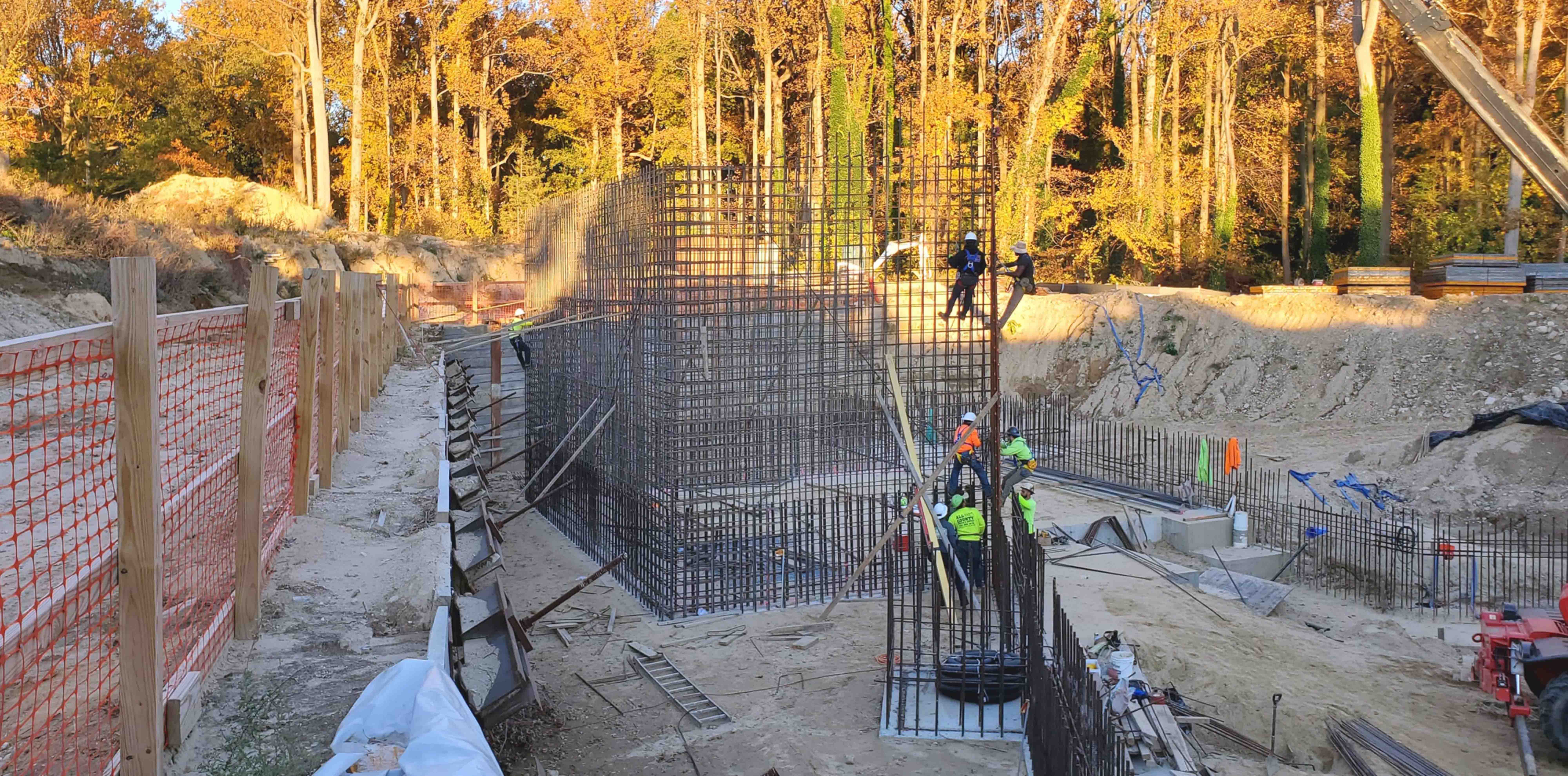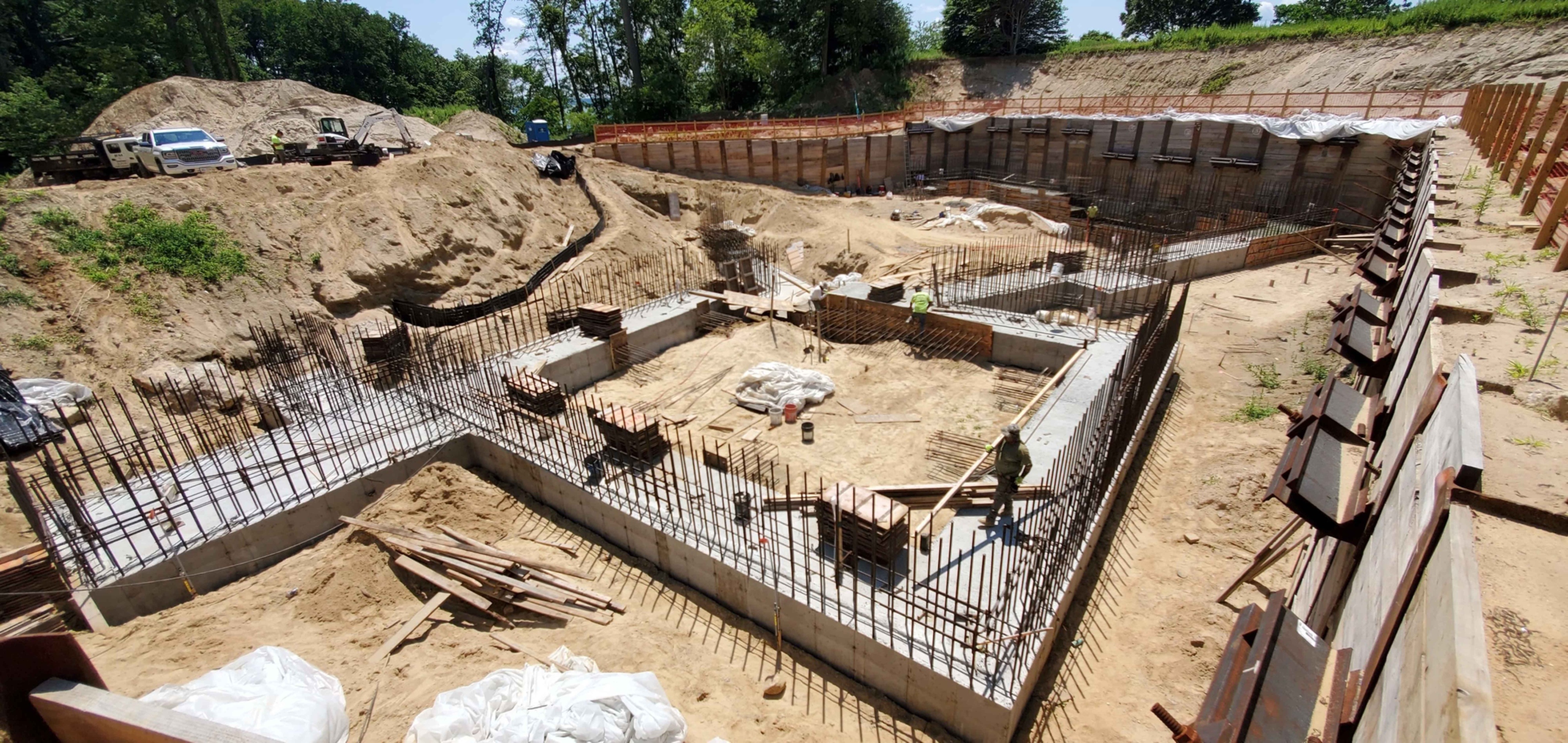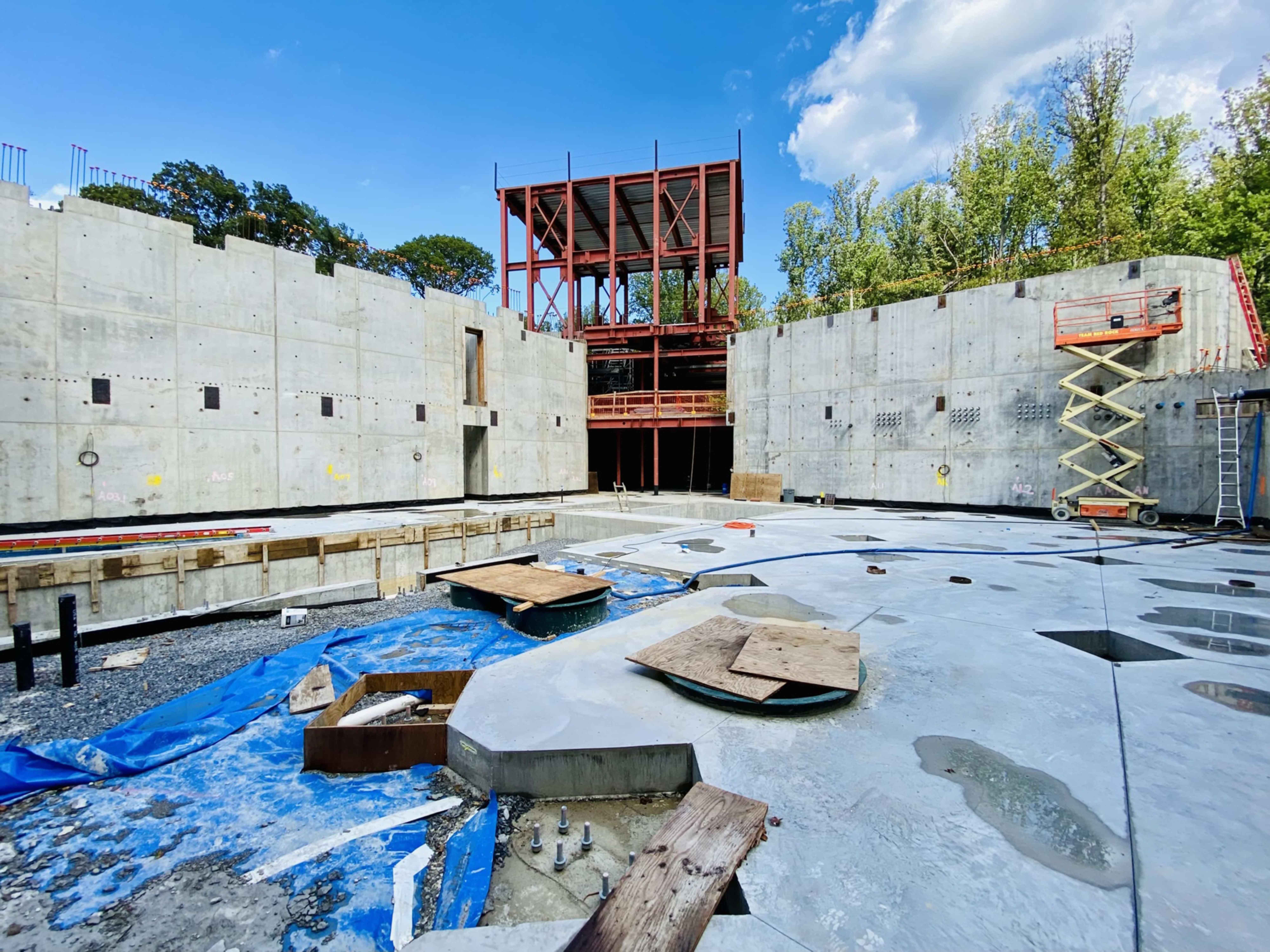 The primary steel structure is complete on the Event Space and nearly complete on the first home, March 2023