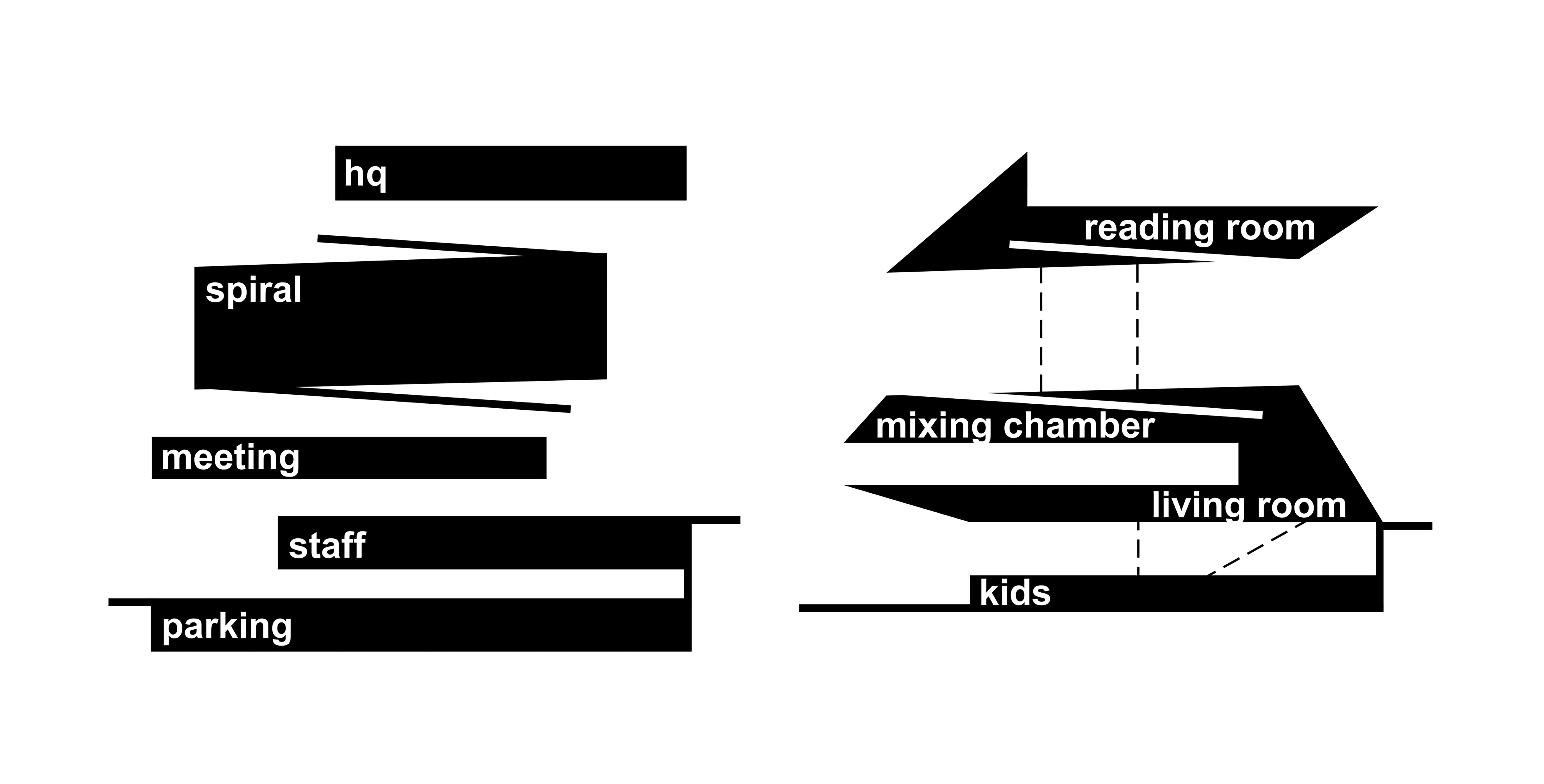 The problem of traditional library organization is flatness. Departments are organized according to floor plates. Each floor is discreet; the unpredictable fits of growth and contraction in certain sections are, theoretically, contained within a single floor.