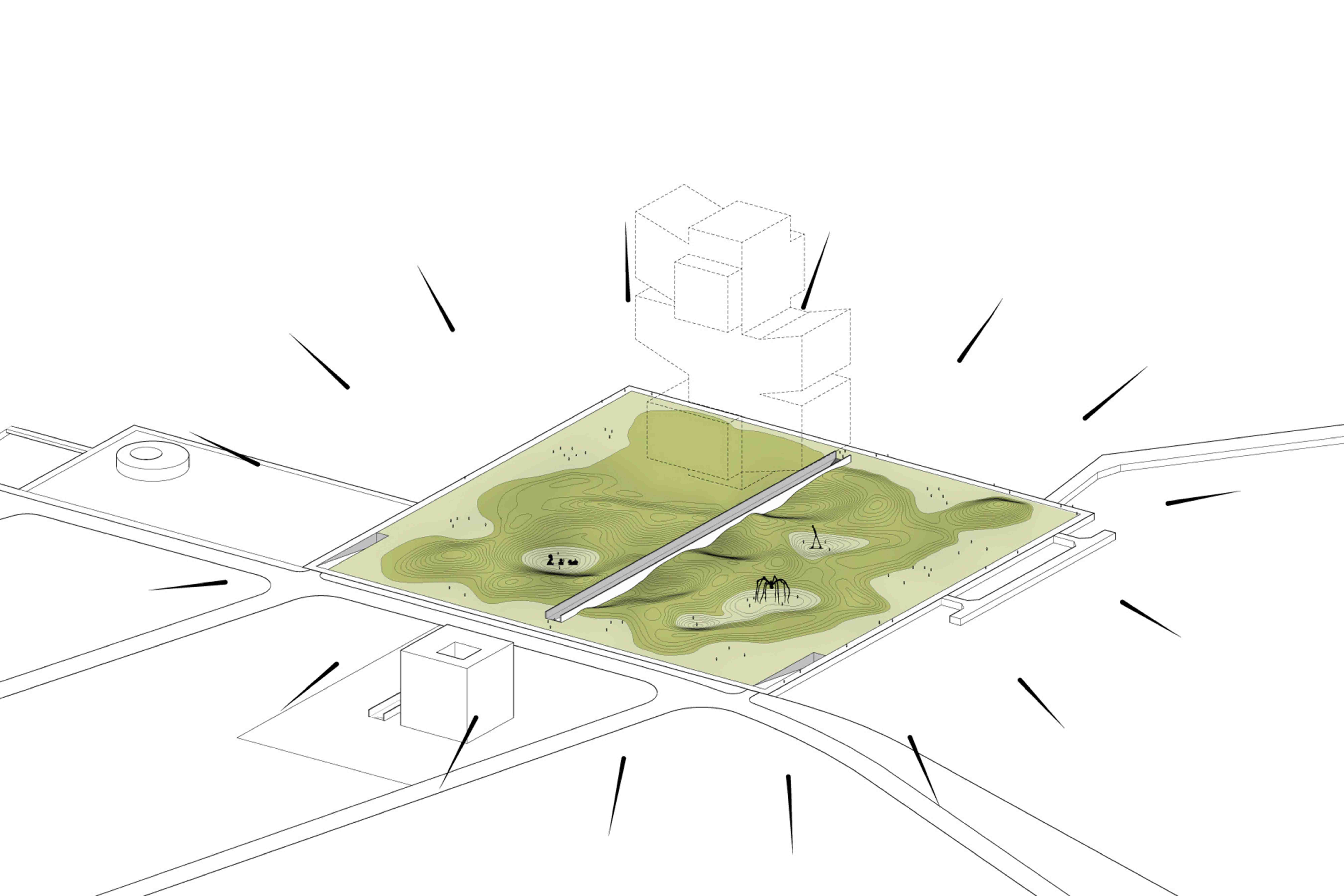 The Canvas can be mowed into different patterns for aesthetic pleasure or for varied uses: concerts, sculpture shows, festivals, or follies. The grasses quickly regrow to allow a new pattern to be mown. Gentle hills and valleys throughout the Canvas provide subtle cues for congregation and encourage the flowing movement of the grasses in the wind.