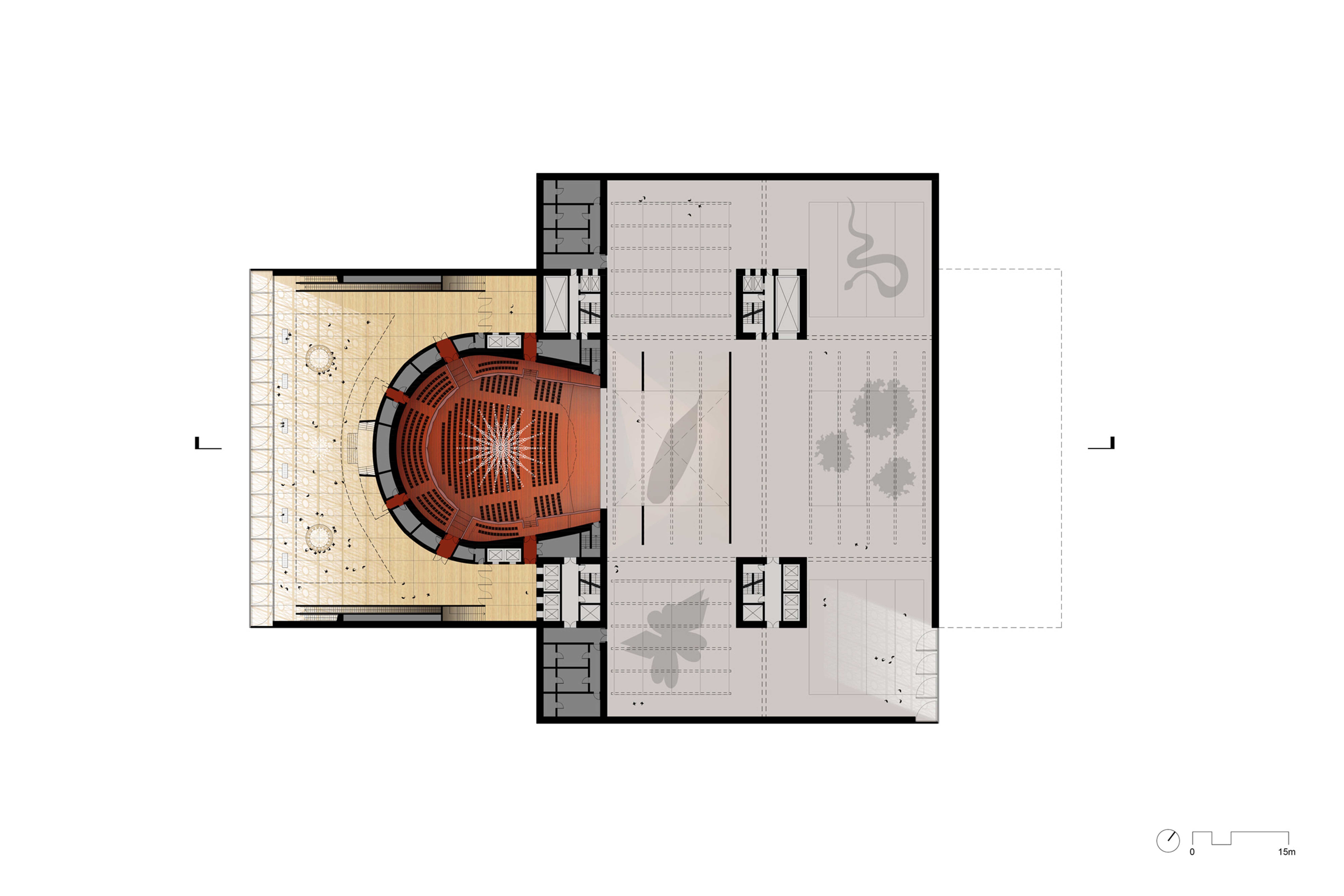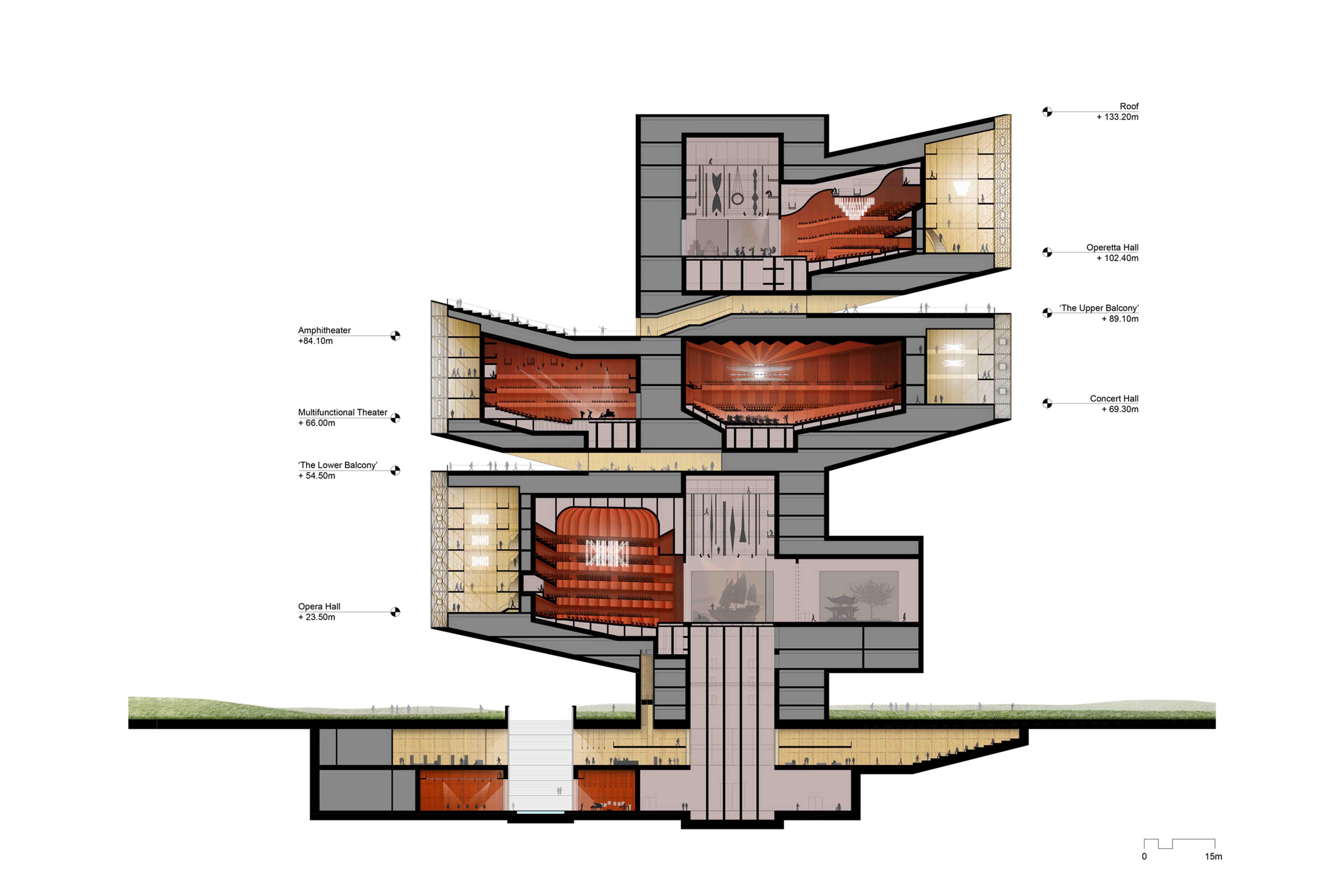 PROGRAM Performing arts complex (2,300-seat Opera Hall, 1,800-seat Concert Hall, 800-seat Operetta Hall, and 600-seat Multifunctional Theater); cultural center (Opera and Dance Literature Center, Stage Art Museum, Book Bar, and Public Hall); Urban Art Parlor; Opera Support Building; 1.7-hectare (4.1-acre) public park, and below-grade parking